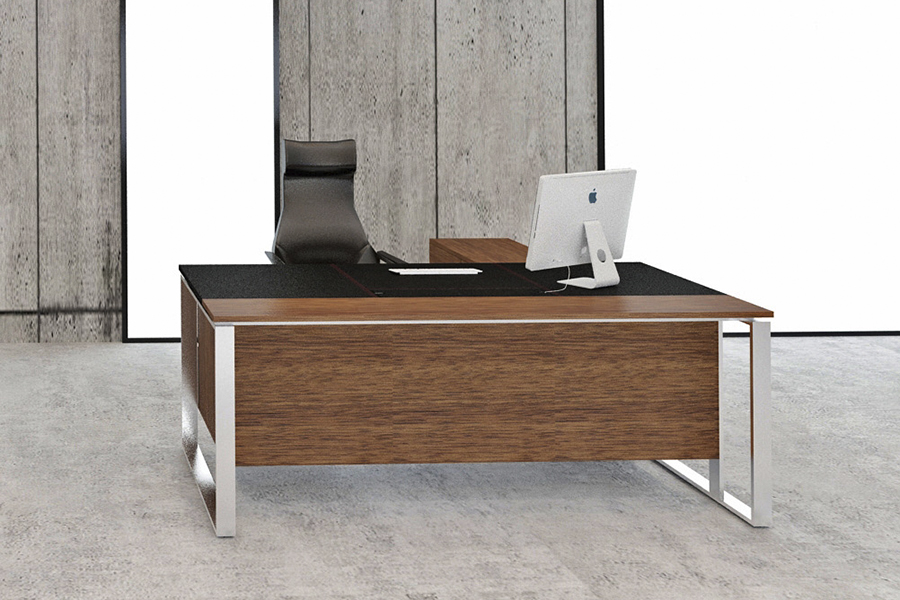 APOLLO以不銹鋼口字桌腳結合實木貼皮桌面,表現異材質的對比與和諧,桌板與桌腳以懸空方式設計,桌下抽屜櫃則懸浮於桌面下方,增添主管桌的輕盈質感,適合現代化的寬間風格。不鏽鋼桌腳表面採拉絲處理,桌板貼附黑色馬鞍皮,展現低調高級的質感。