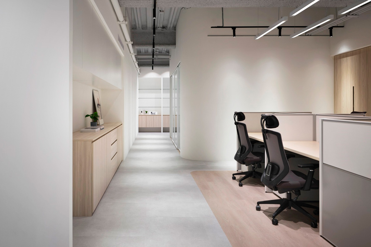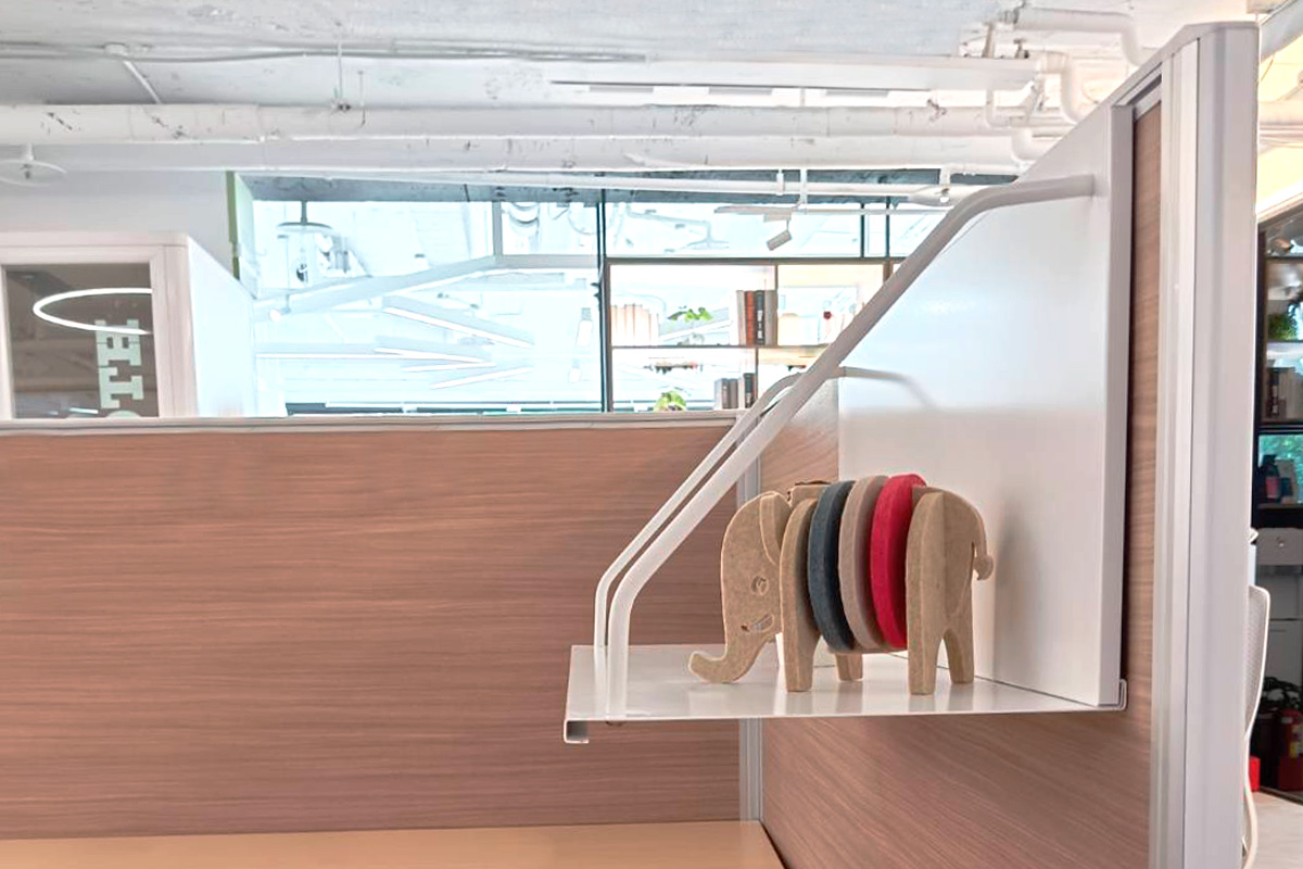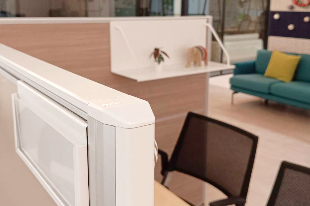 有別於傳統屏風,降低收邊柱上蓋與收邊上蓋的高度,整體變纖薄扁平、營造時尚感。
