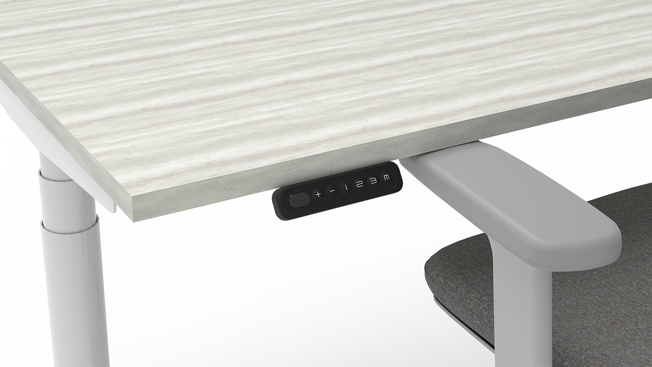The operating interface is angled upwards at 34°, with a silicone water-repellent panel, an LED screen displaying the height, and a three-stage height memory function, allowing for easy one-button positioning whether standing or sitting.