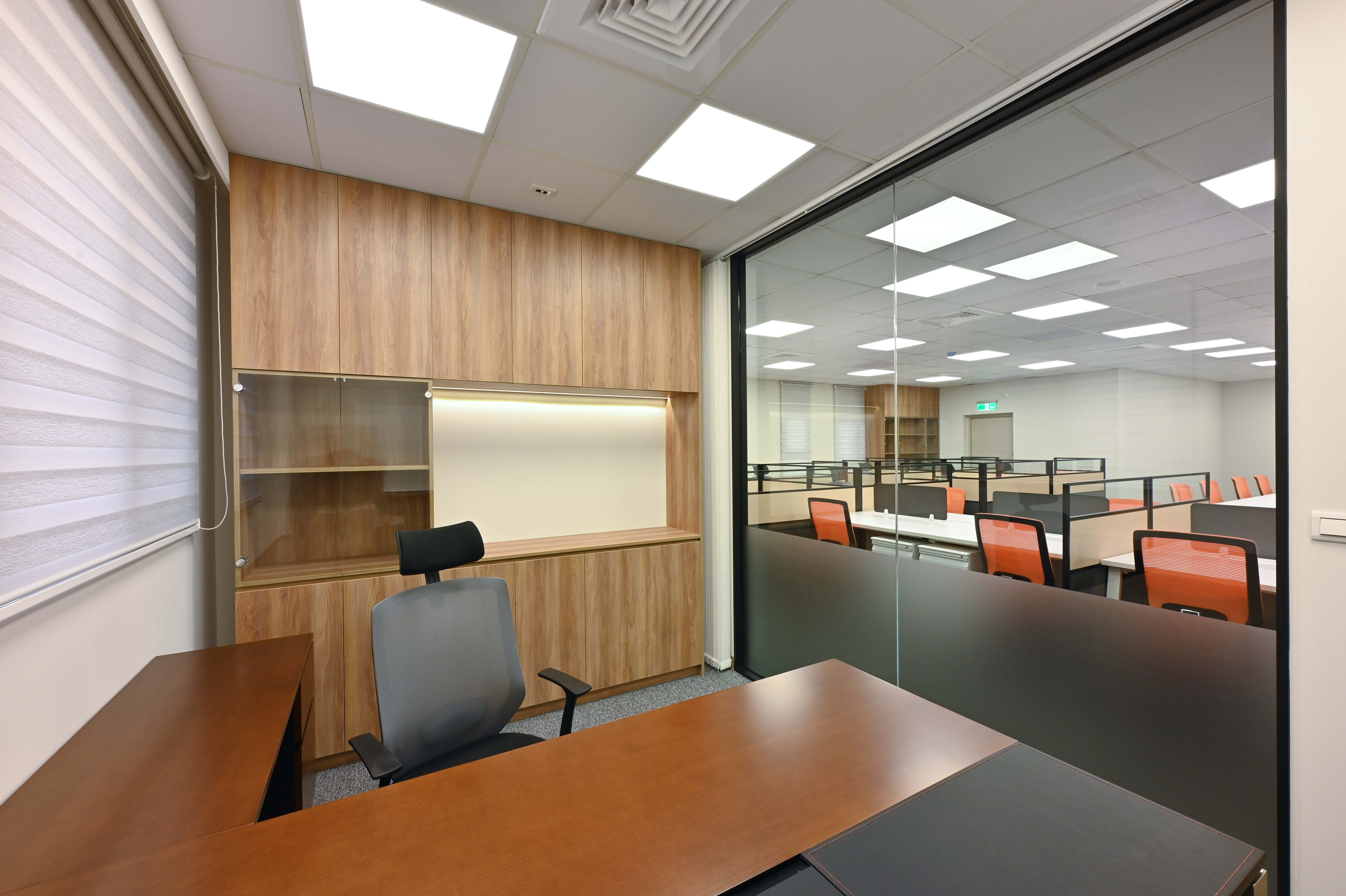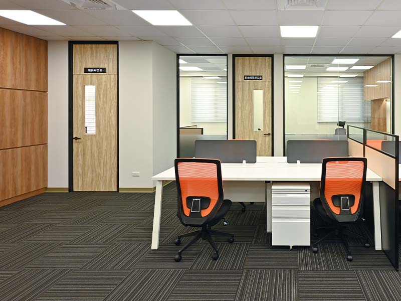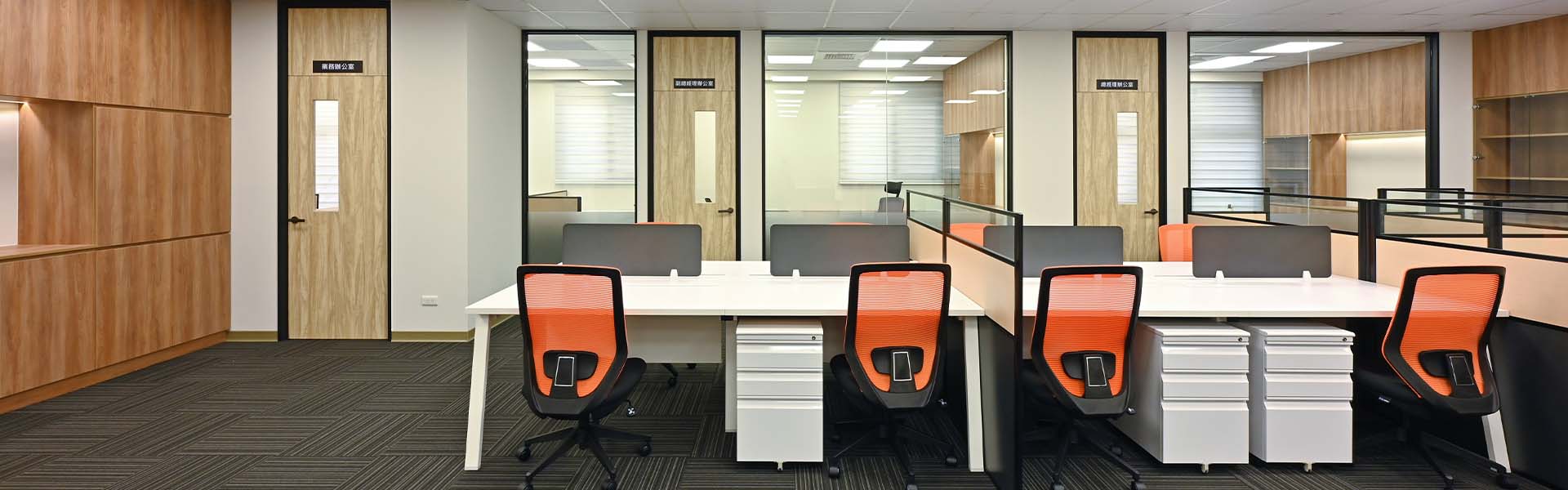 本案整場由歐銳室內設計規劃,整體空間採明亮、簡潔與工業風格,以紅色玻璃襯托企業的朝氣,展現業主經營理念;家具方面歐凌以3.2屏風工作站+