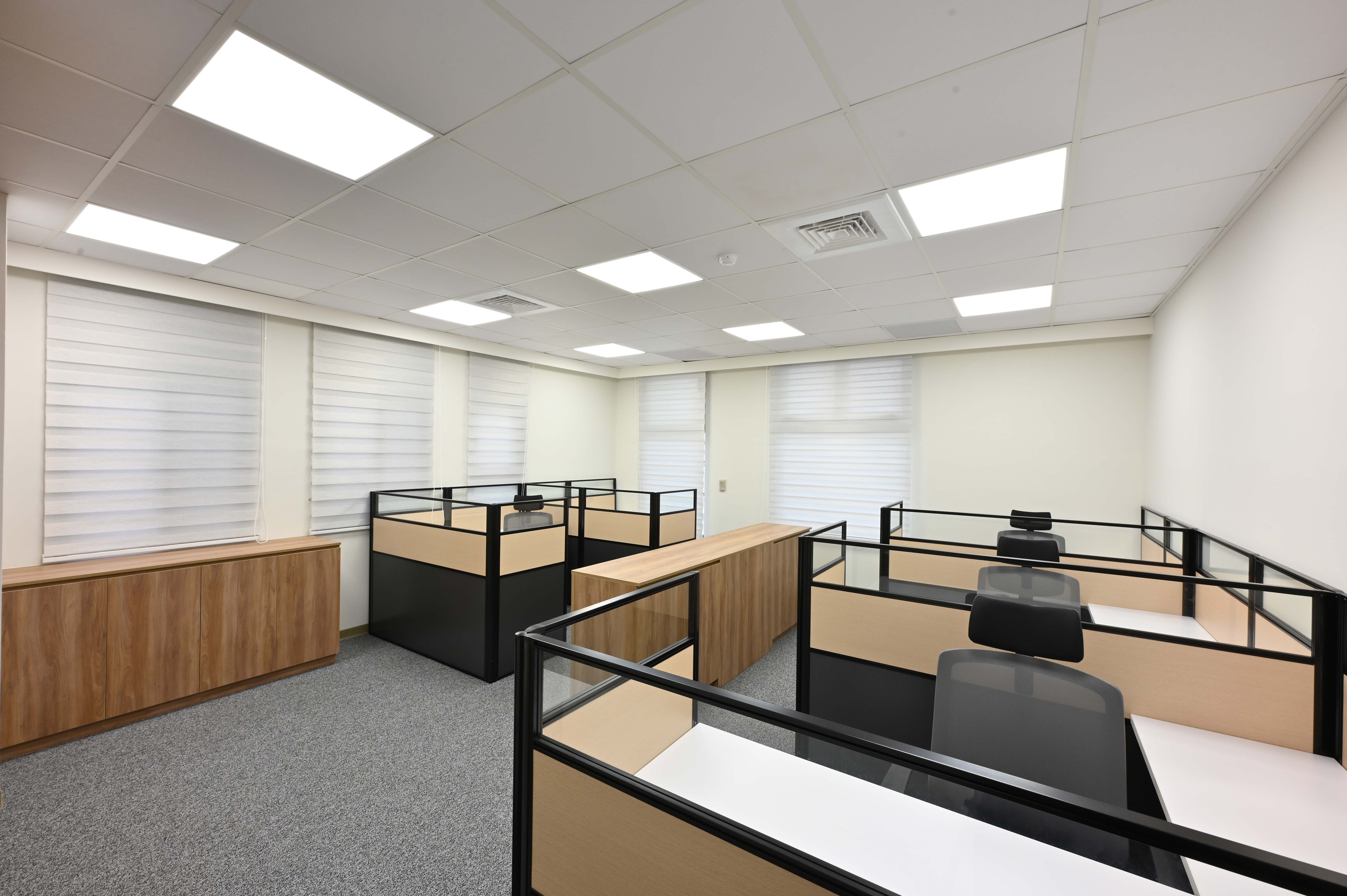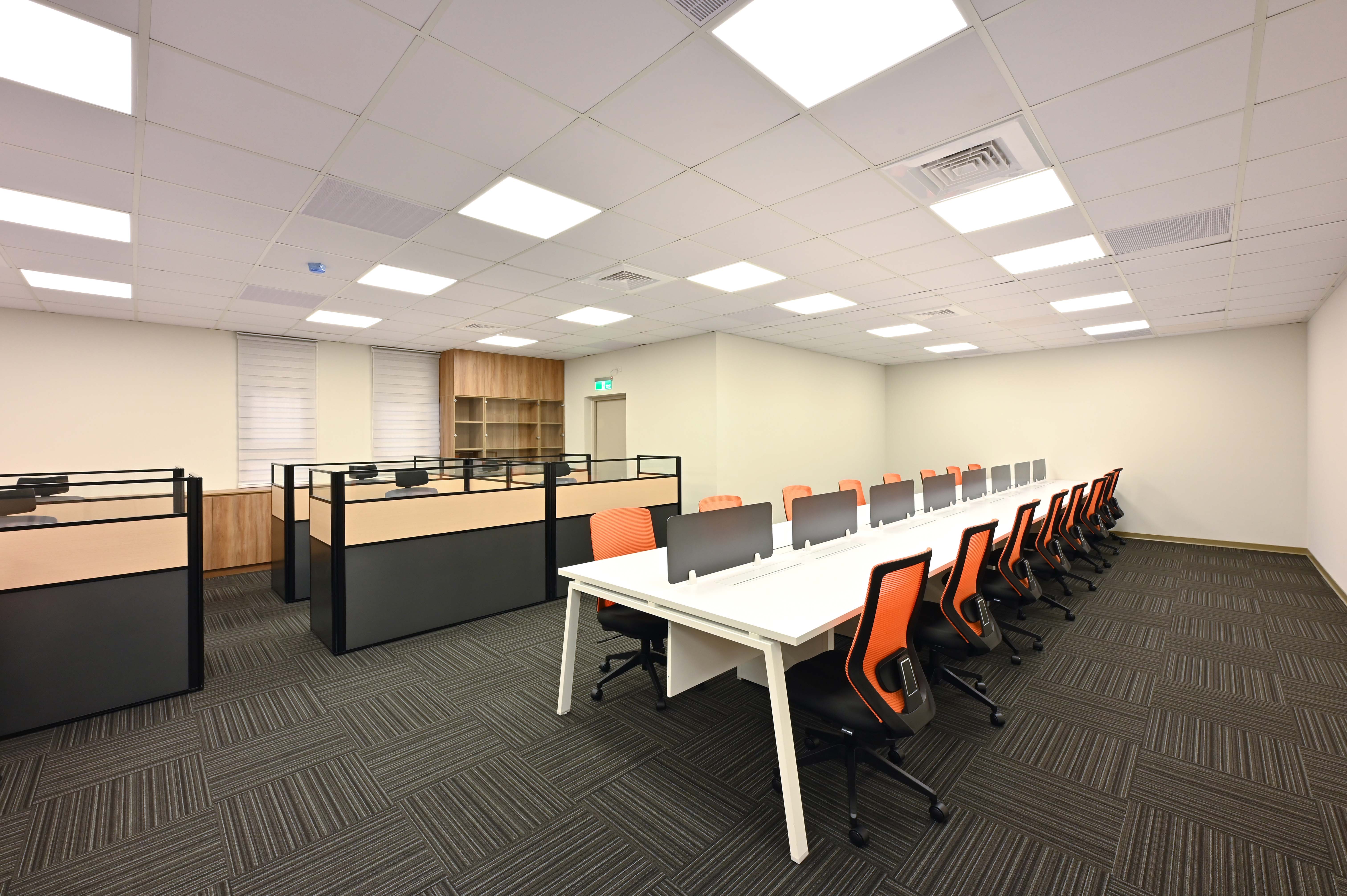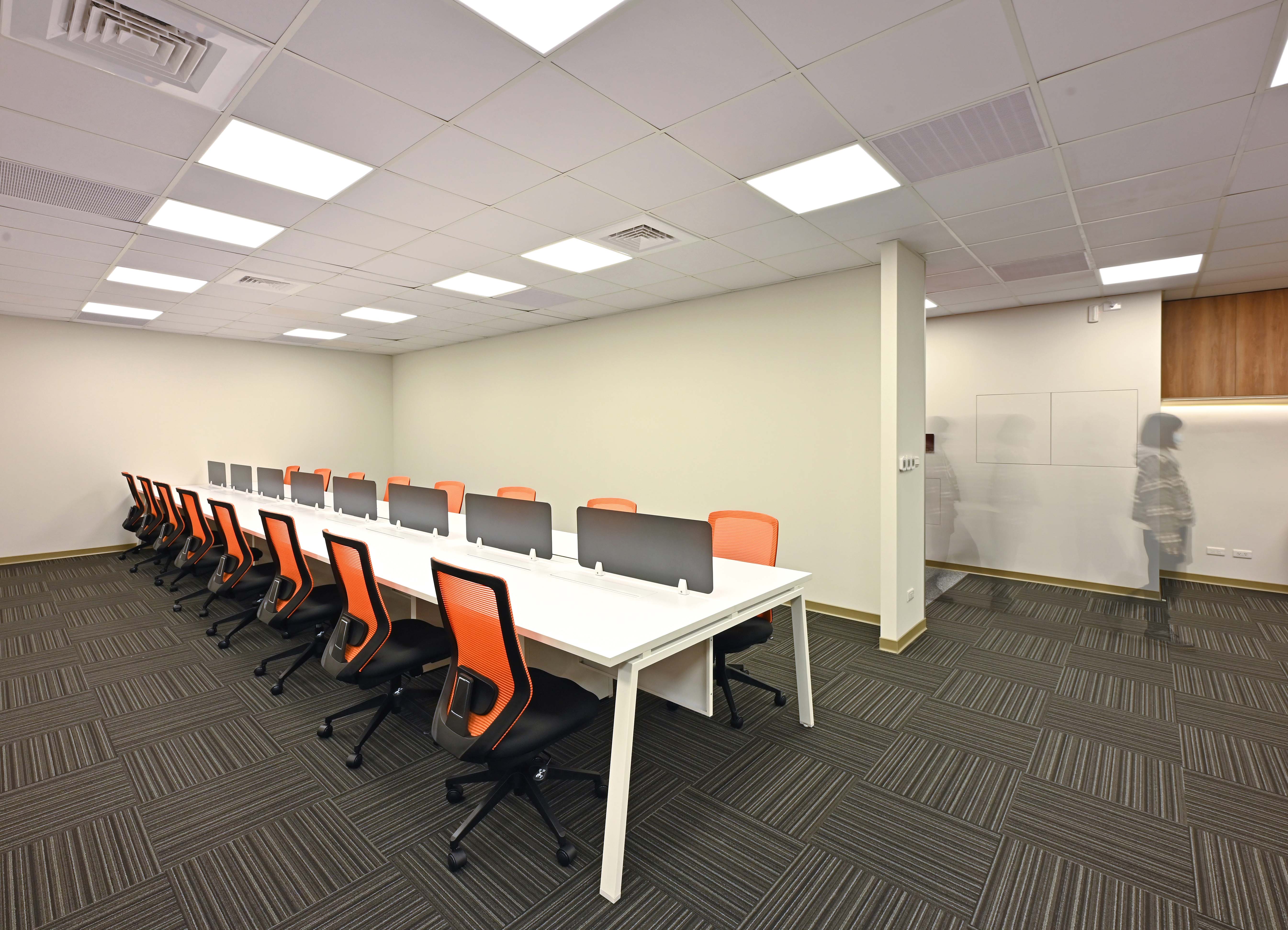 本案整場由歐銳室內設計規劃,整體空間採明亮、簡潔與工業風格,以紅色玻璃襯托企業的朝氣,展現業主經營理念;家具方面歐凌以3.2屏風工作站+