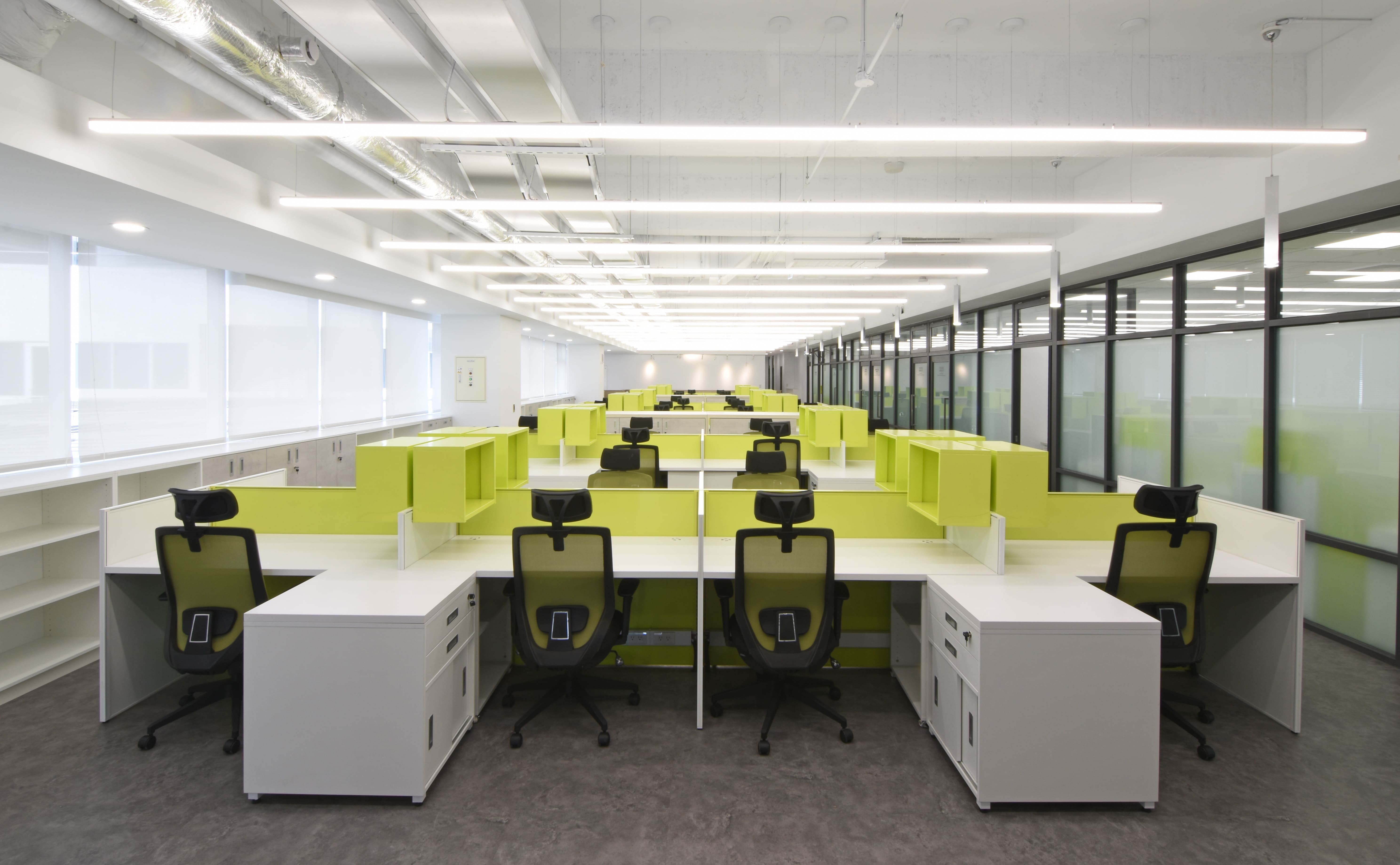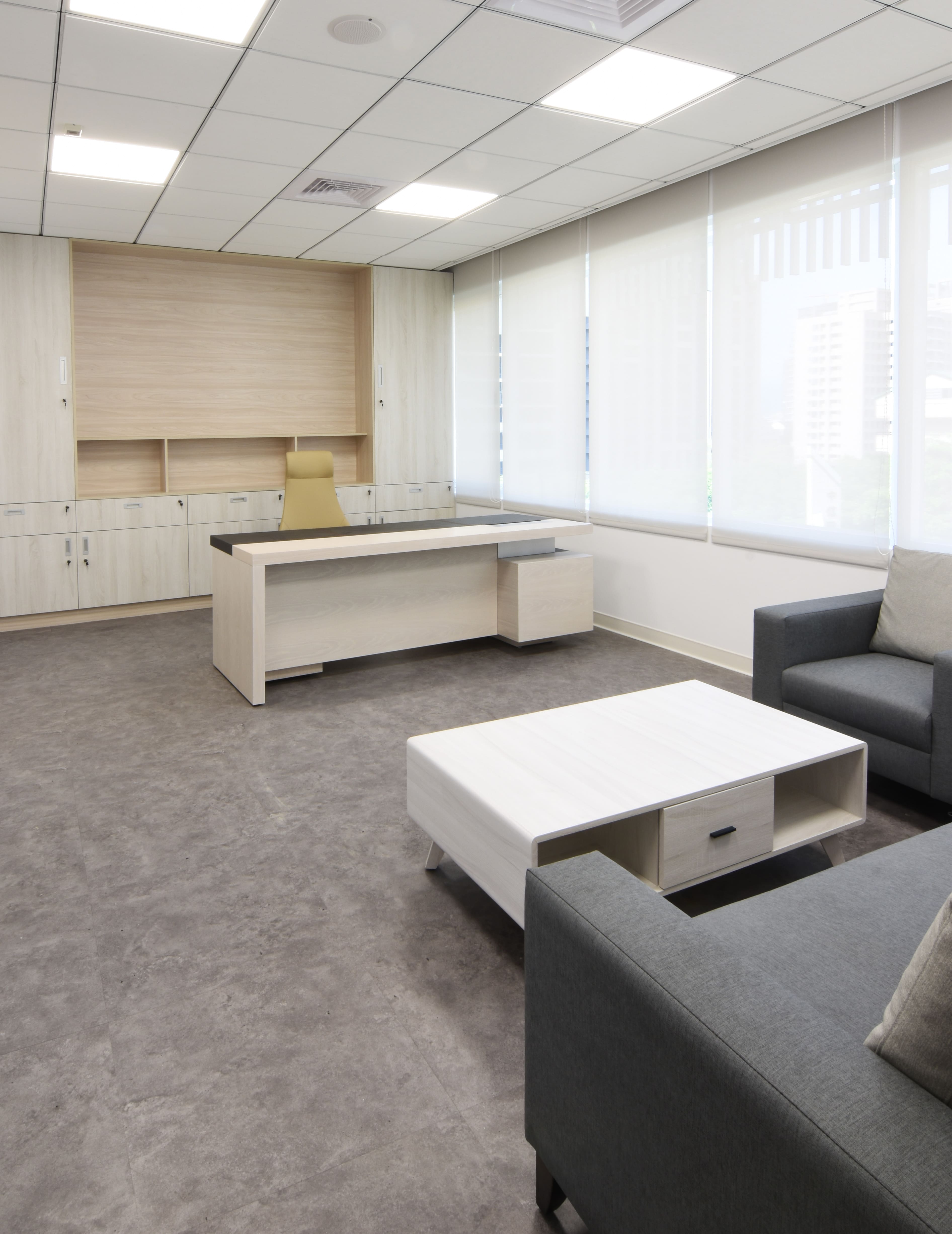 配合企業色打造客製化屏風工作站系統,另外搭配客製化吊櫃除了靈活運用辦公場域,更增加單位收納空間。以白色為主調,企業色及木紋色為輔,營造寬敞明亮的辦公氛圍。主管辦公室配置白木紋色的