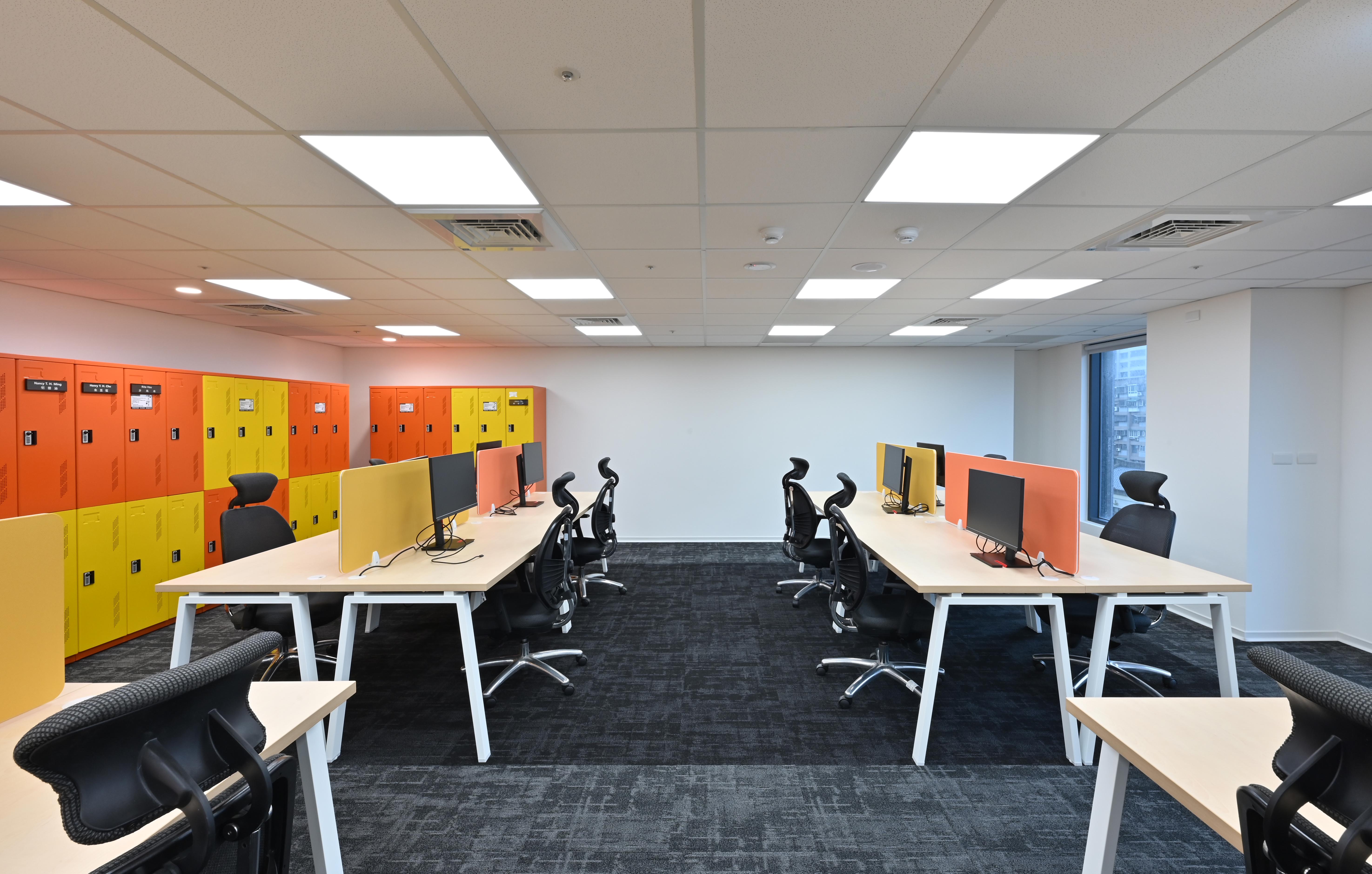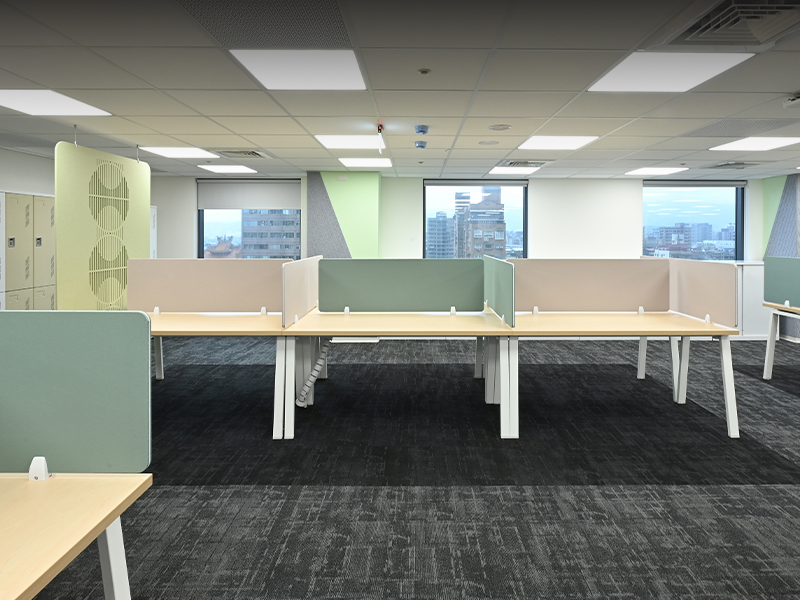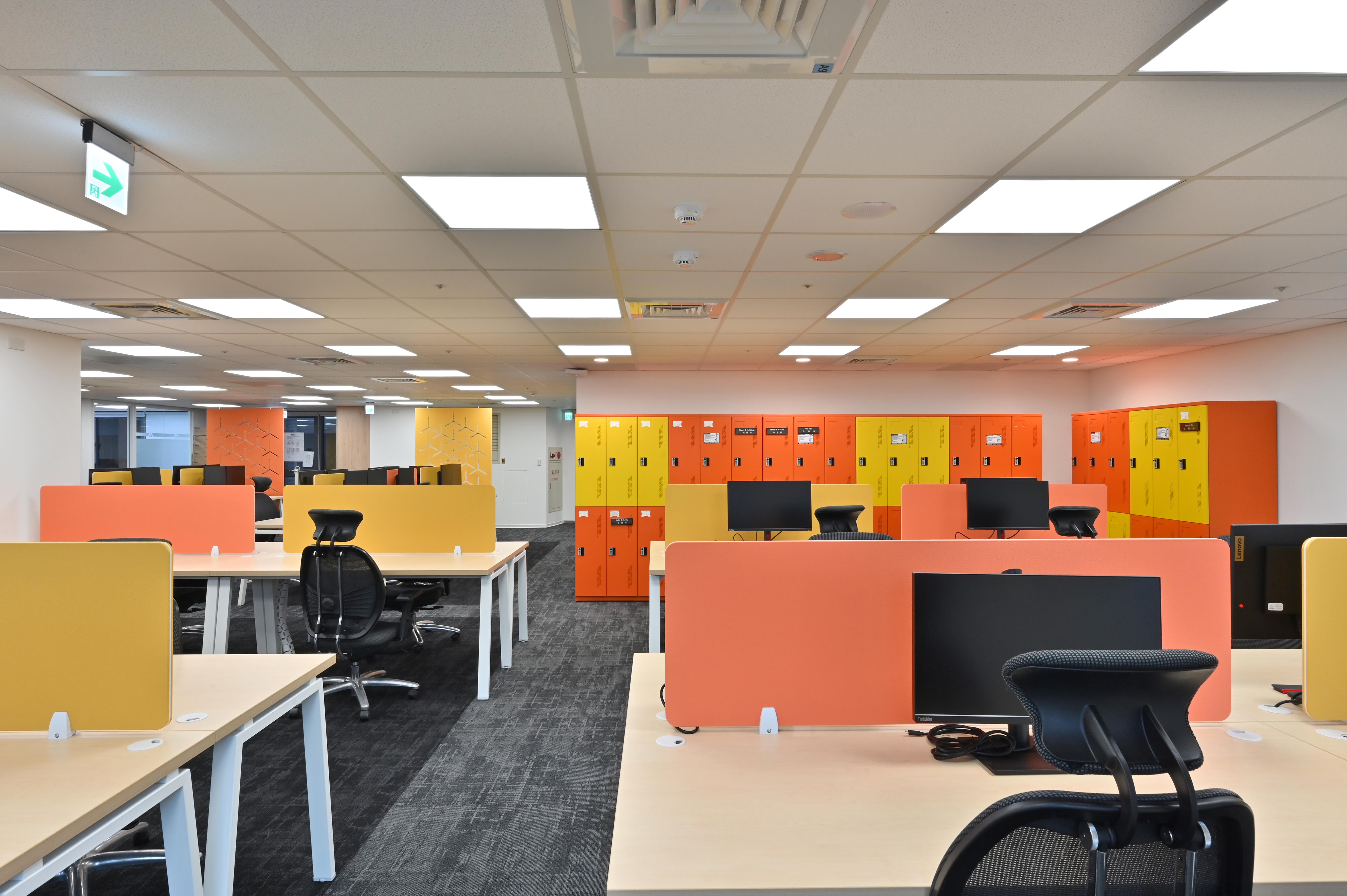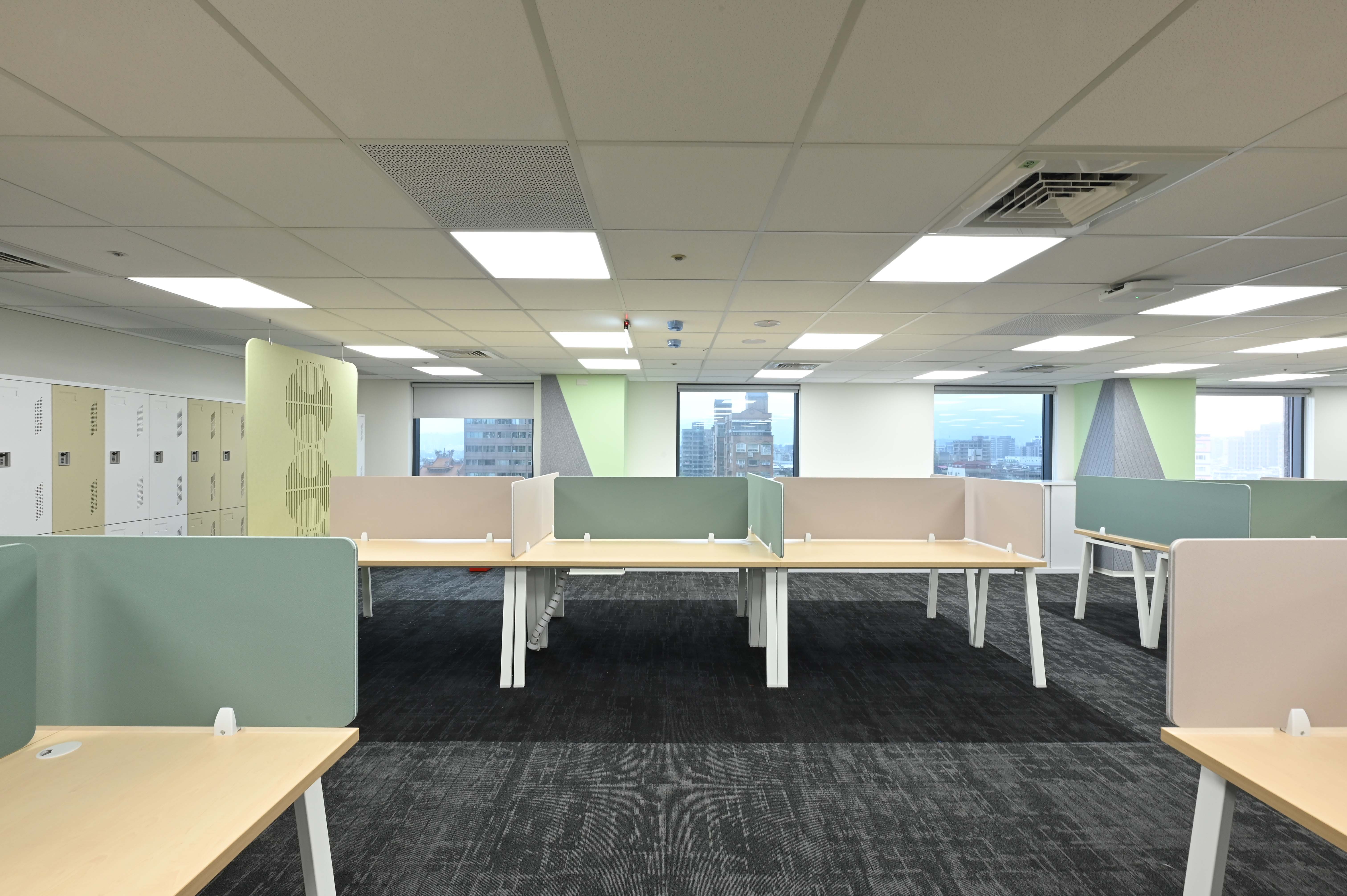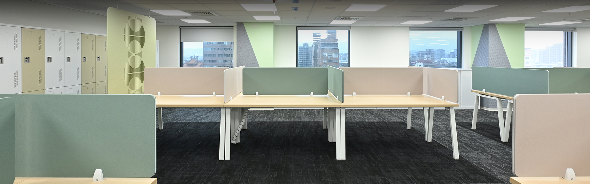 本案每一樓層都採用不同色系的風格,為整個空間增添了多樣性和個性化。在每個樓層中,辦公位採用單桌設計,這種設計既提供了足夠的個人空間,又有利於靈活變更辦公配置,滿足不同的工作需求。桌上隔屏訂製成較高的設計,具有較高的隱私阻隔效果,這有助於提升工作效率和保護敏感資訊。