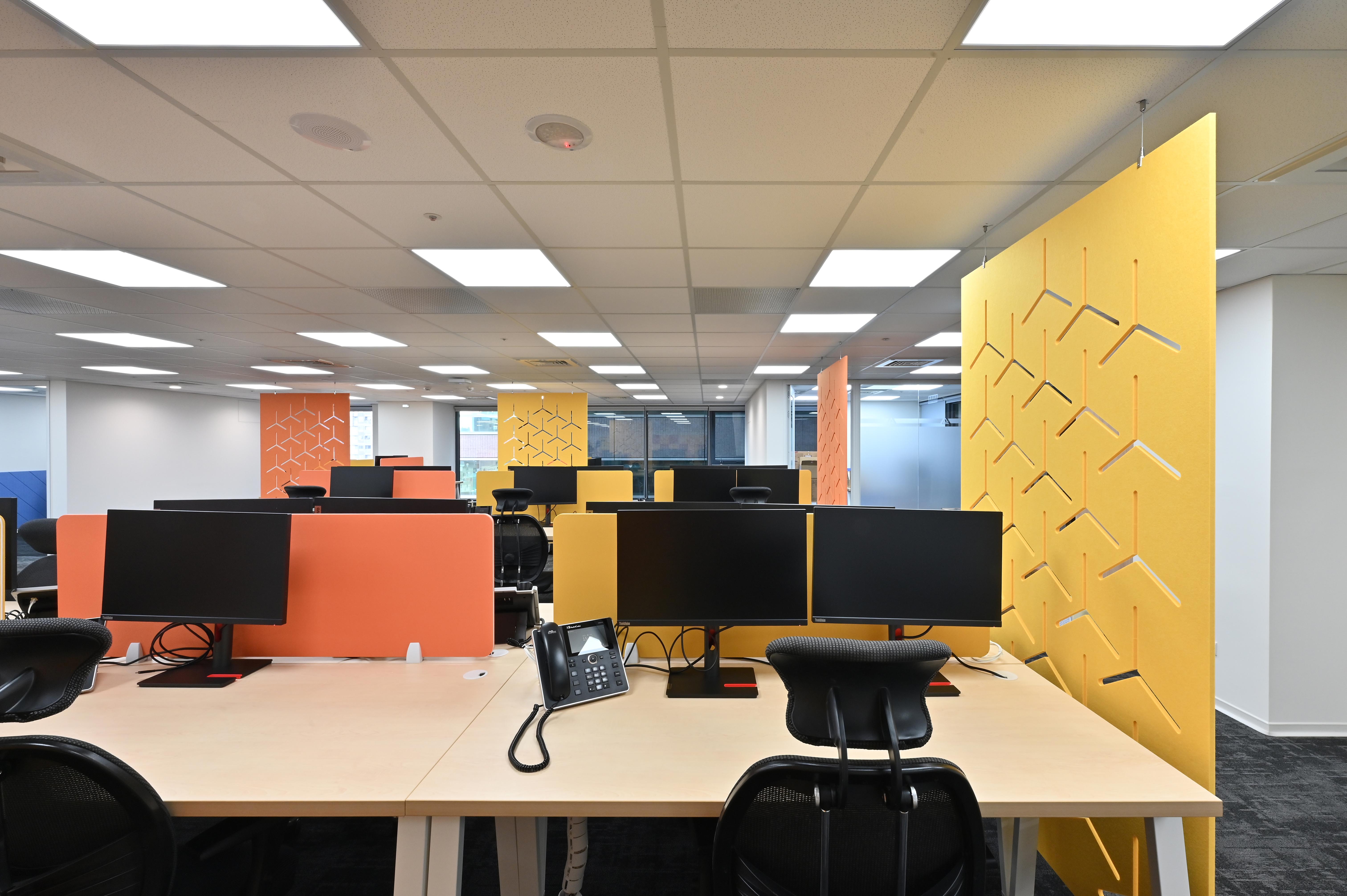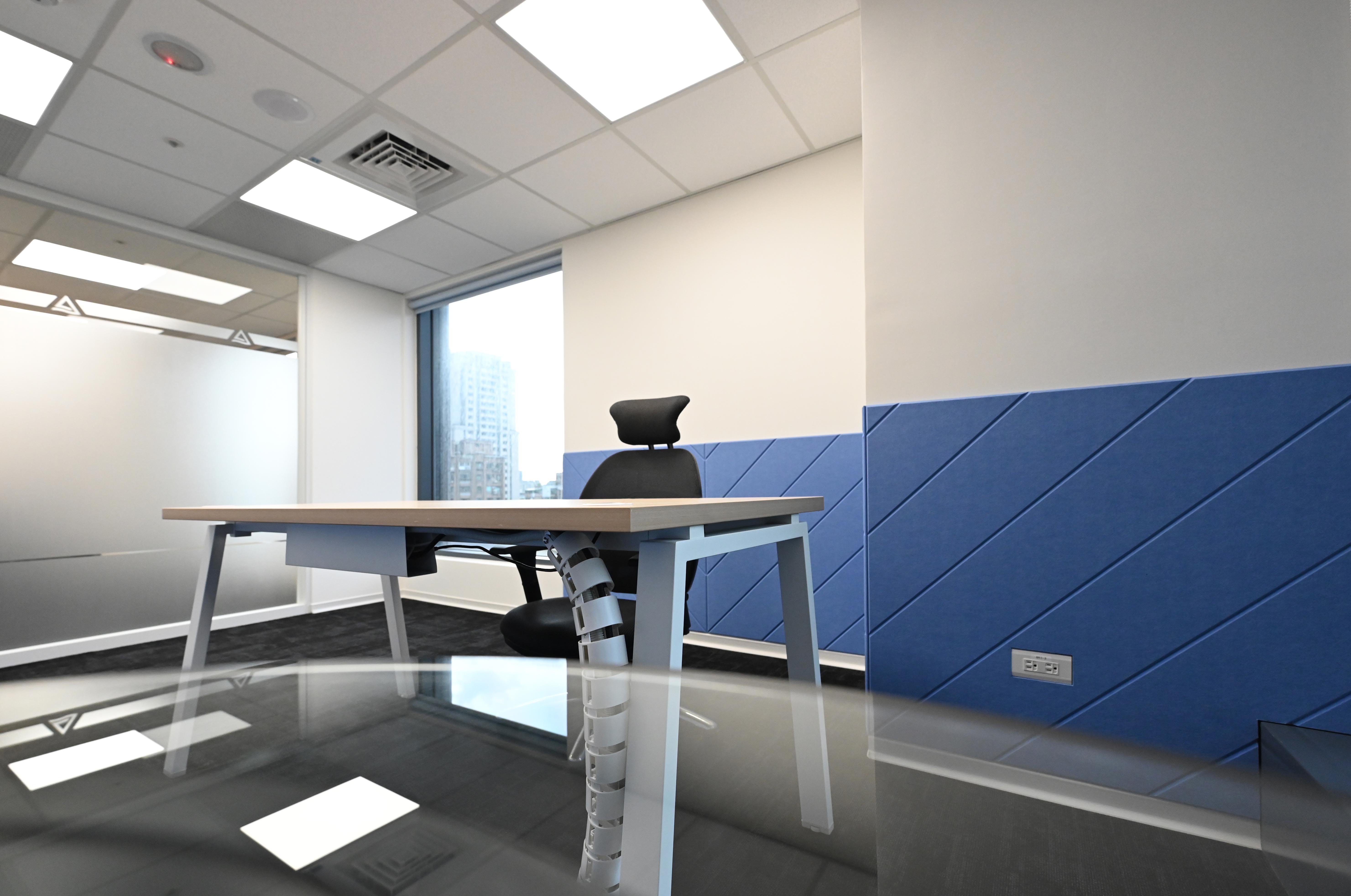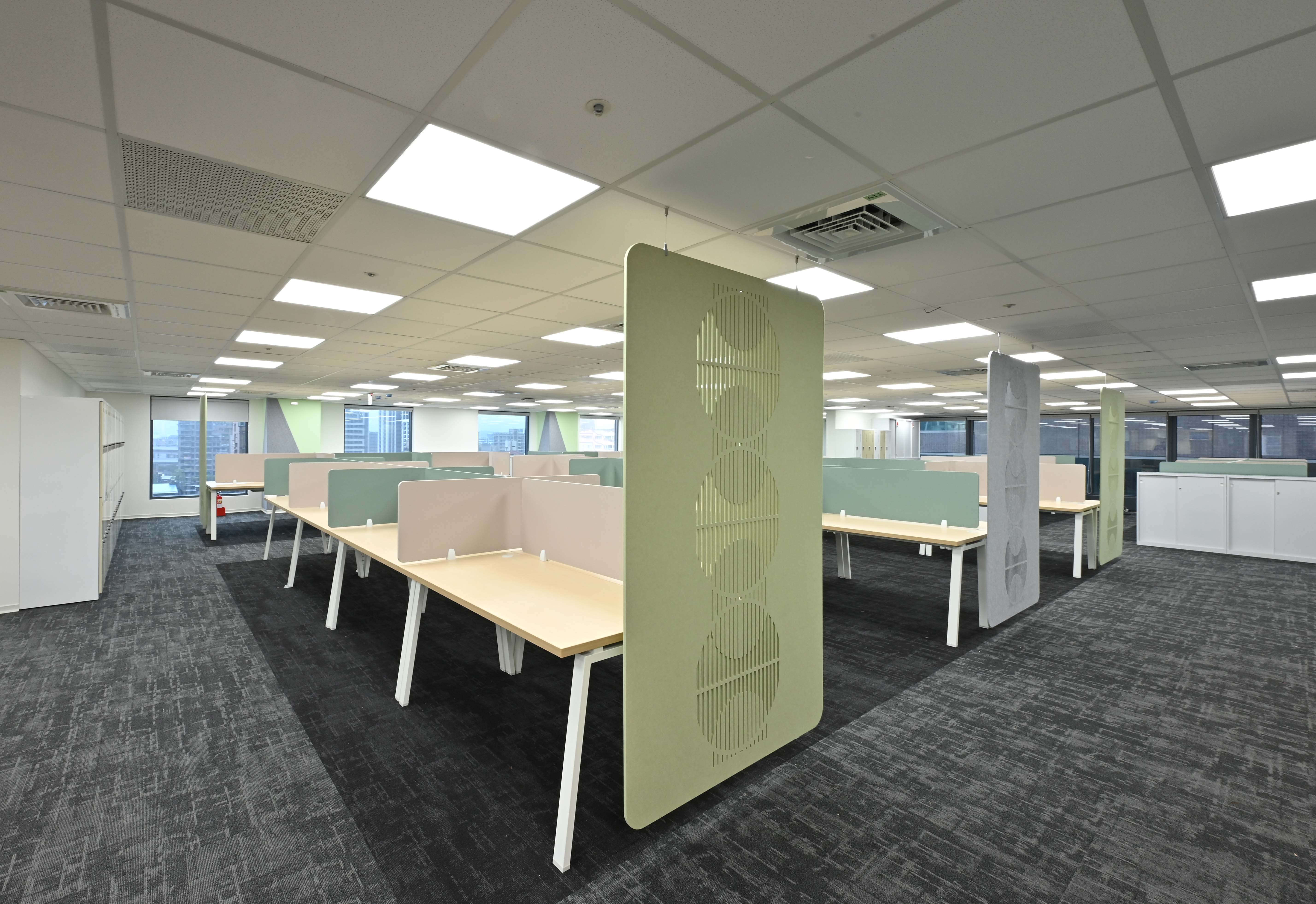 同時,桌上隔屏與吸音隔屏的顏色風格相互搭配,加上訂製的鐵櫃,不僅提供了充分的儲物空間,還營造出了一個統一而舒適的工作環境。本案的設計方案既考慮了工作效率和隱私保護,又注重了整體空間的美感和風格。