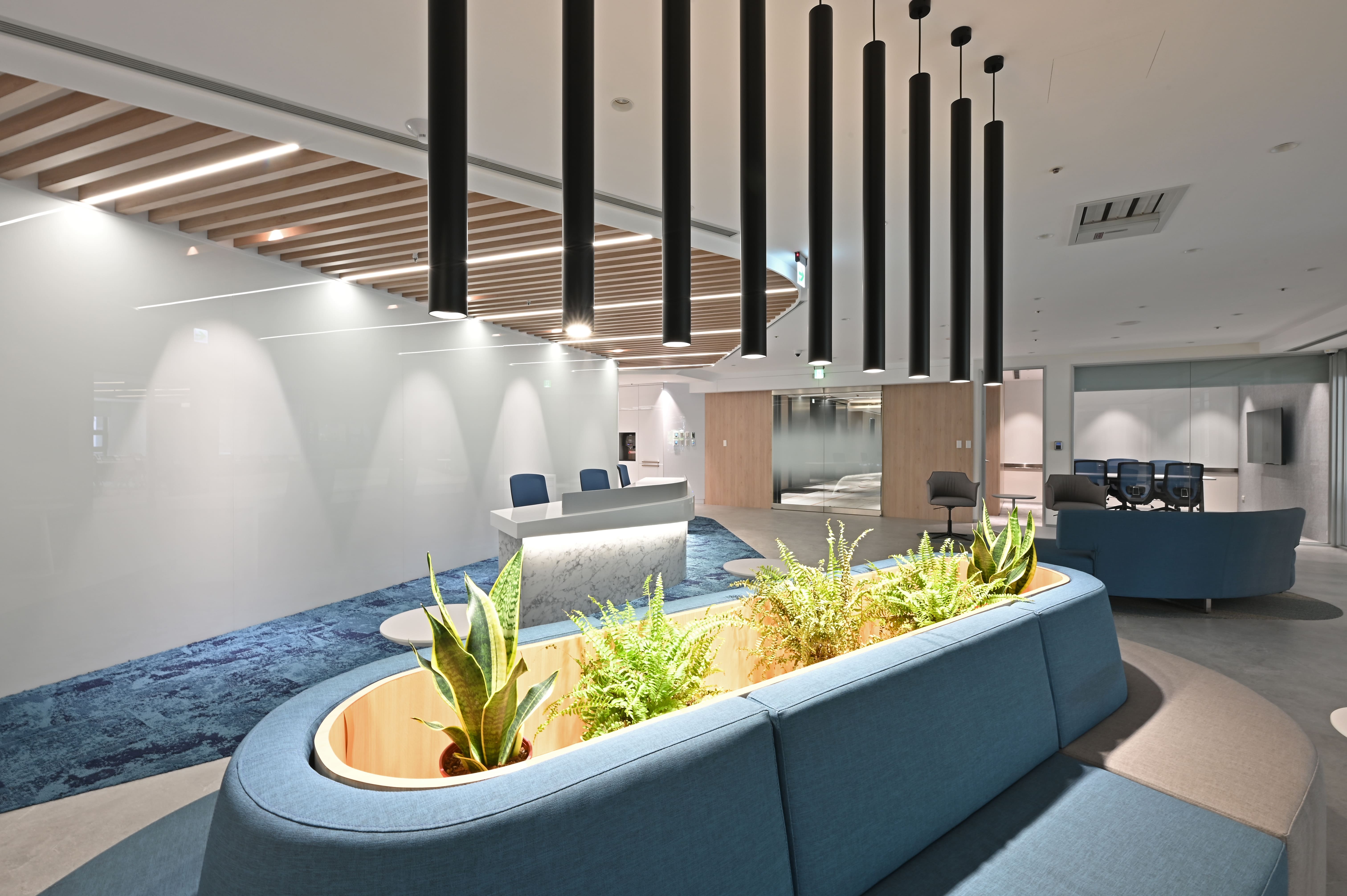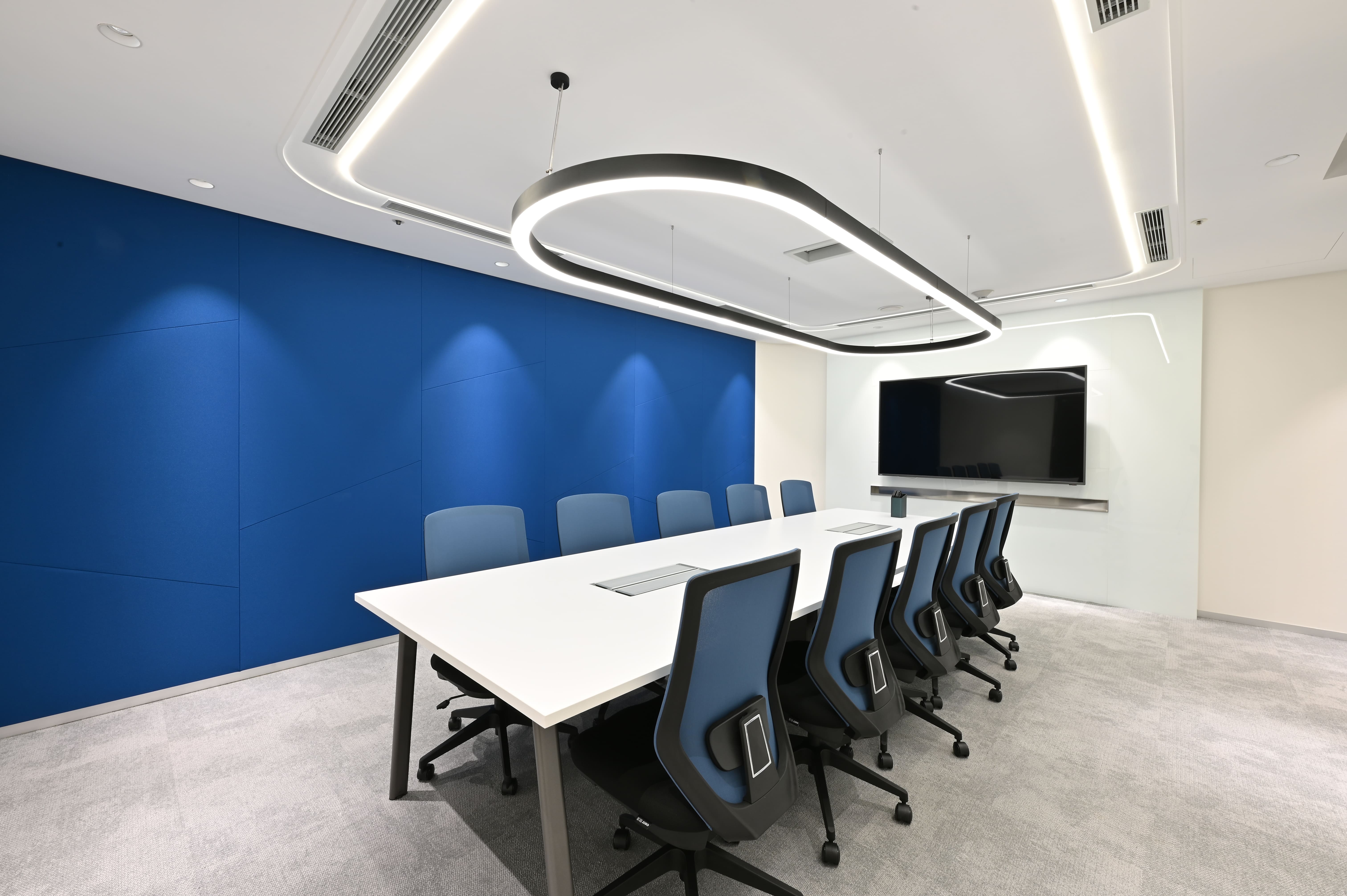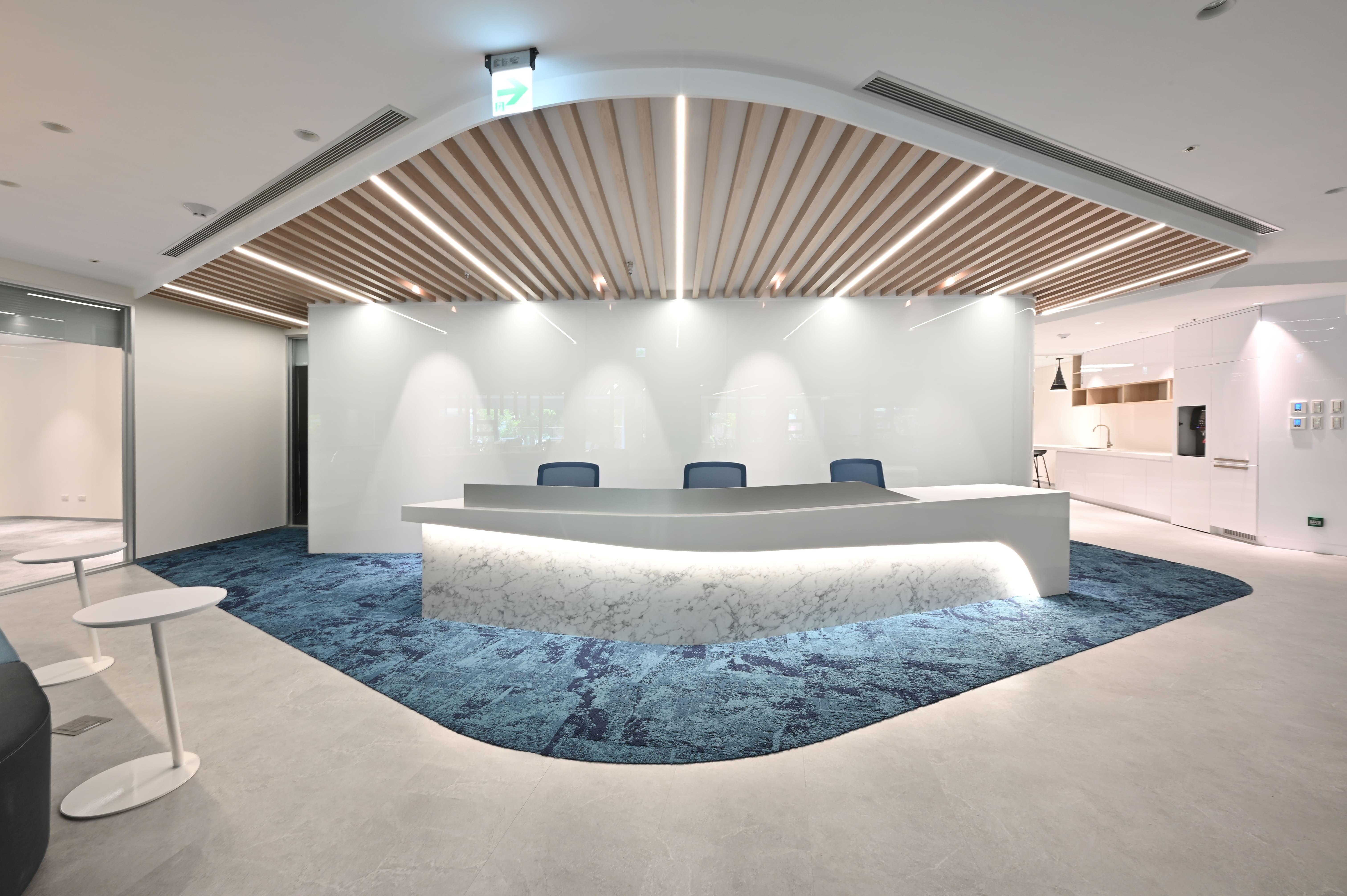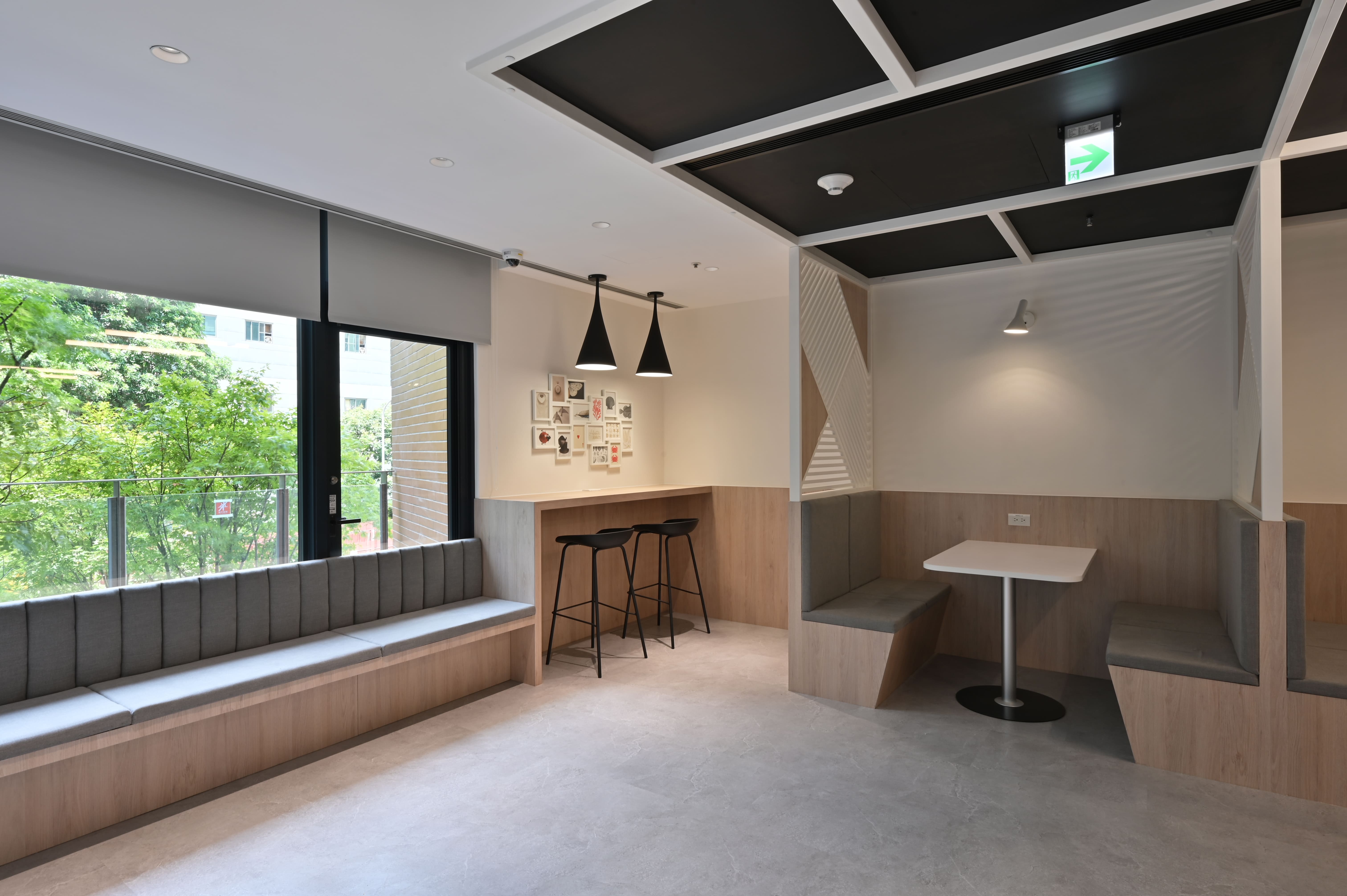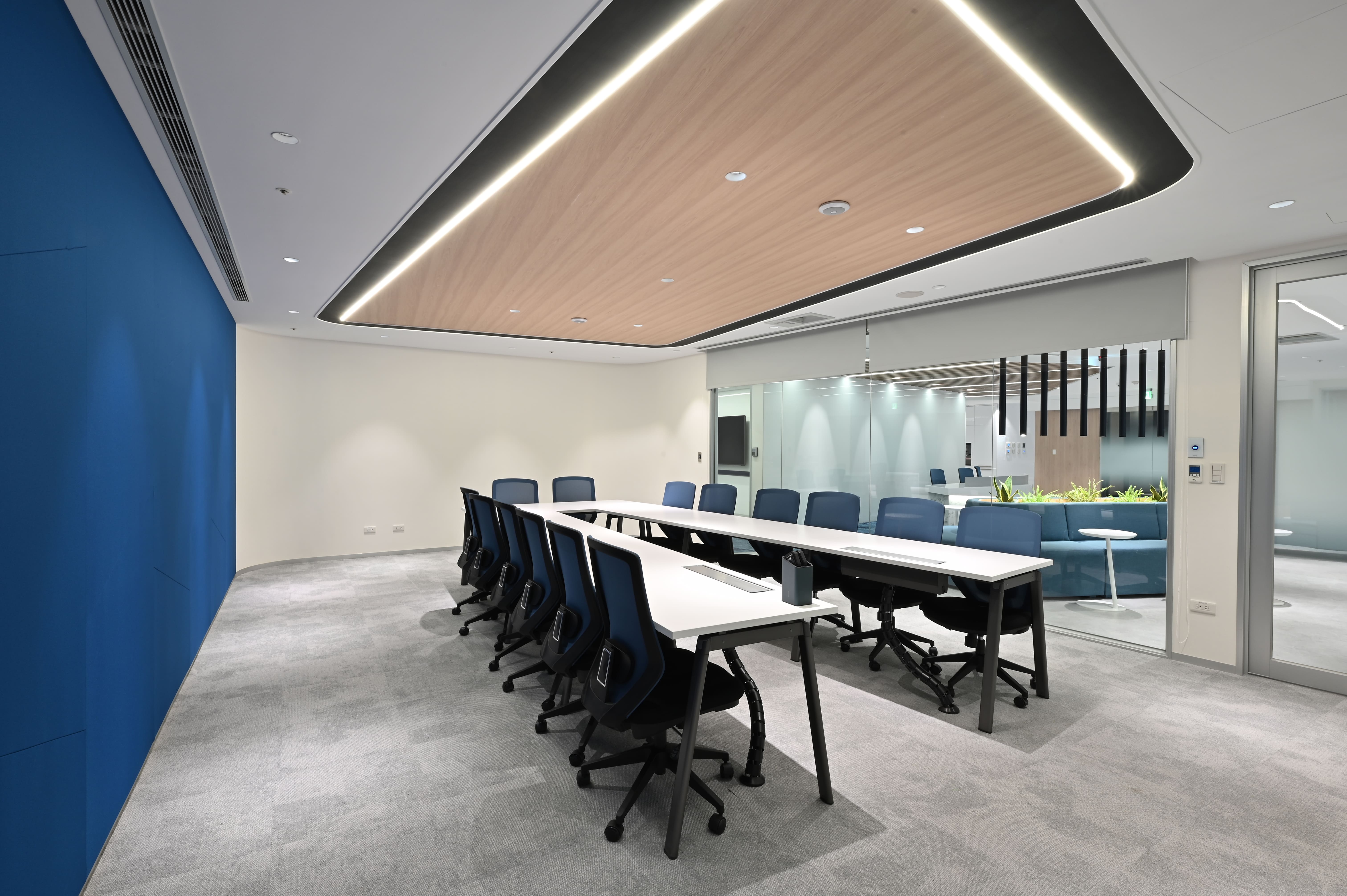以明亮的白色為基底,採用木紋與深藍企業色點綴空間,公共區域使用客製造型沙發,映綠的植栽擺設增添幾分自然氣息,搭配純白