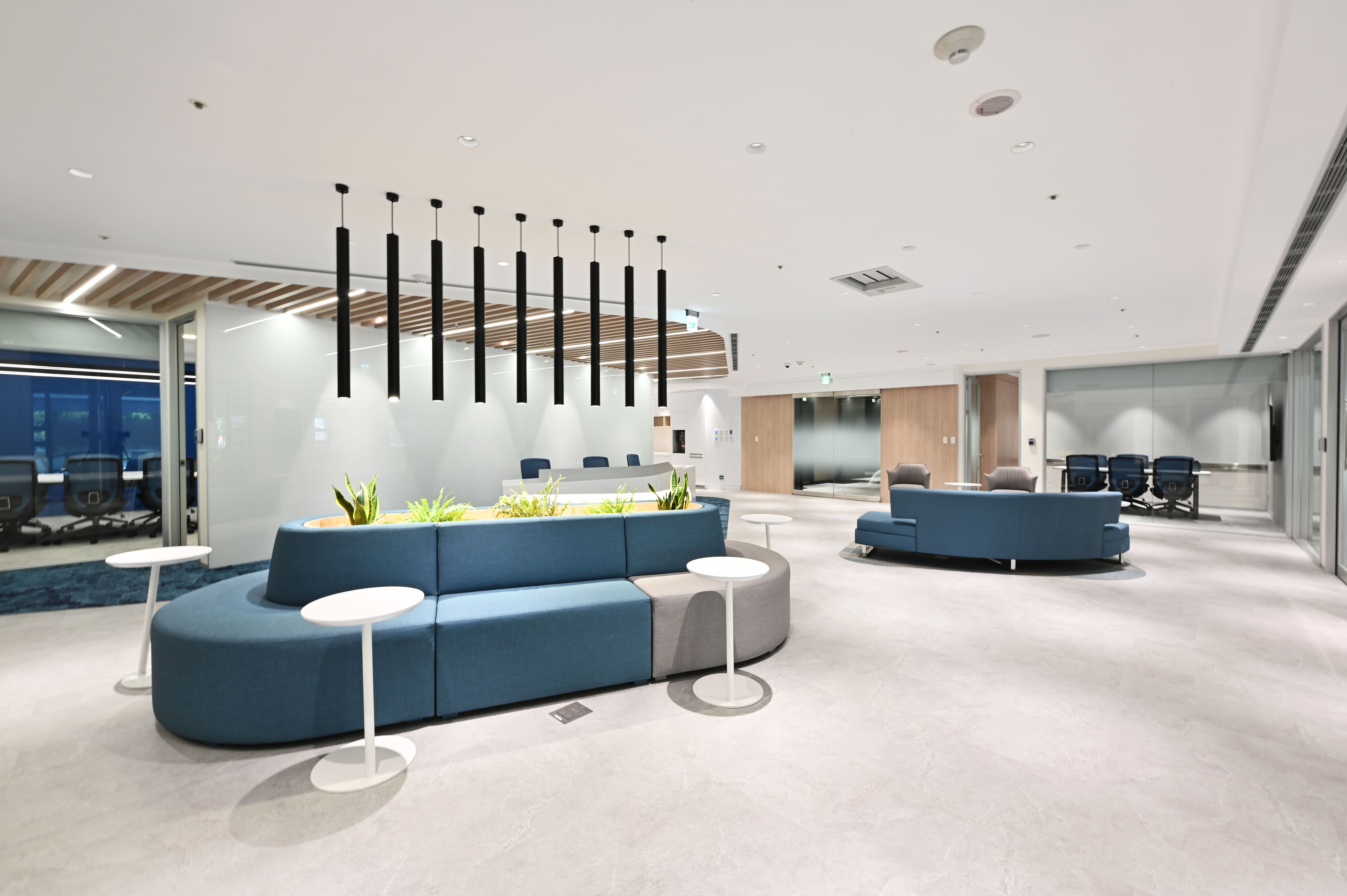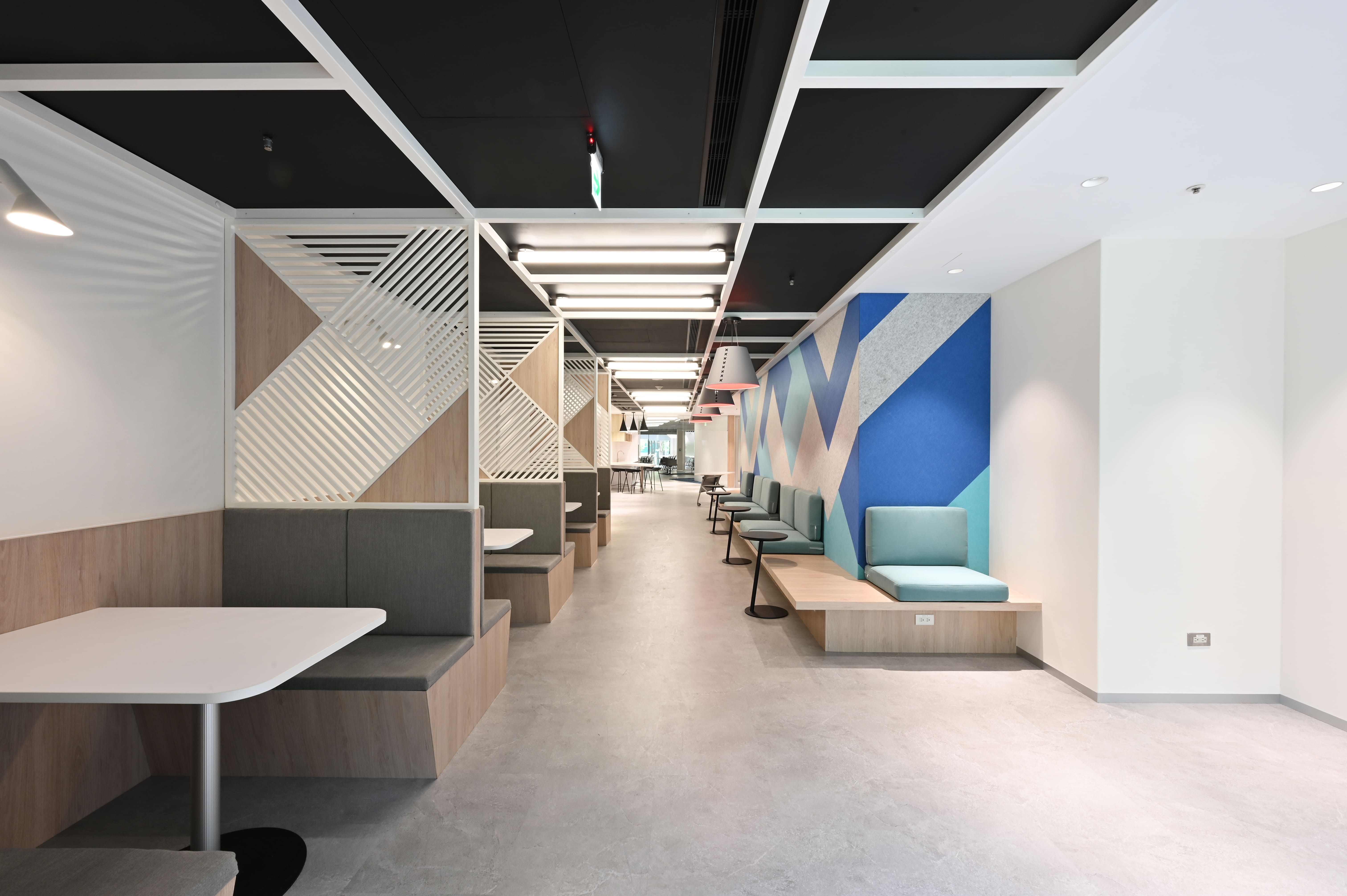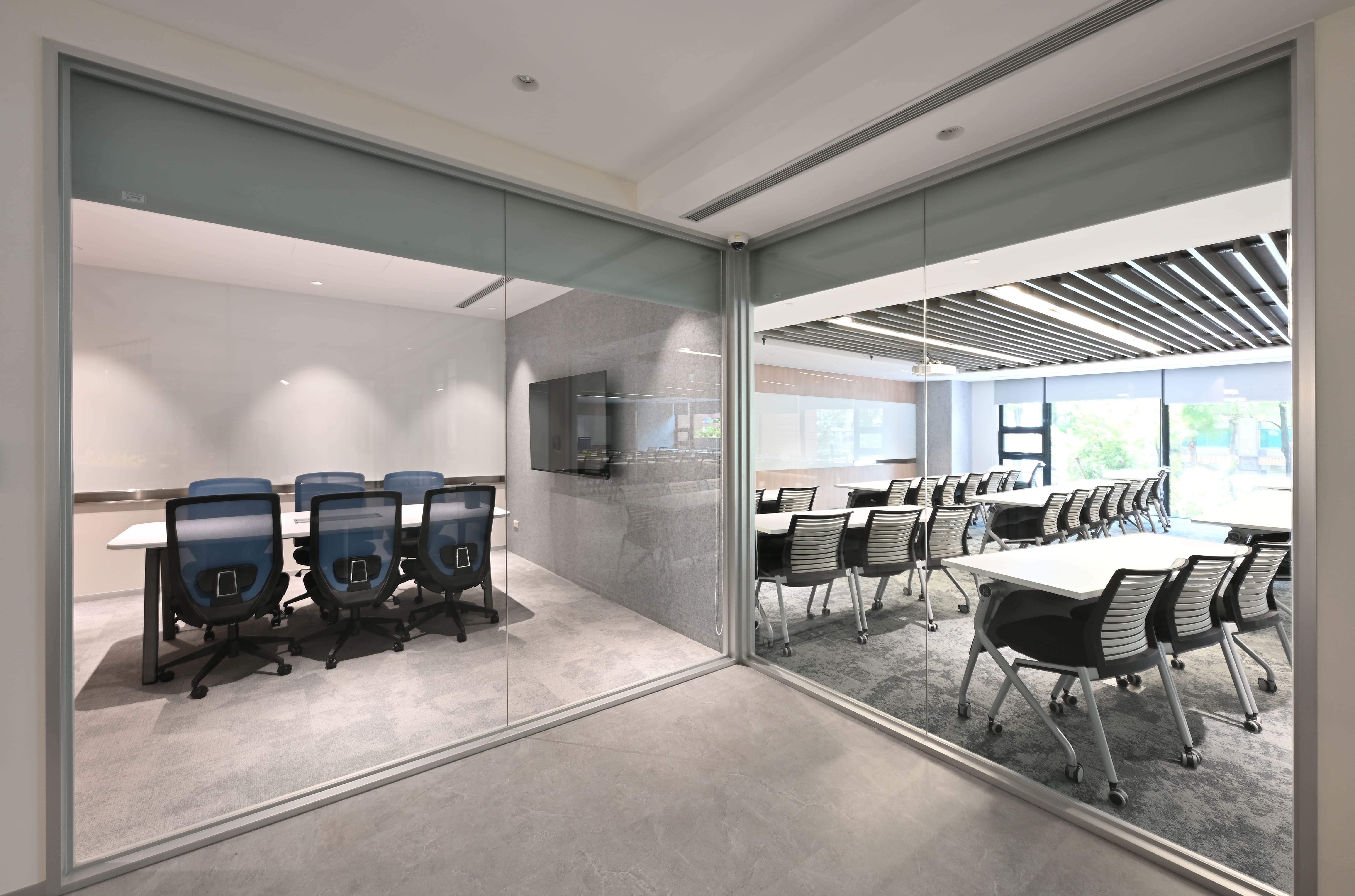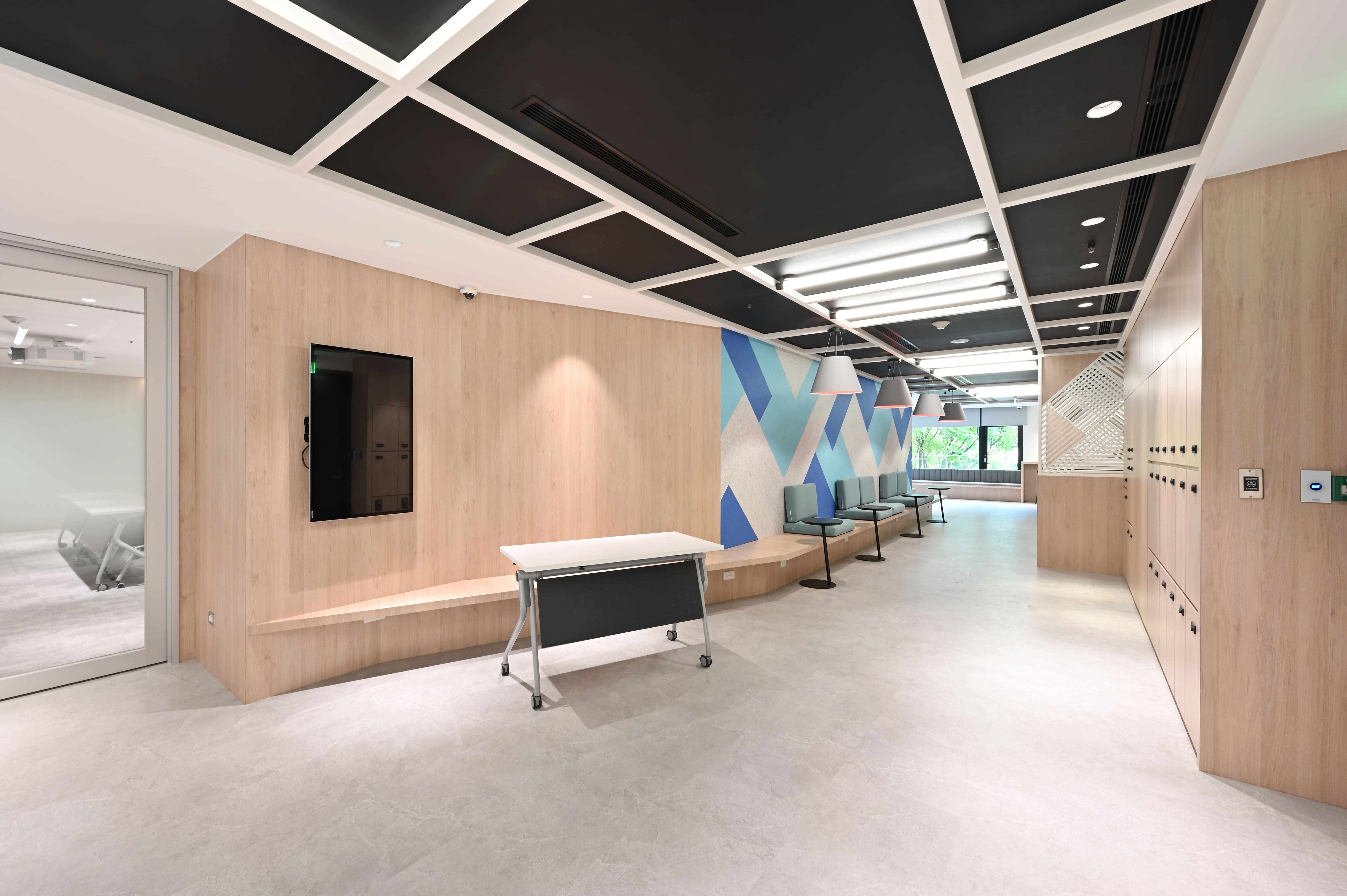 以明亮的白色為基底,採用木紋與深藍企業色點綴空間,公共區域使用客製造型沙發,映綠的植栽擺設增添幾分自然氣息,搭配純白