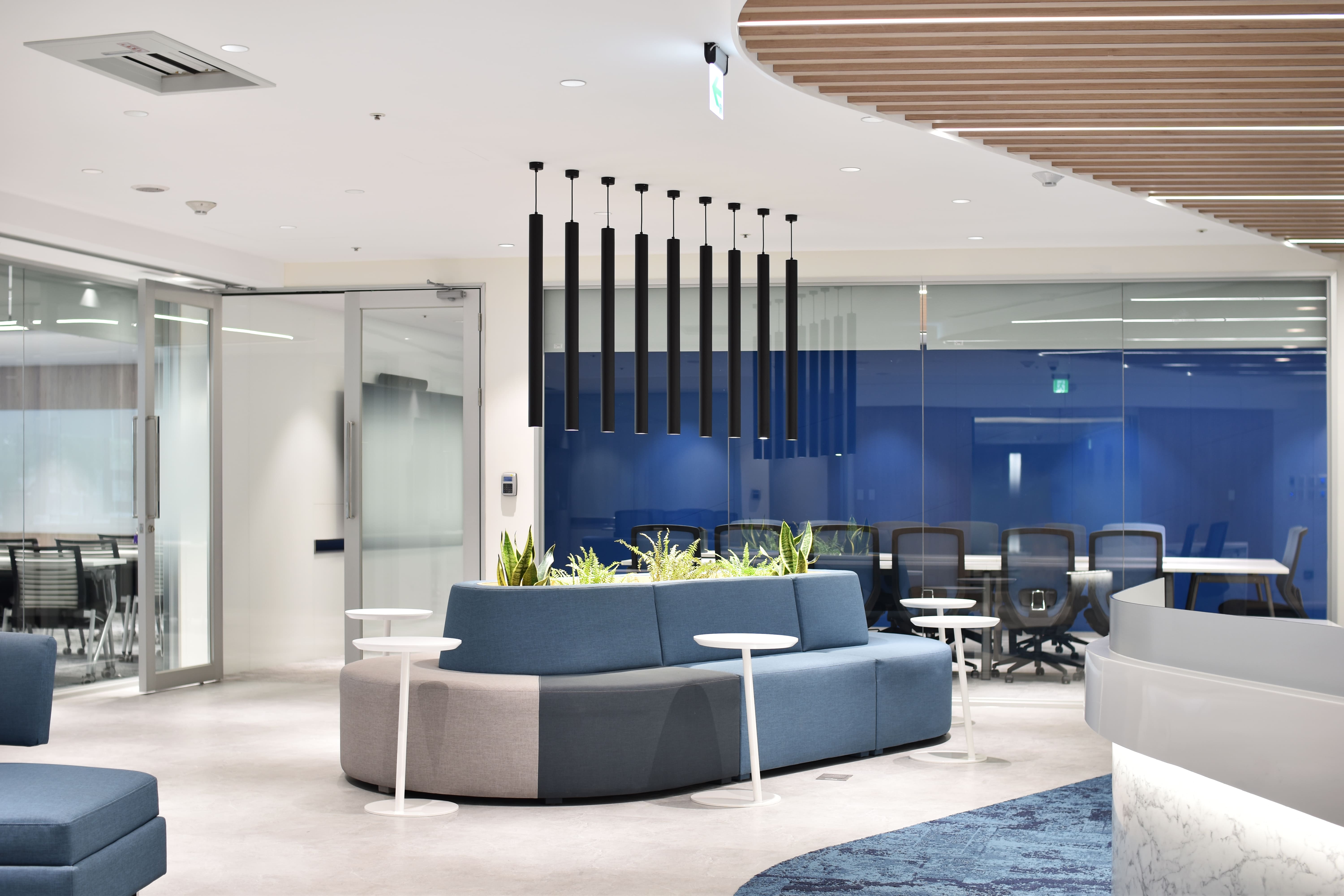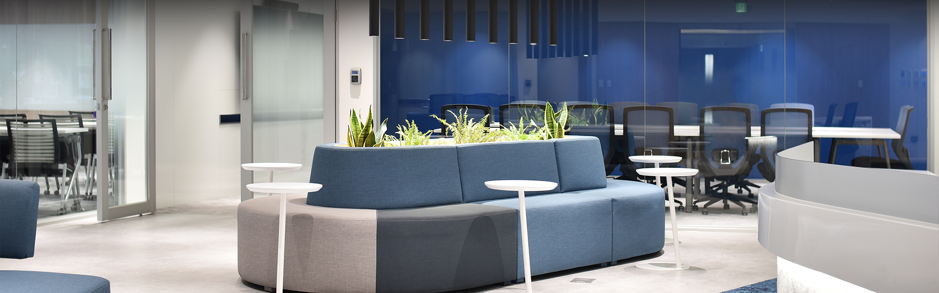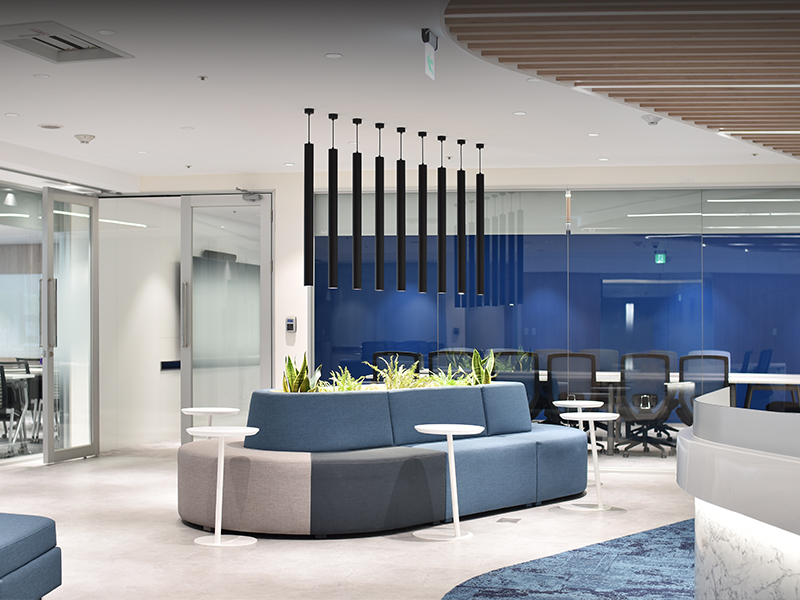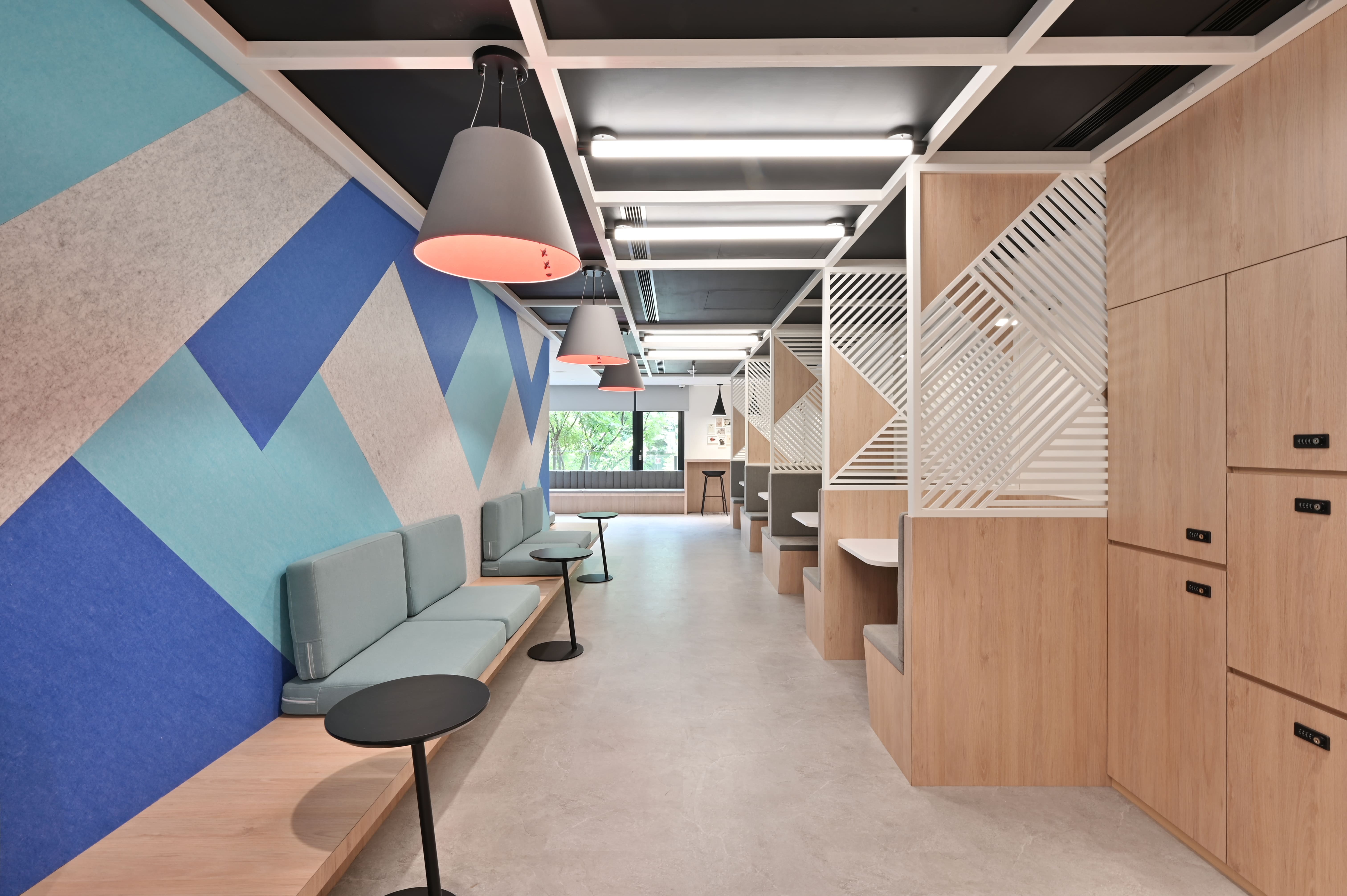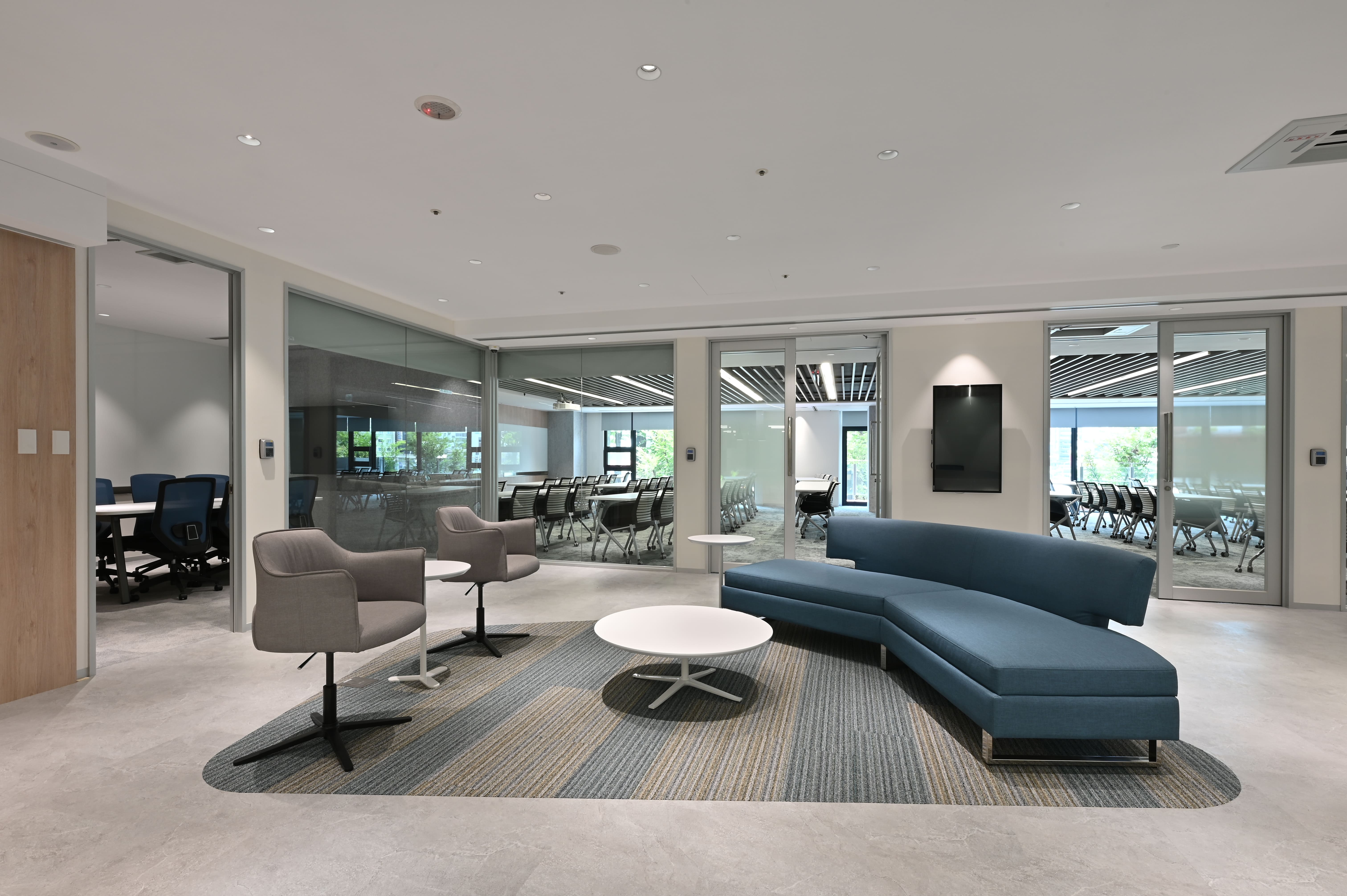 以明亮的白色為基底,採用木紋與深藍企業色點綴空間,公共區域使用客製造型沙發,映綠的植栽擺設增添幾分自然氣息,搭配純白