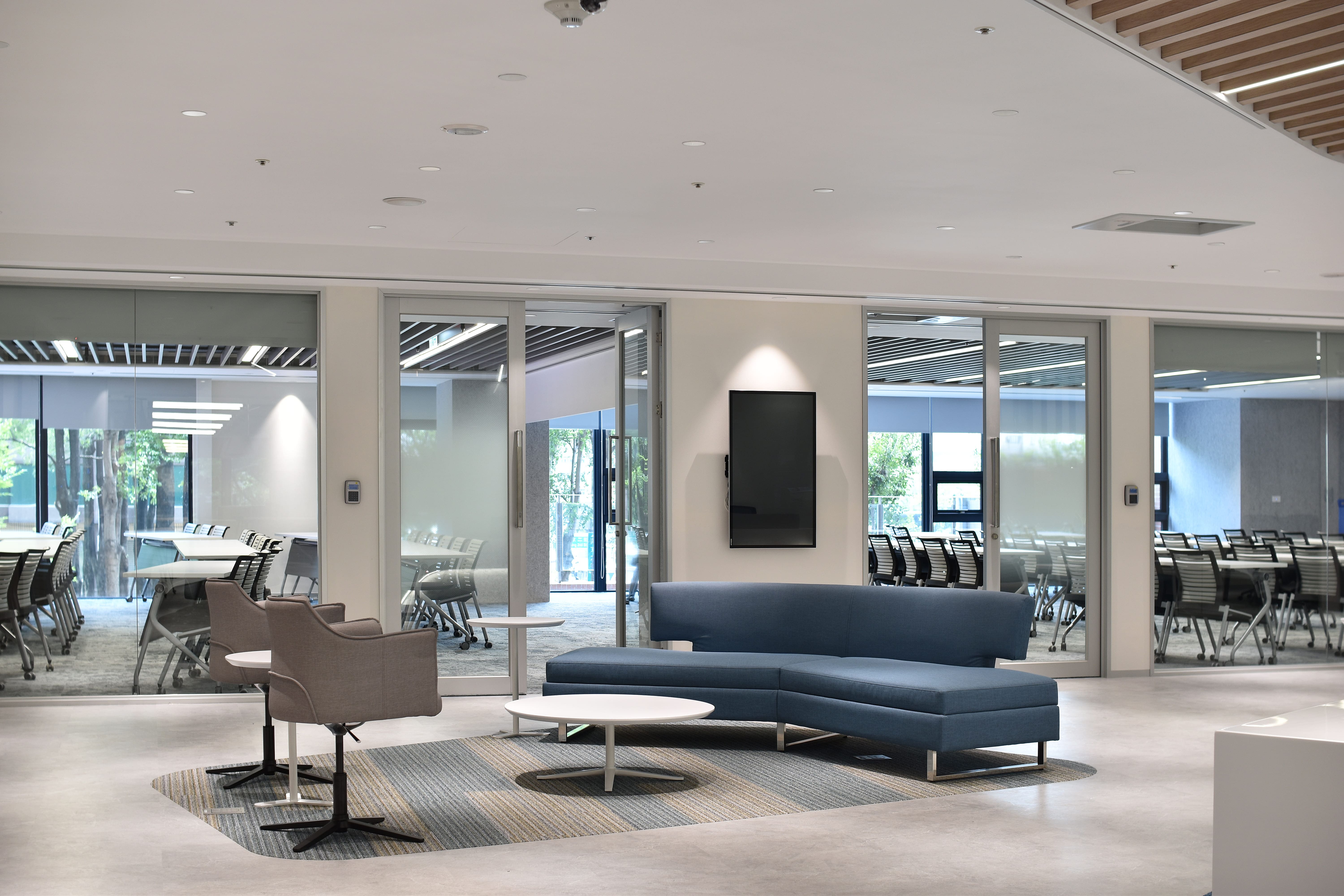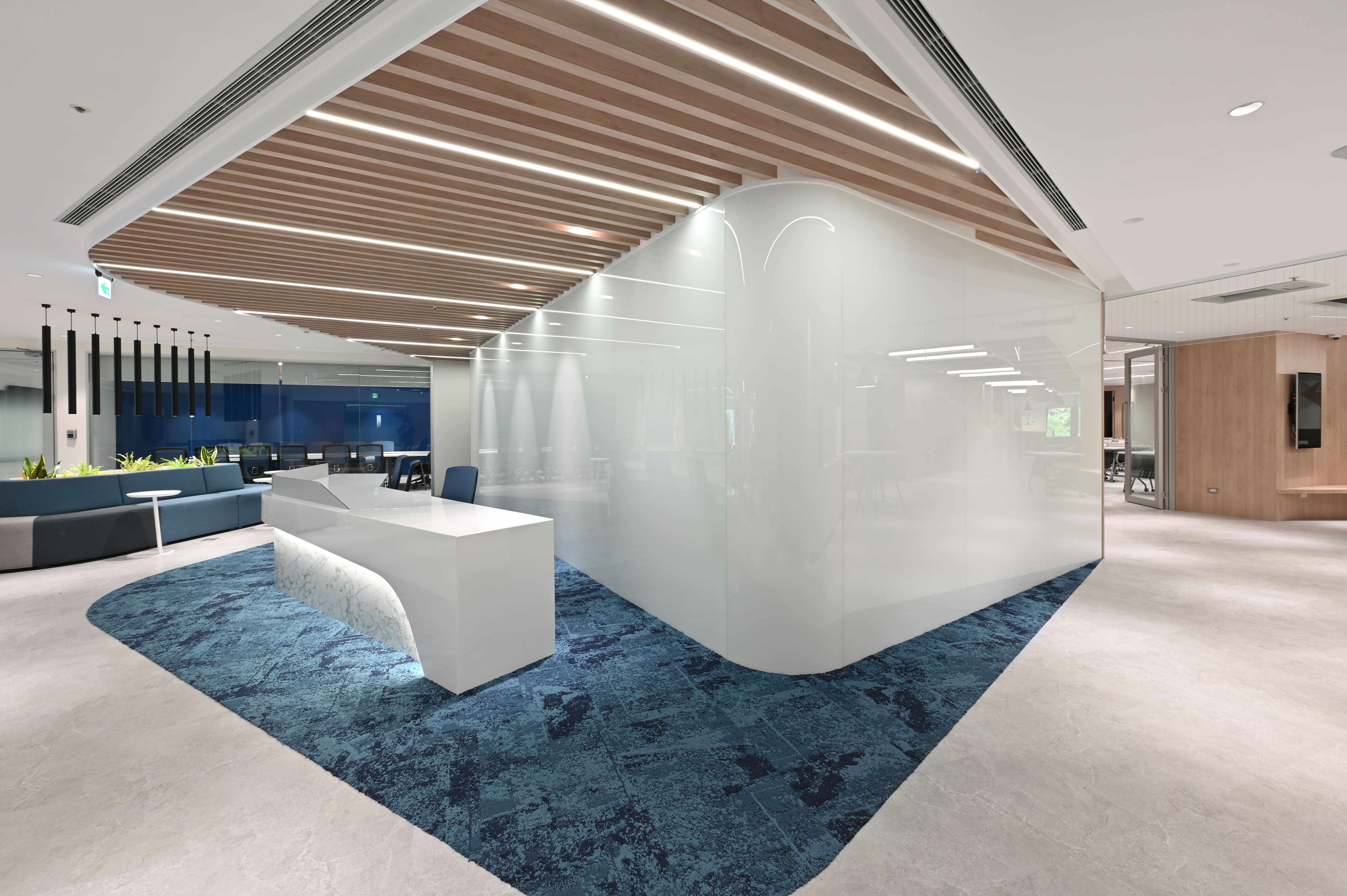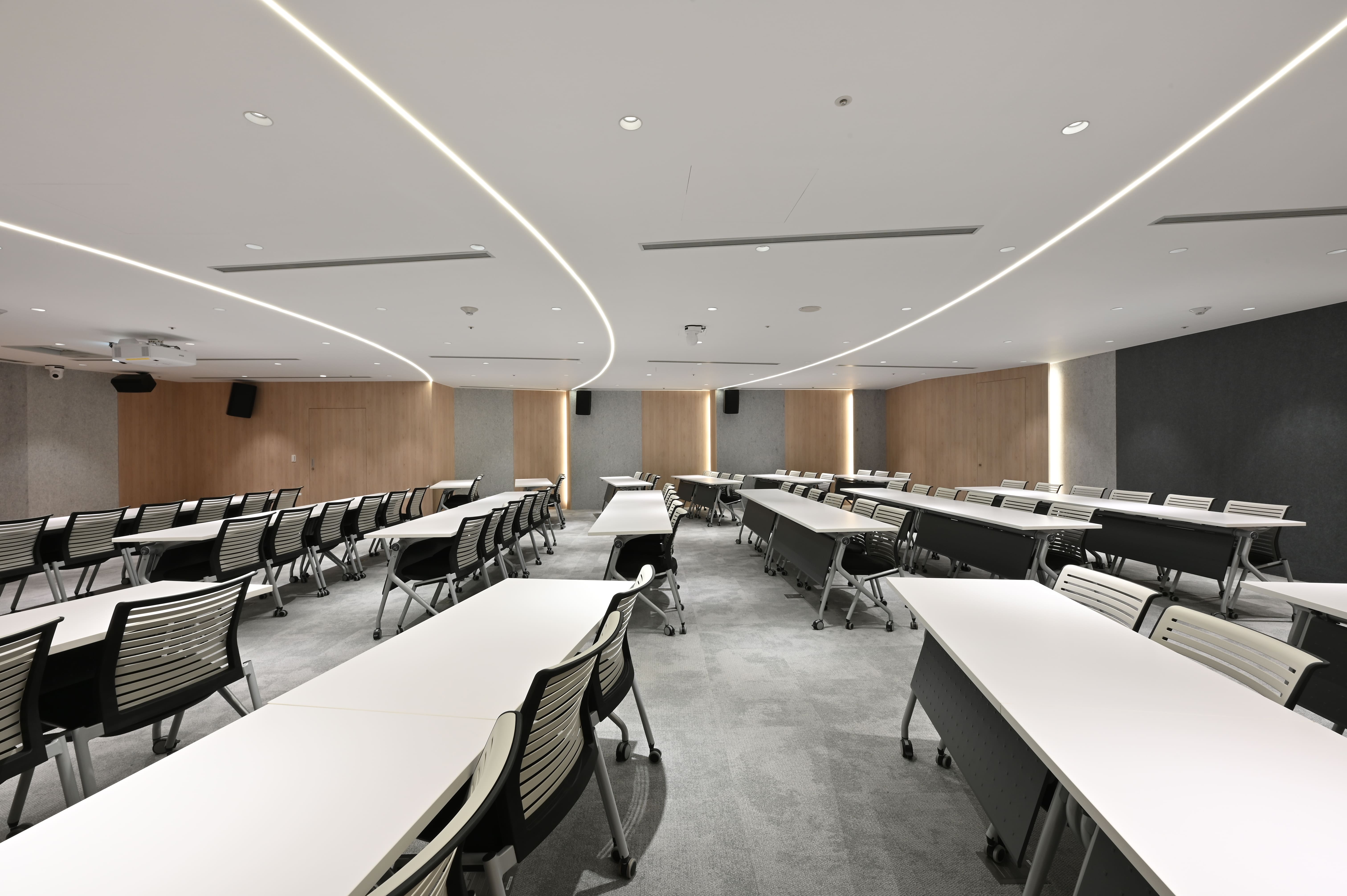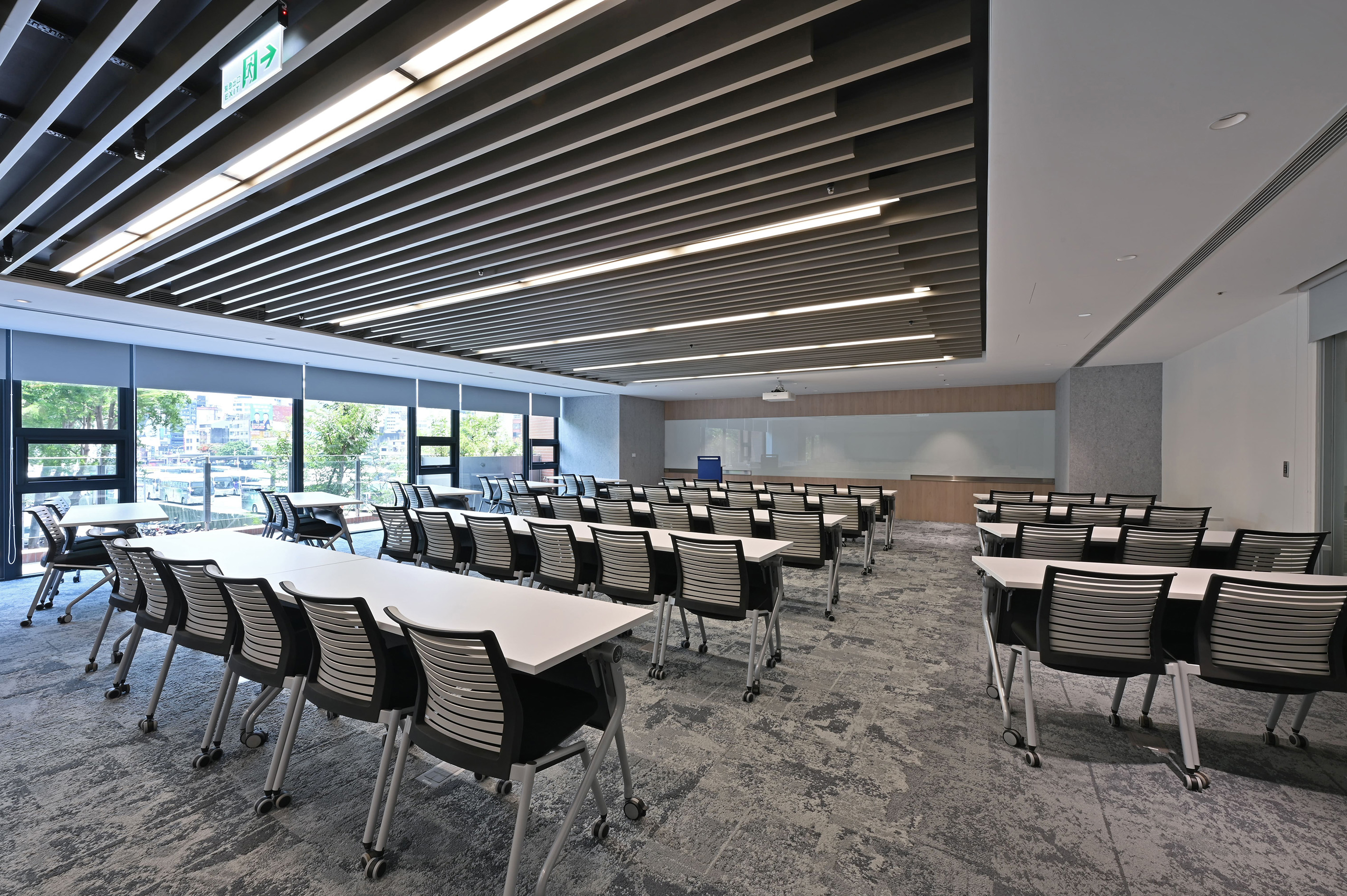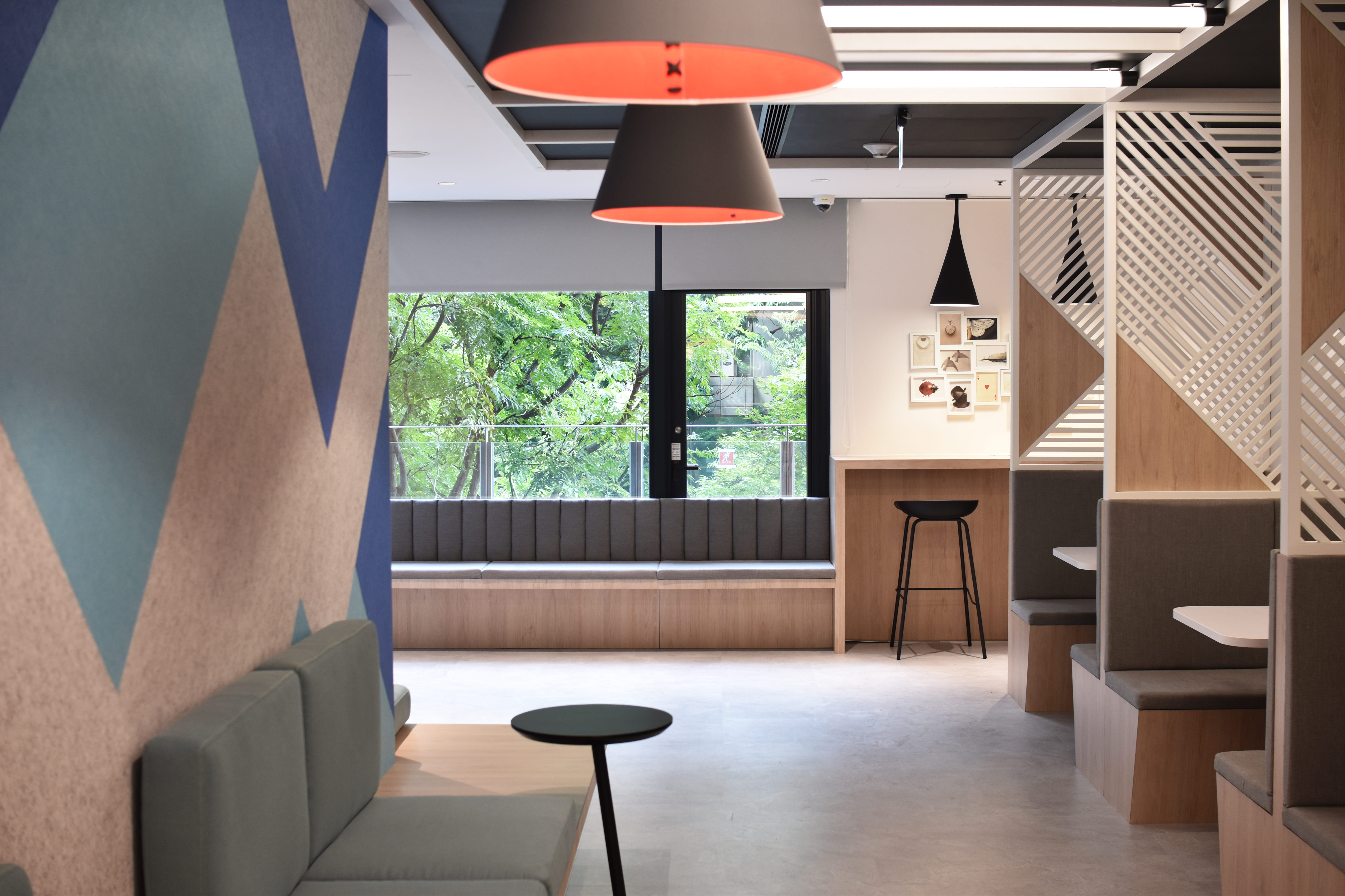 以明亮的白色為基底,採用木紋與深藍企業色點綴空間,公共區域使用客製造型沙發,映綠的植栽擺設增添幾分自然氣息,搭配純白