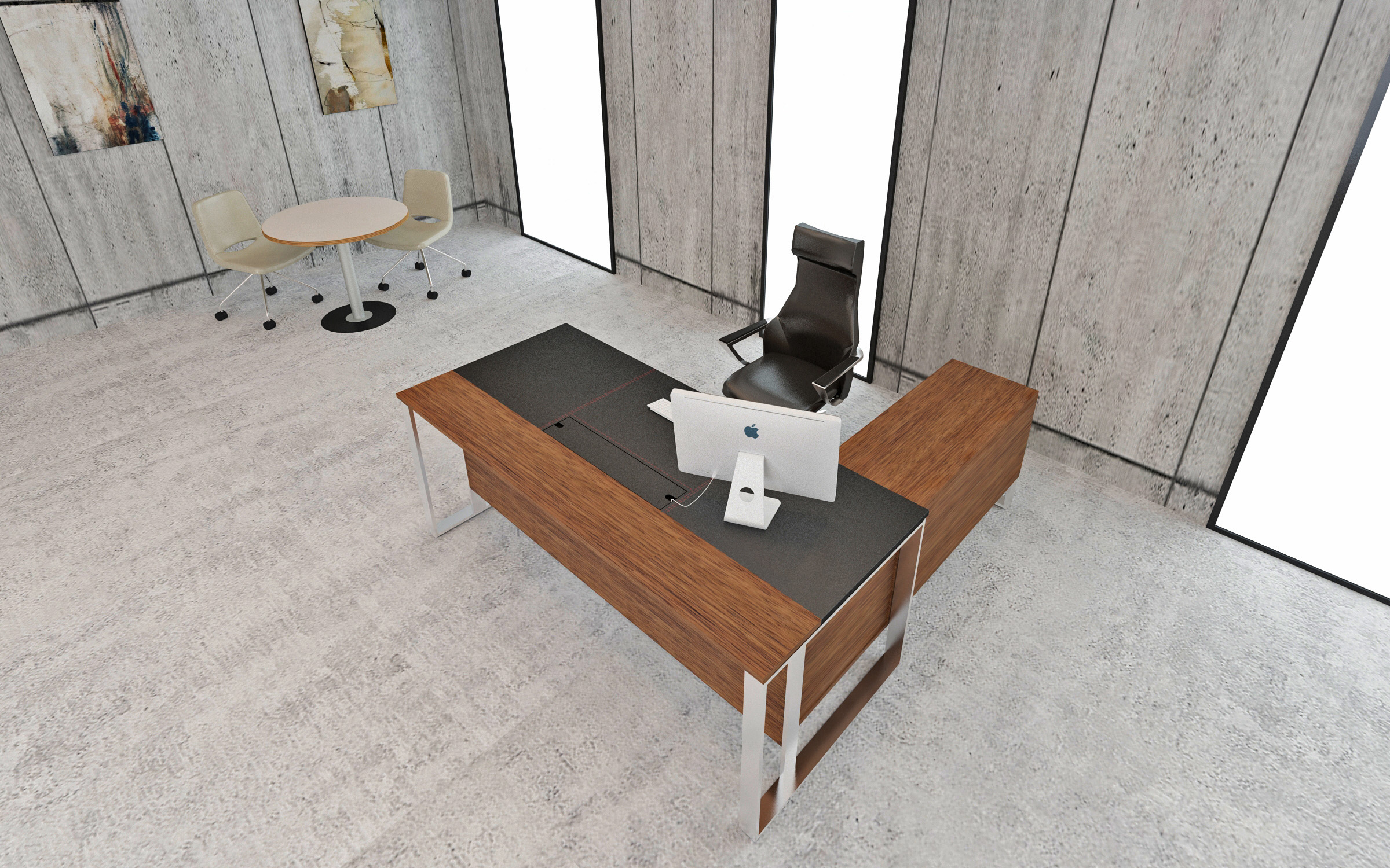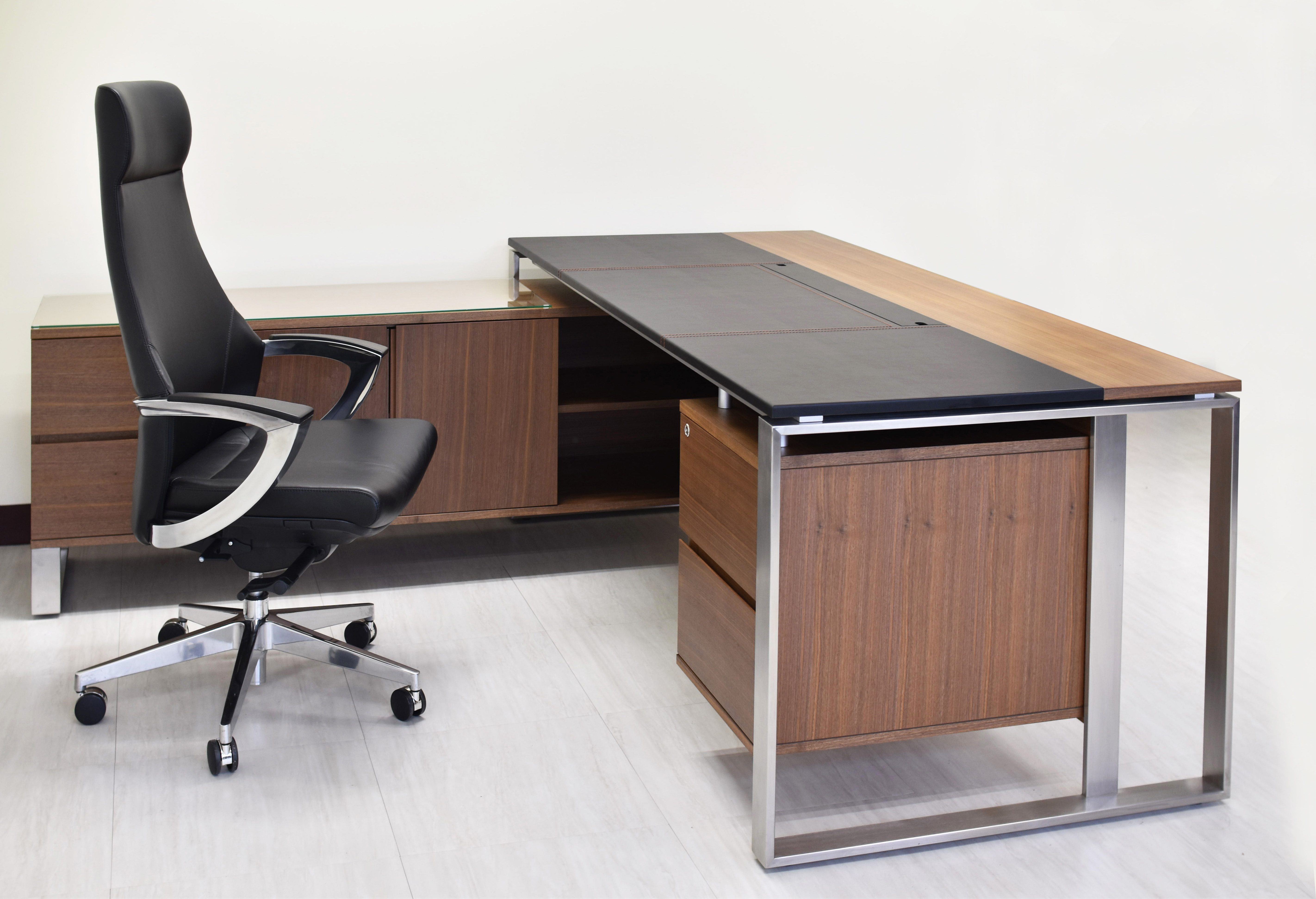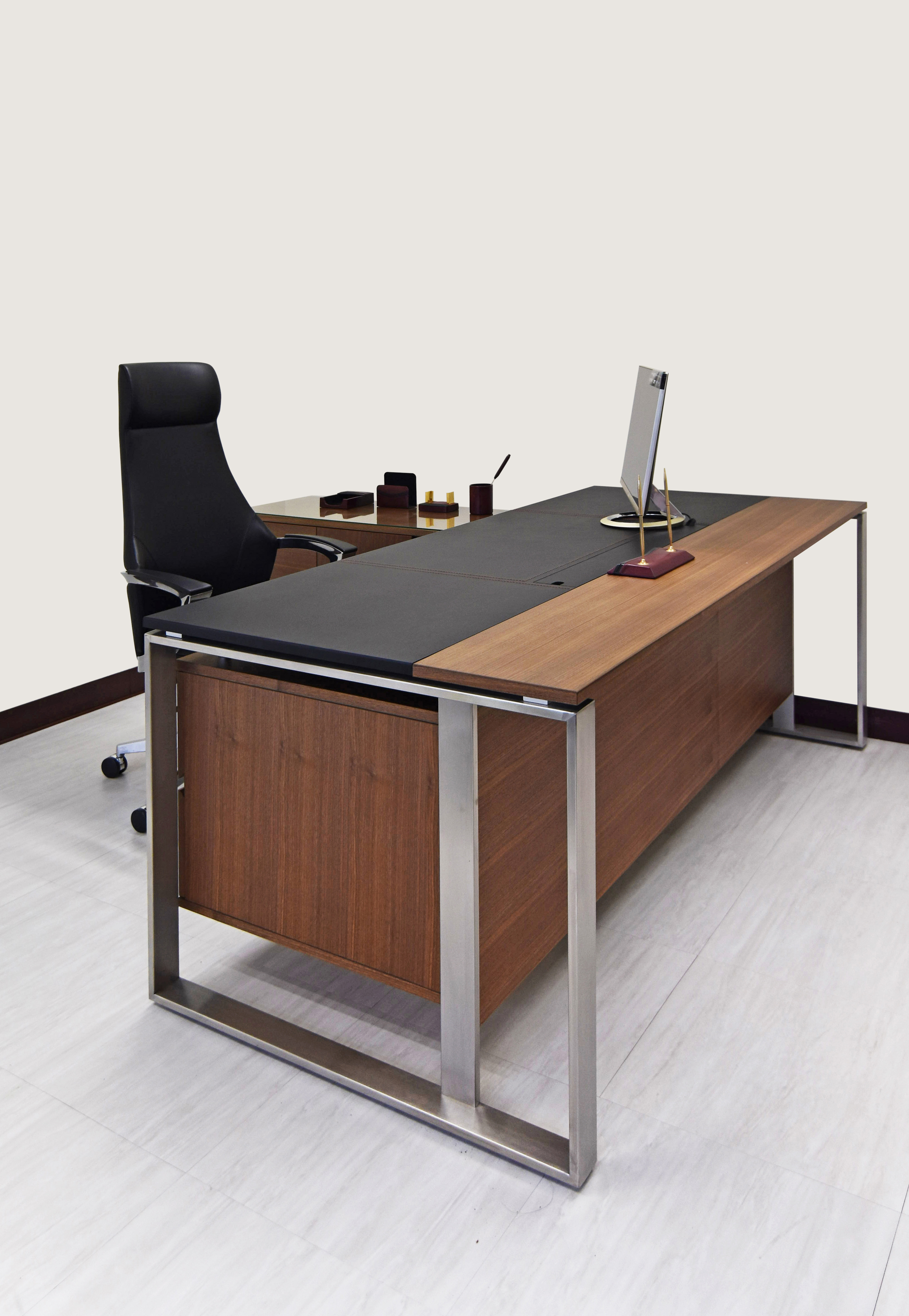 APOLLO以不銹鋼口字桌腳結合實木貼皮桌面,表現異材質的對比與和諧,桌板與桌腳以懸空方式設計,桌下抽屜櫃則懸浮於桌面下方,增添主管桌的輕盈質感,適合現代化的寬間風格。不鏽鋼桌腳表面採拉絲處理,桌板貼附黑色馬鞍皮,展現低調高級的質感。