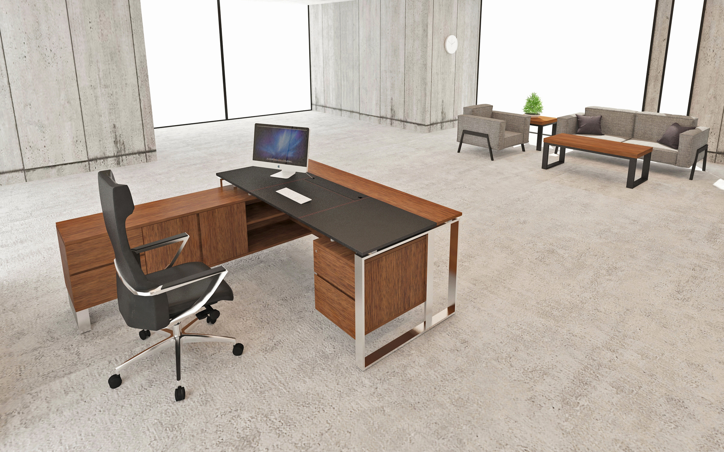 不管是側櫃或是袖箱,都設計離地一段距離的懸空,讓主管桌產生一種"漂浮感",既穩重又不給人沉重的醍醐感。