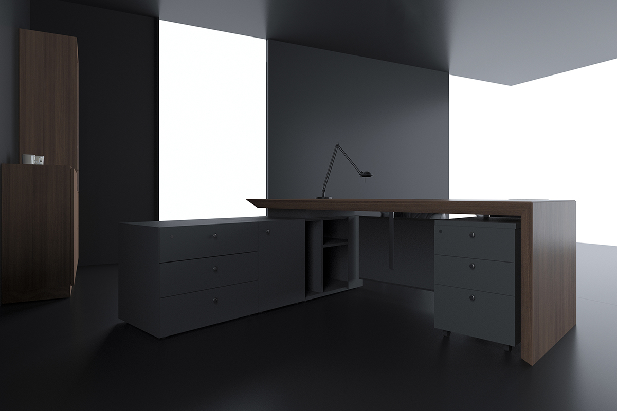 GENGHIS KHAN主打沉穩及不可忽視的份量感。整體秉持簡約至上的設計原則,桌板使用深色實木貼皮,以倒斜角方式增添獨特個性並中和厚桌板的視覺重量,桌面及櫃體中間設計為懸空,使其具備穩重的感受卻不顯笨重呆版。側櫃及前擋板以鐵灰色織紋面塗裝,觸感表裡如一。桌面配有隱藏式出線盒。