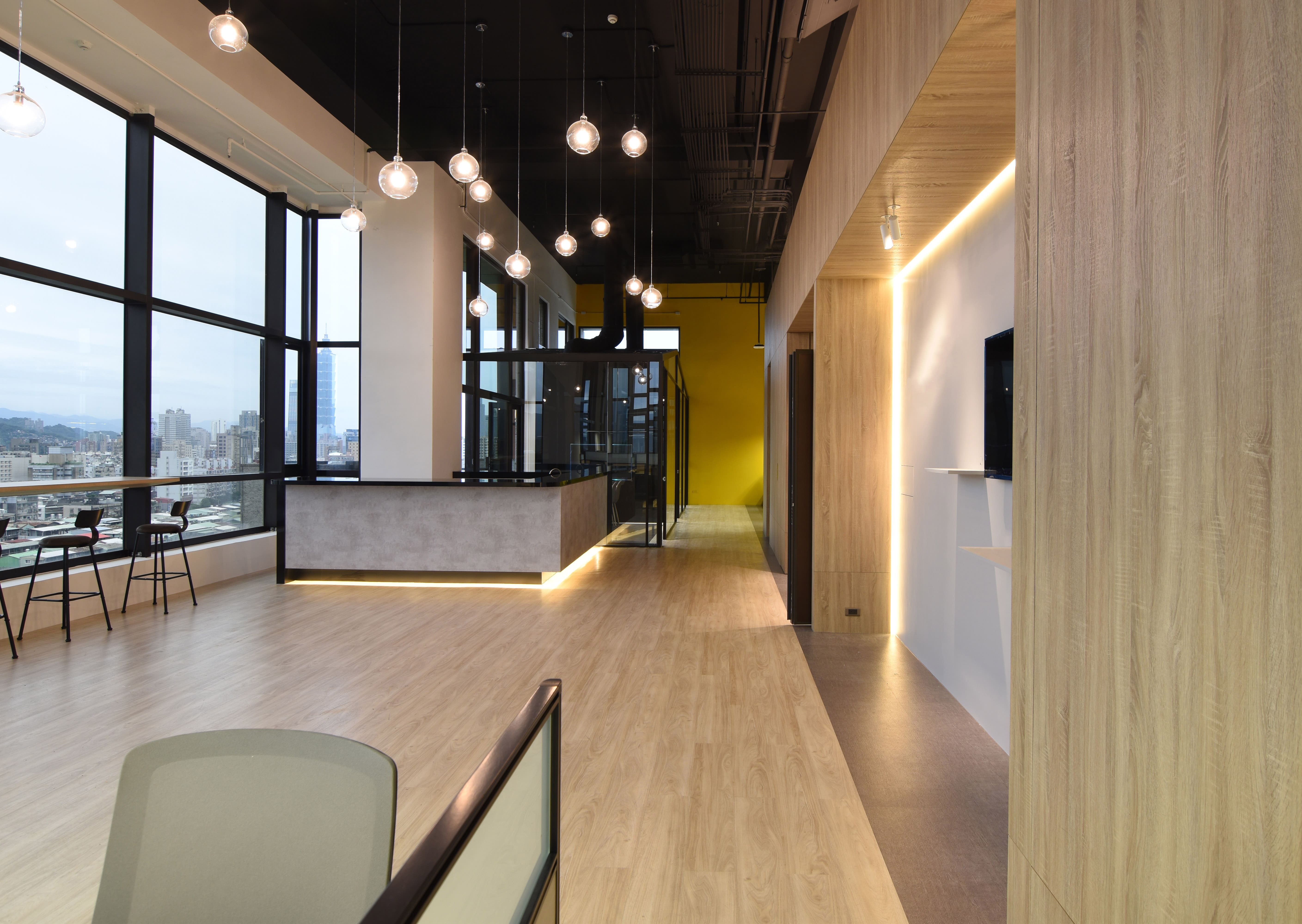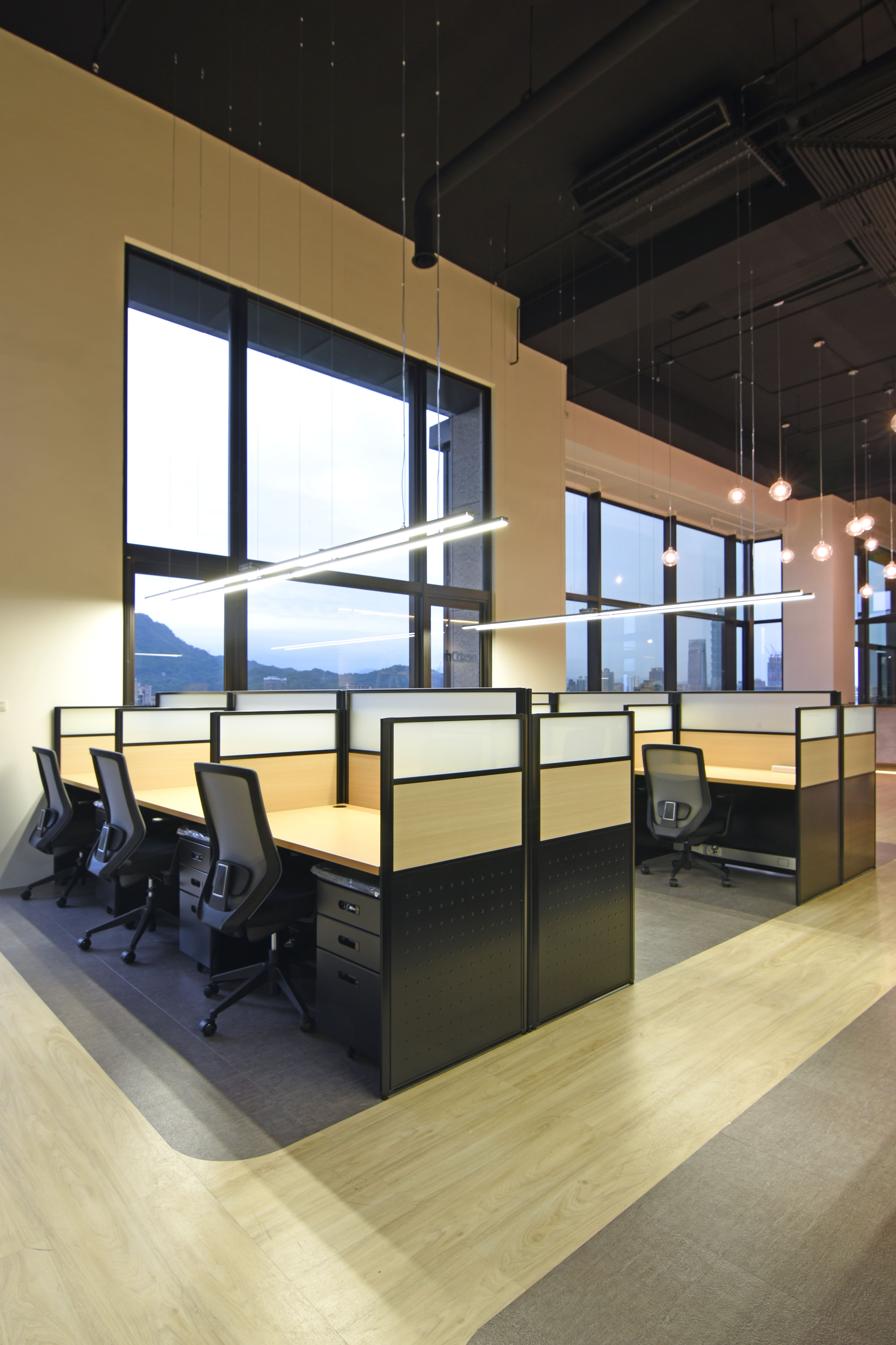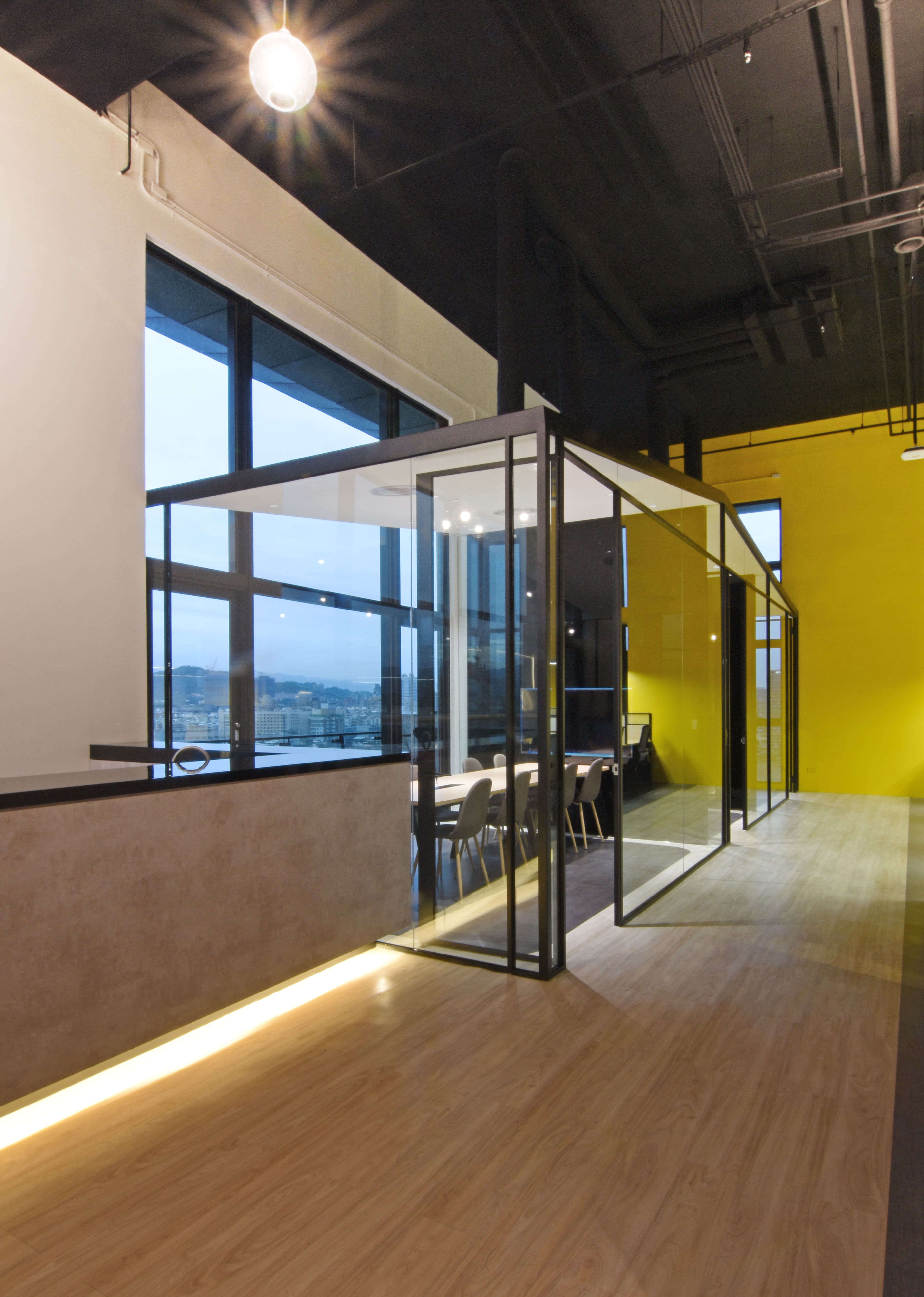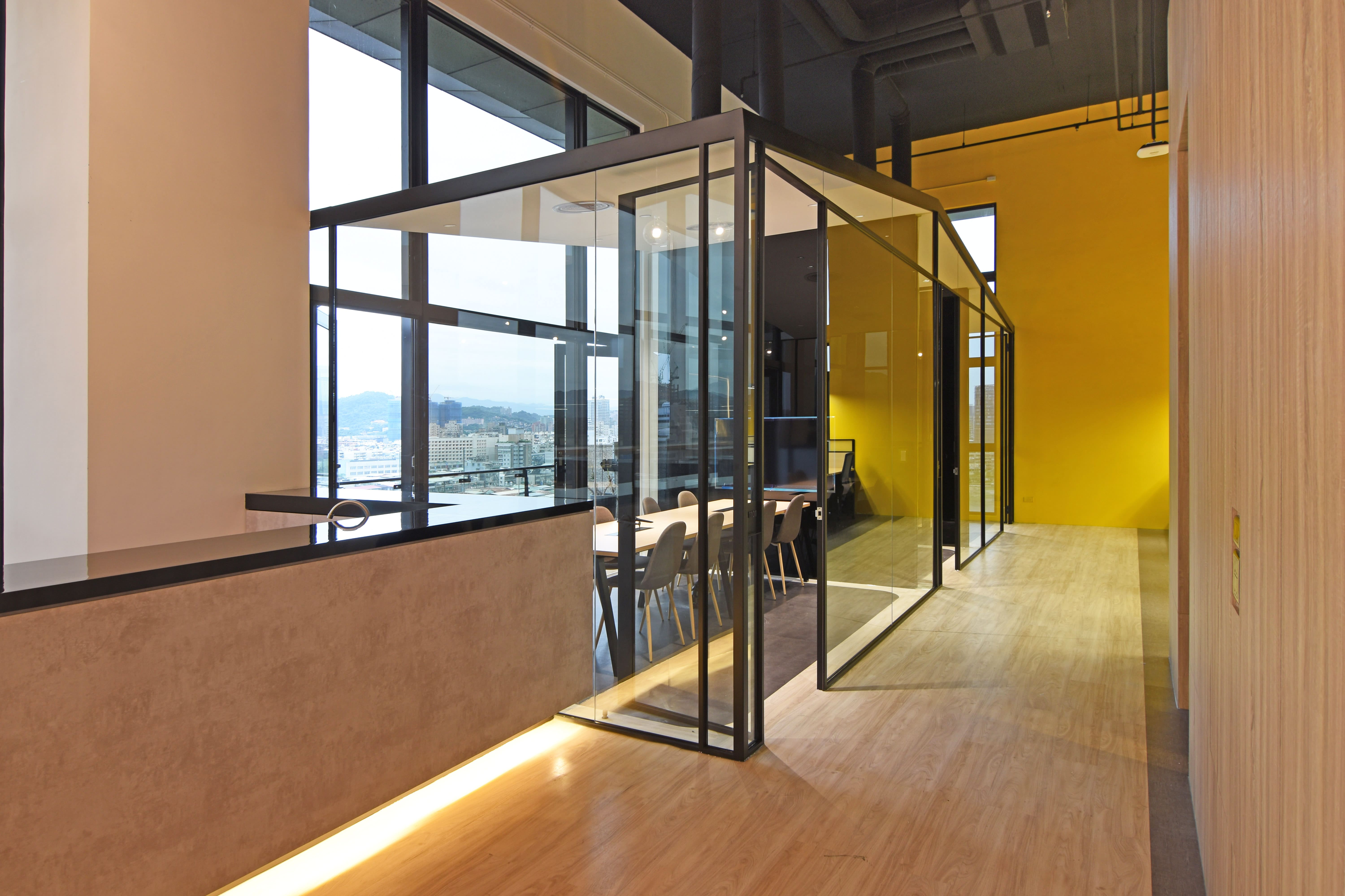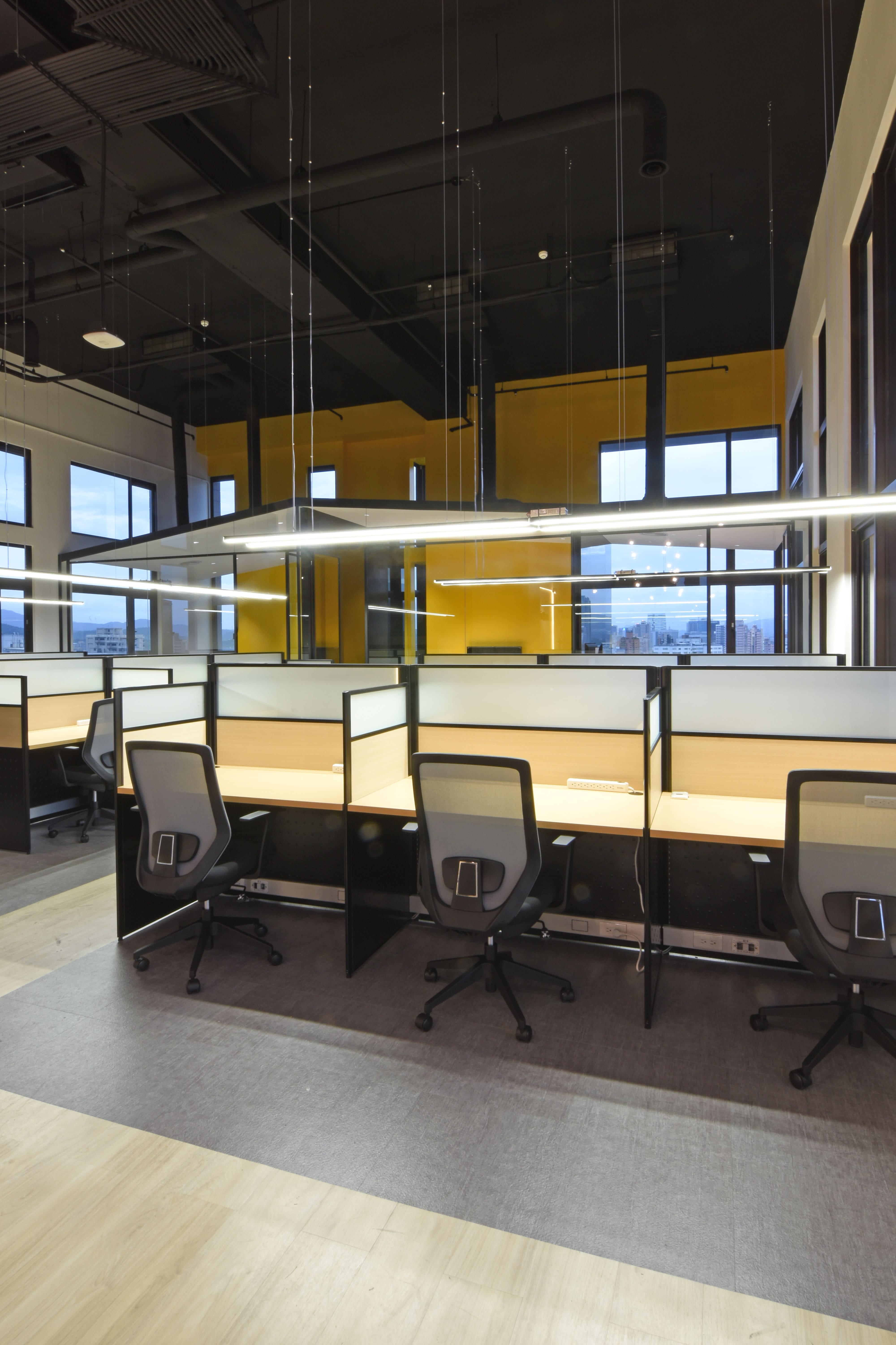 了解屋況與設計師的工業風風格後,在最短的時間與業主討論出最佳的OA方案。屏風的高低連結、搭配挑高空間與會議室的小房設計,線條感簡約不遮擋視線;落地窗前的高吧桌椅充分體現現代共享辦公形態,在工作時能隨時更換工作空間及調整狀態,同時擁有能放鬆思考的空間。