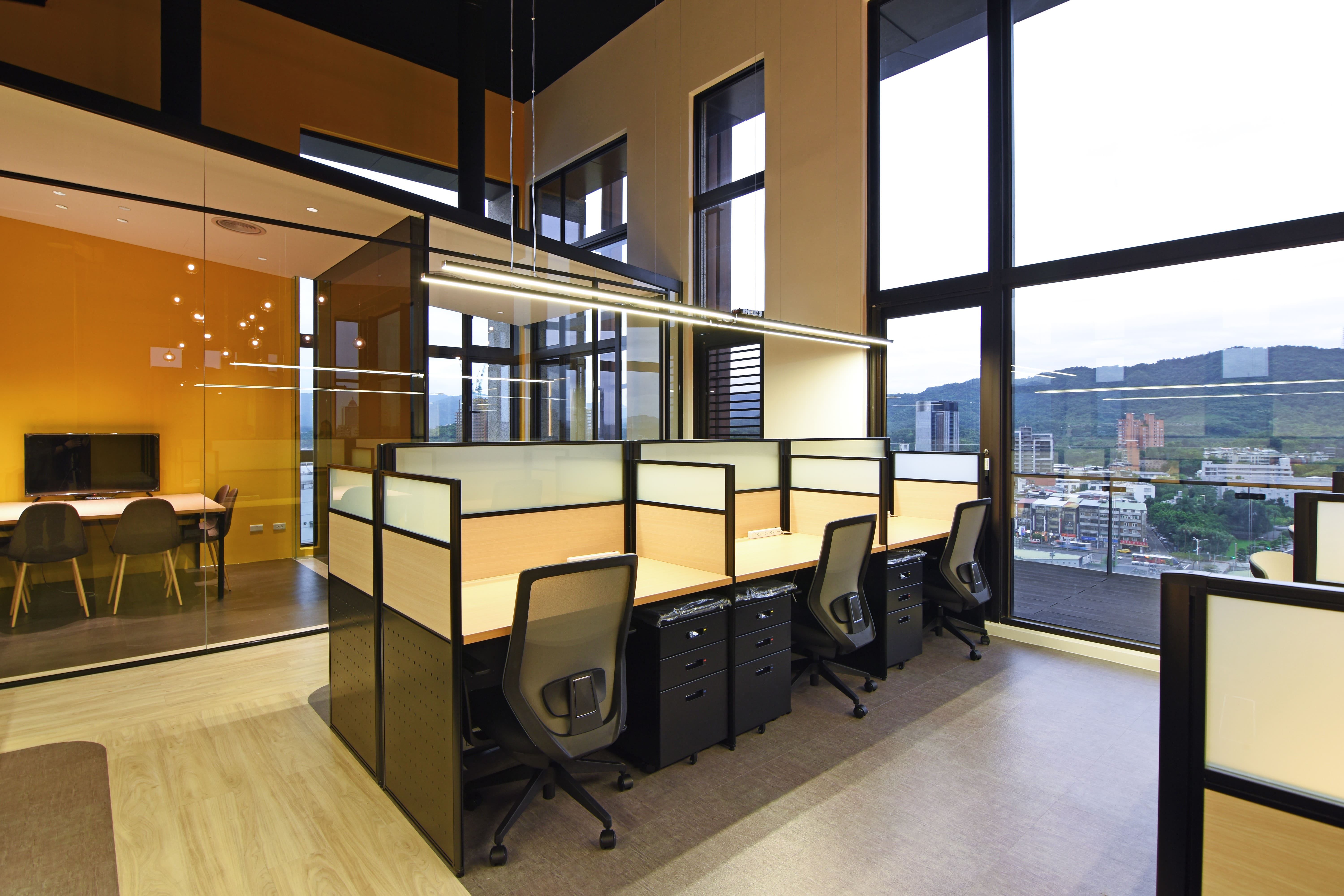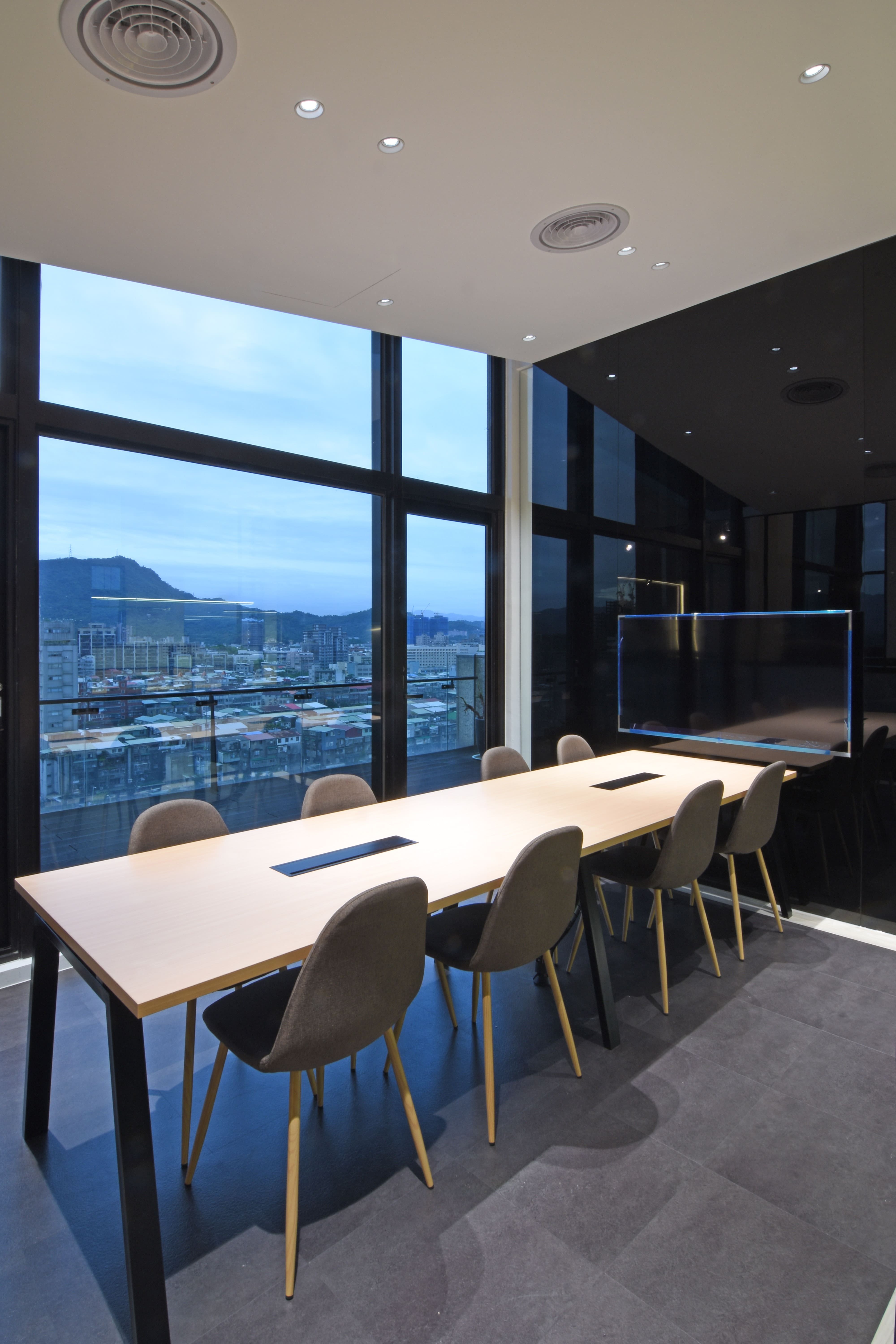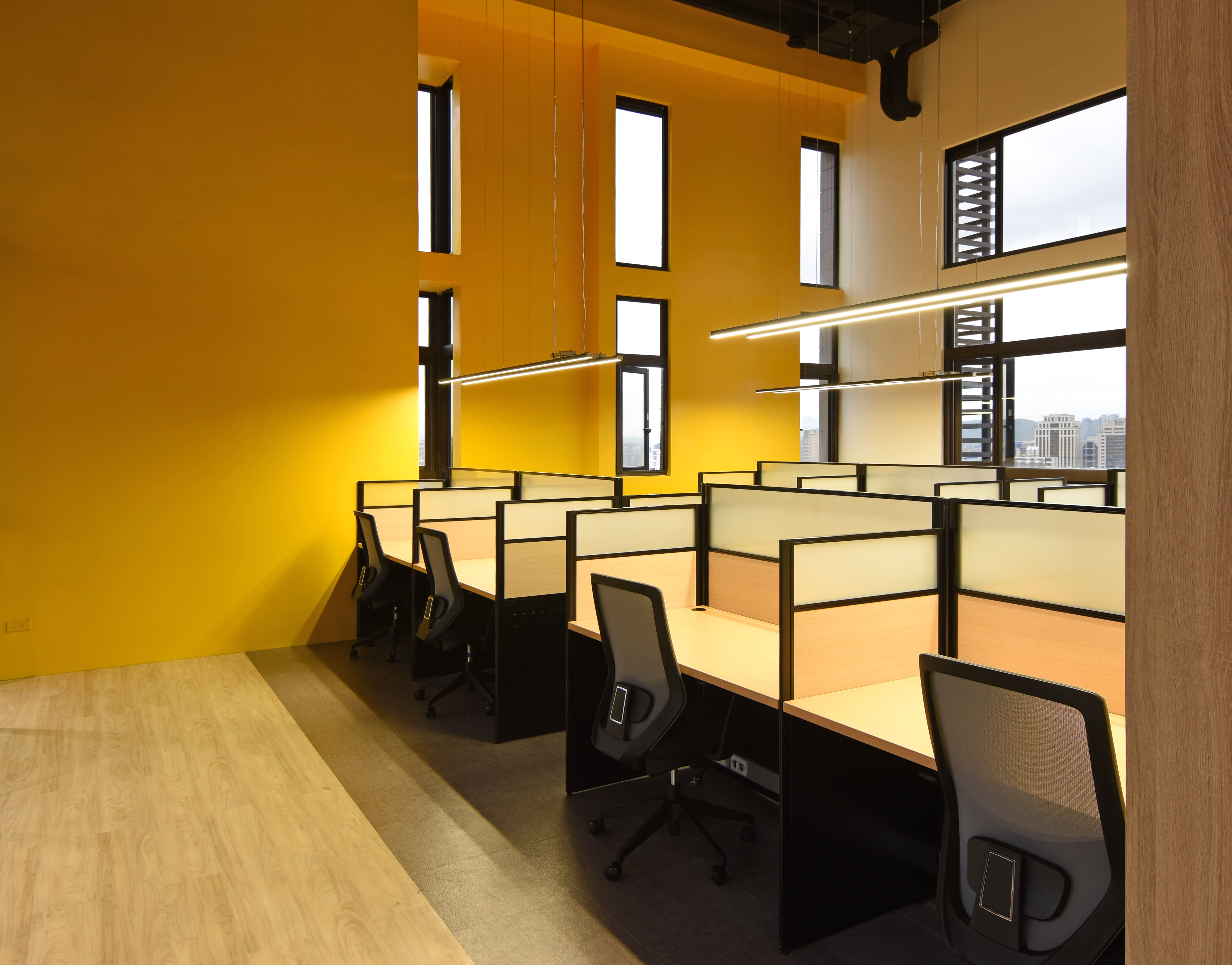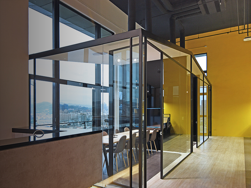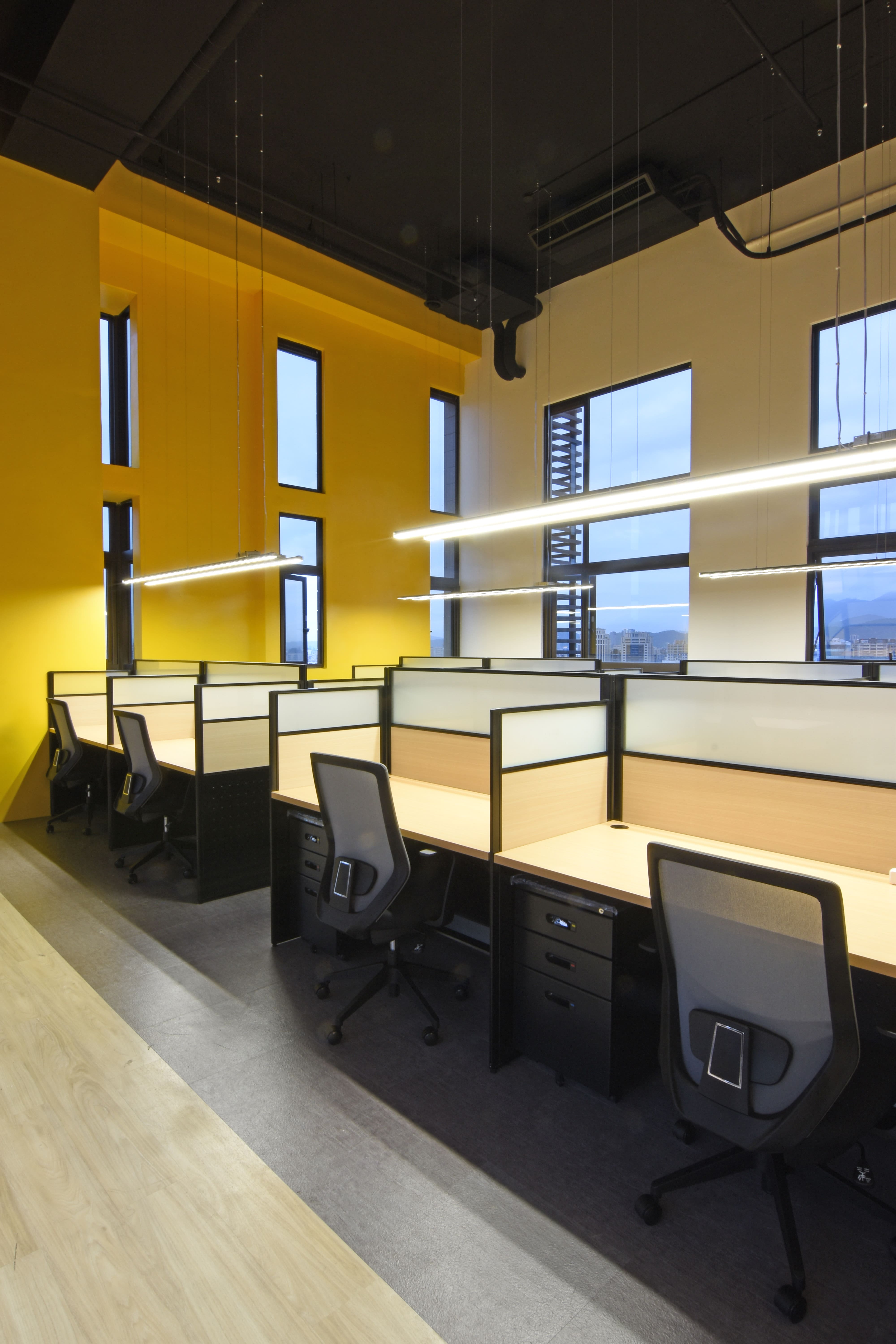 了解屋況與設計師的工業風風格後,在最短的時間與業主討論出最佳的OA方案。屏風的高低連結、搭配挑高空間與會議室的小房設計,線條感簡約不遮擋視線;落地窗前的高吧桌椅充分體現現代共享辦公形態,在工作時能隨時更換工作空間及調整狀態,同時擁有能放鬆思考的空間。