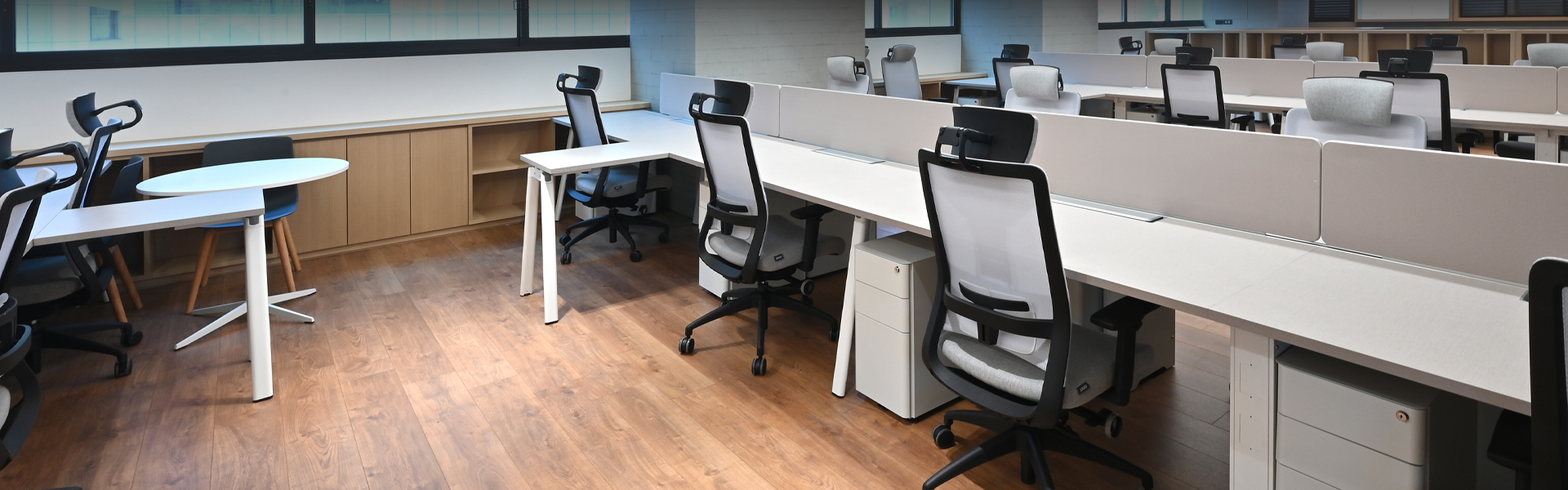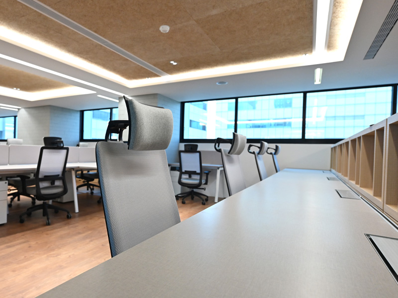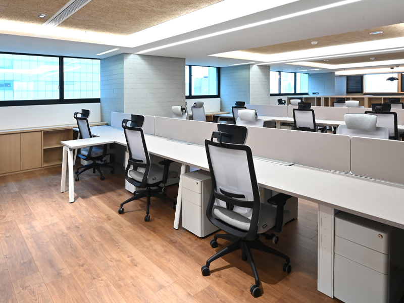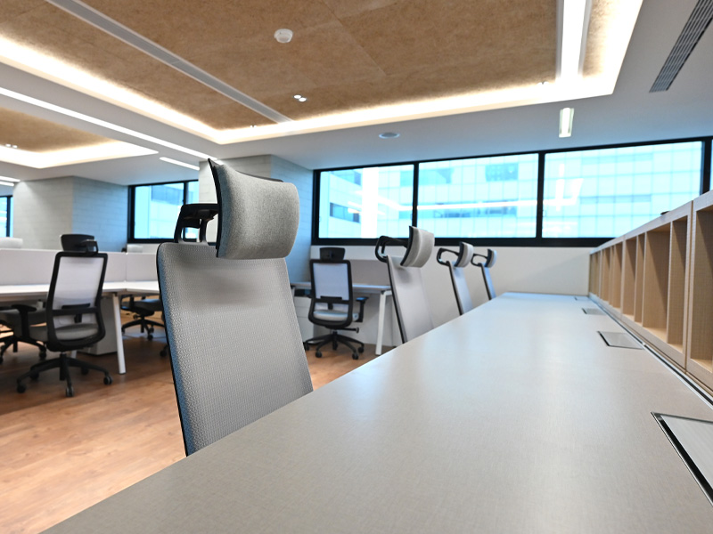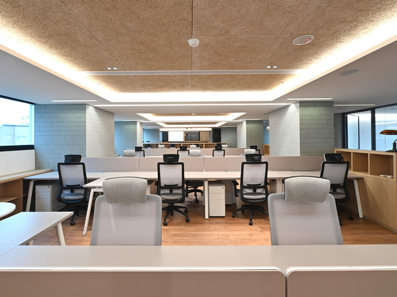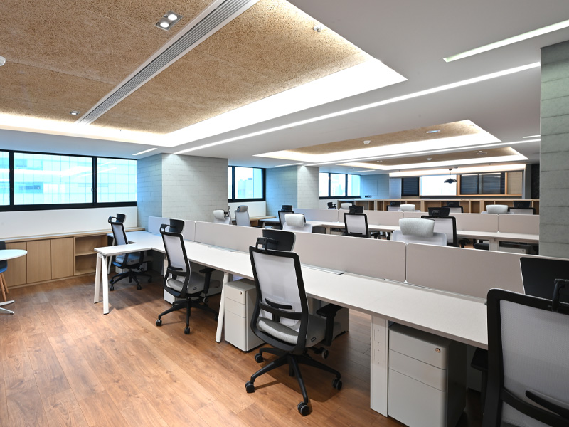 簡約的色系搭配,讓整體明亮有精神,適度增加木質調的地板及牆壁,打造穩健又有溫度的工作空間。