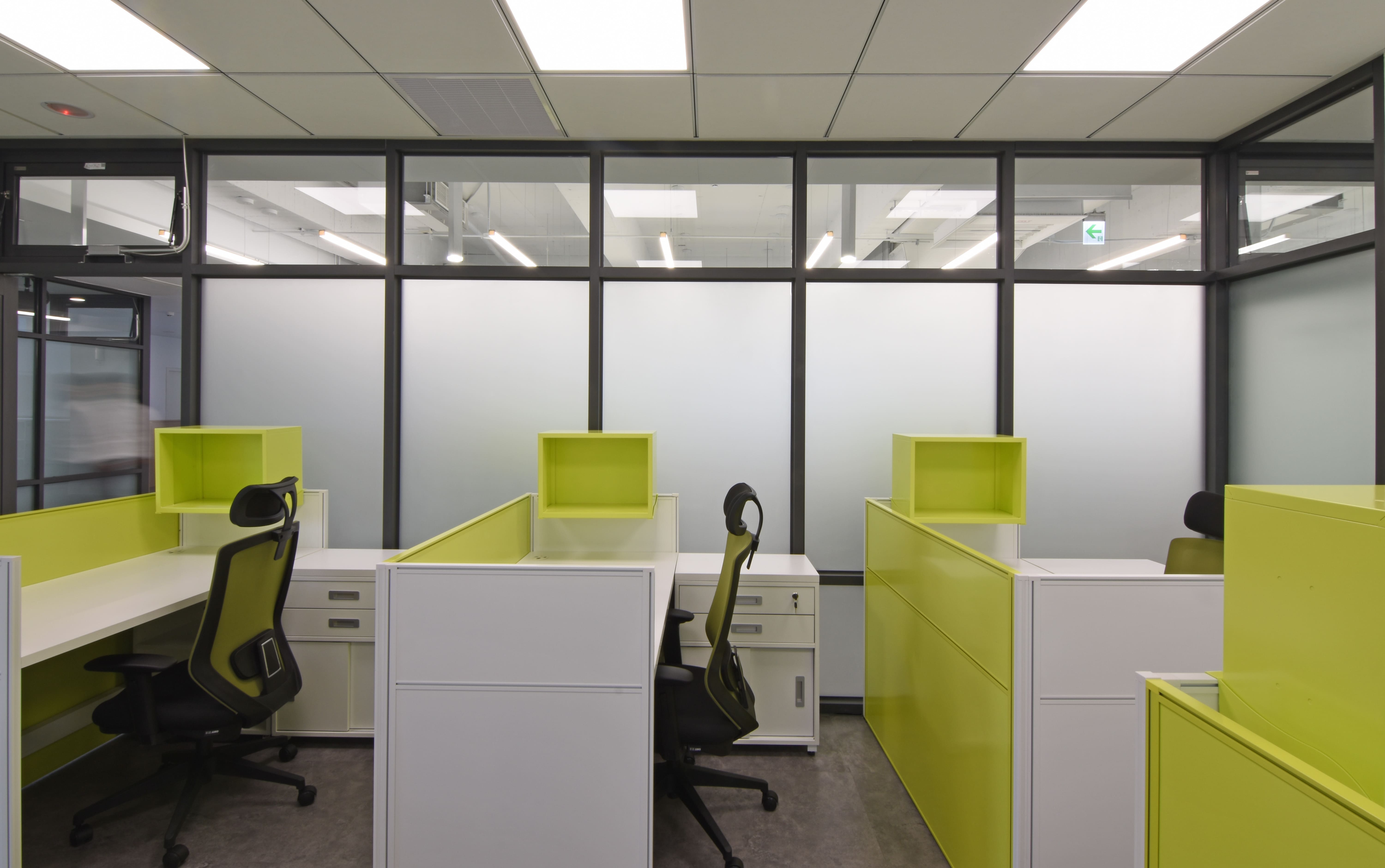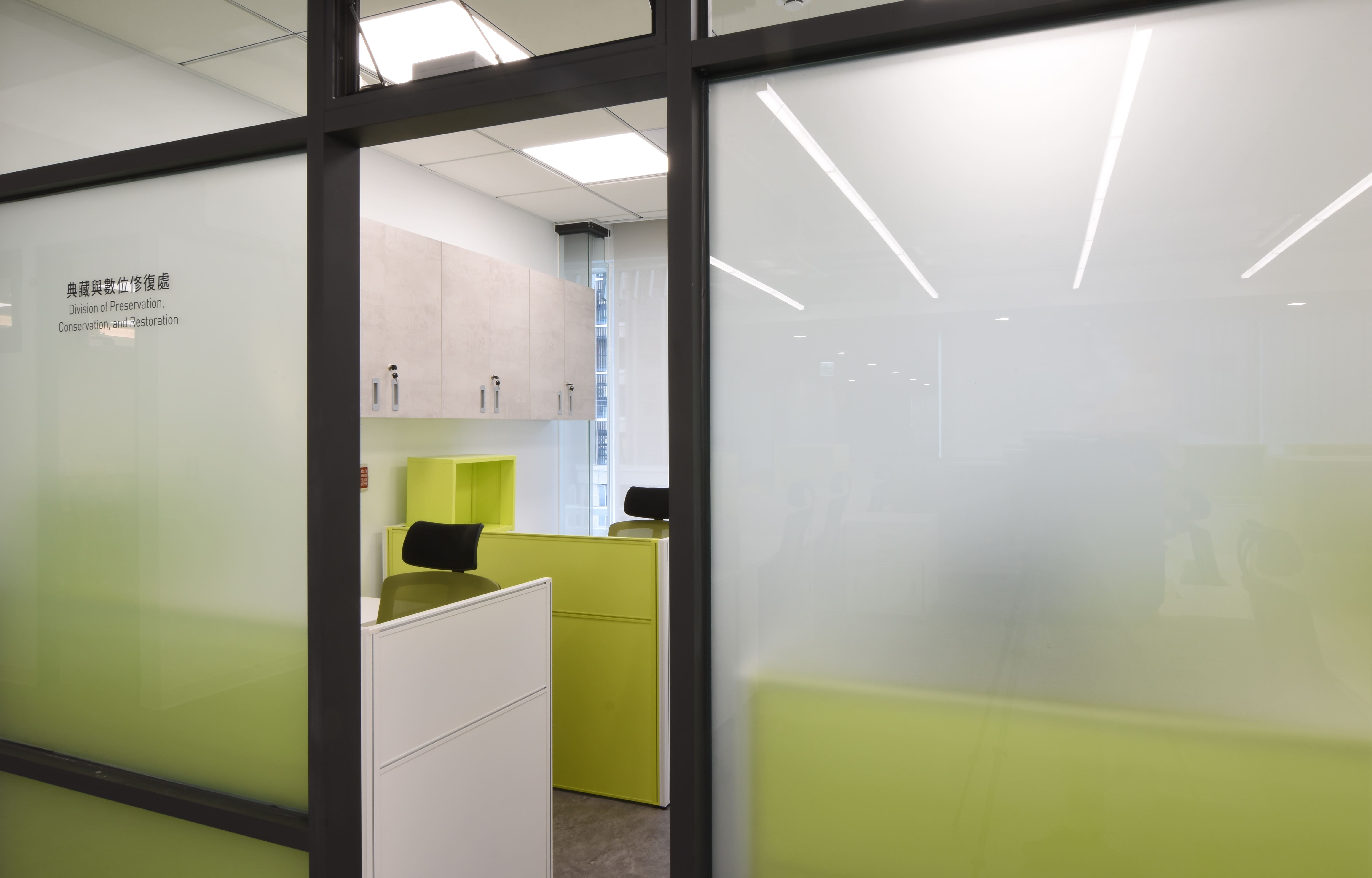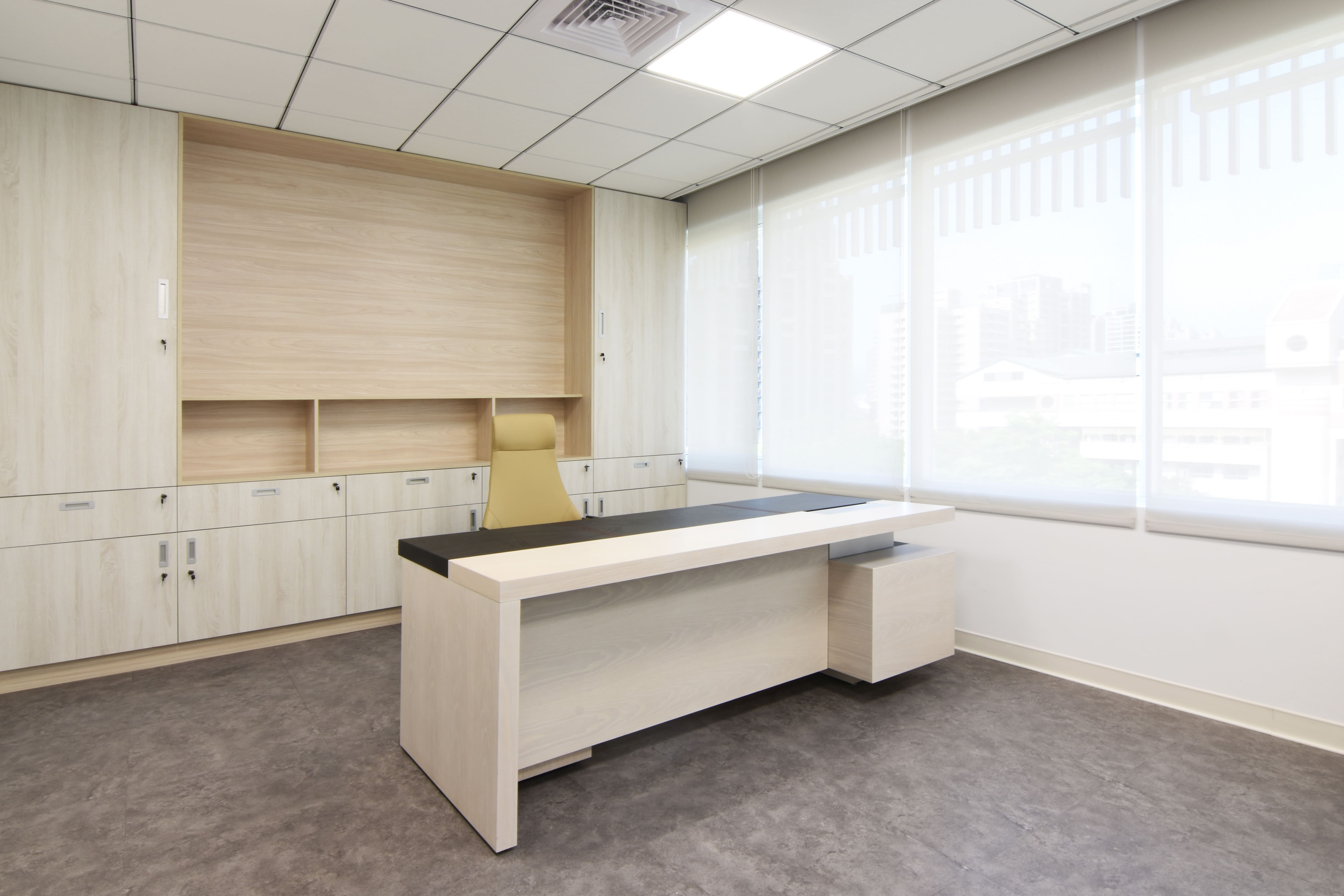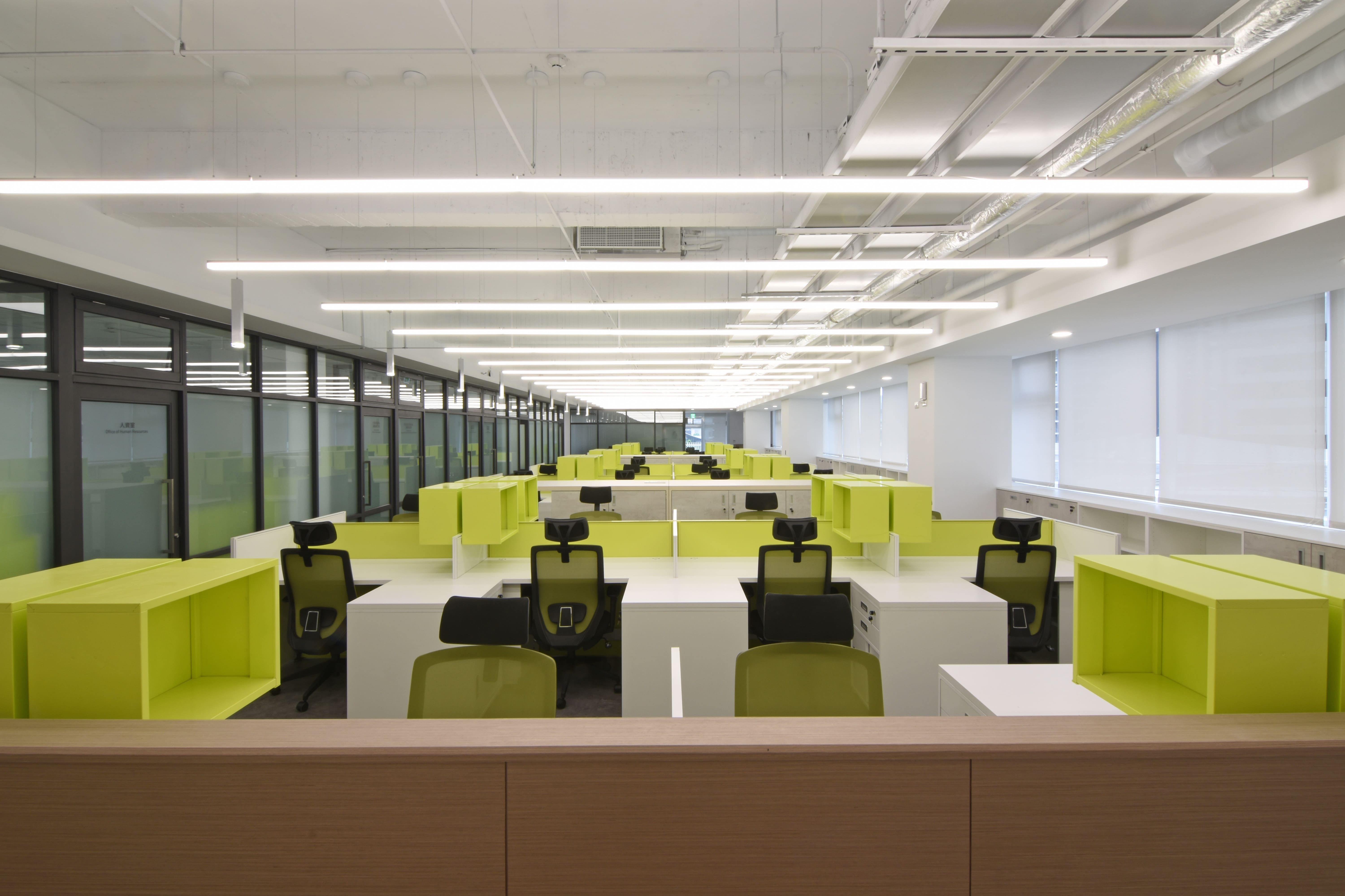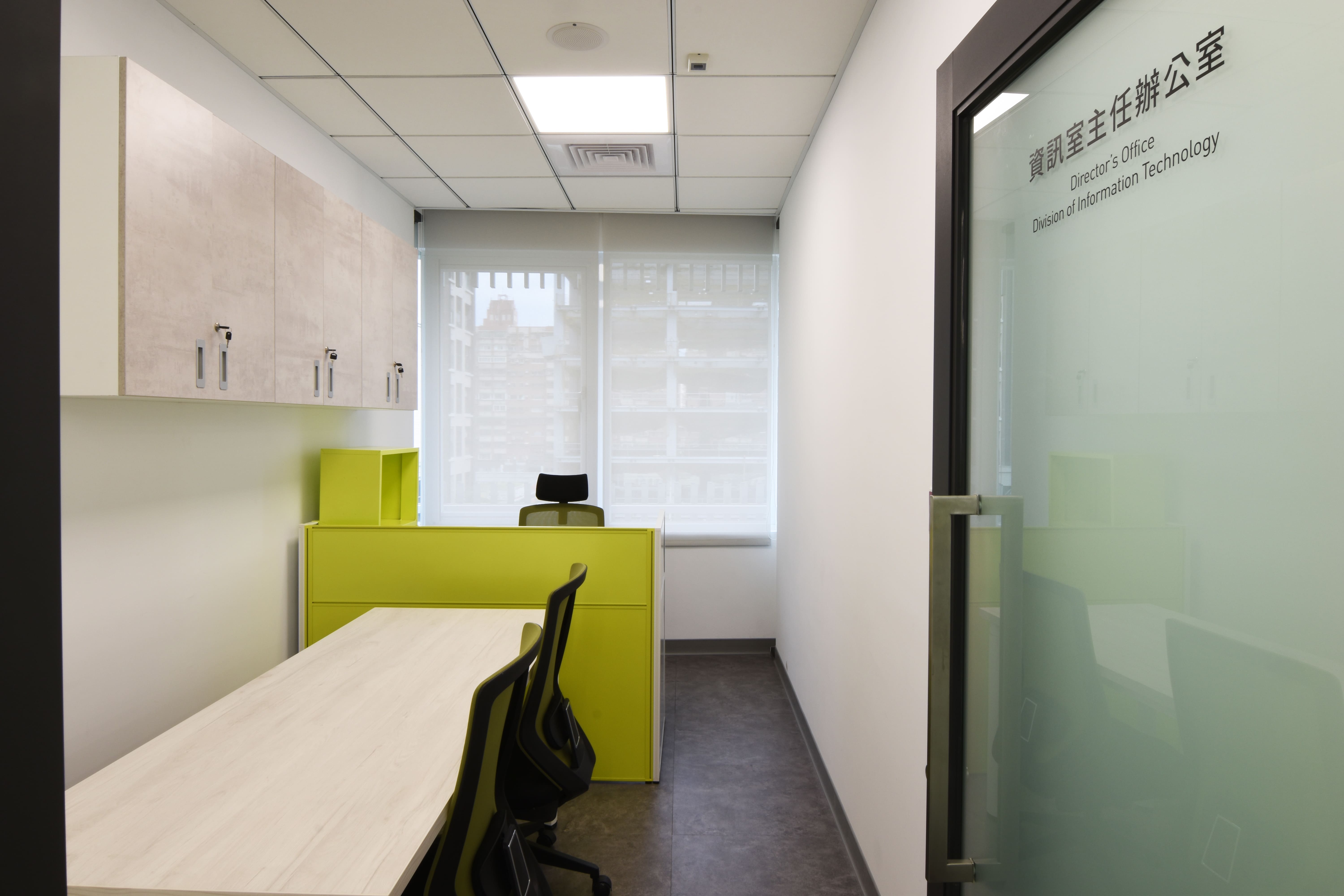 配合企業色打造客製化屏風工作站系統,另外搭配客製化吊櫃除了靈活運用辦公場域,更增加單位收納空間。以白色為主調,企業色及木紋色為輔,營造寬敞明亮的辦公氛圍。主管辦公室配置白木紋色的