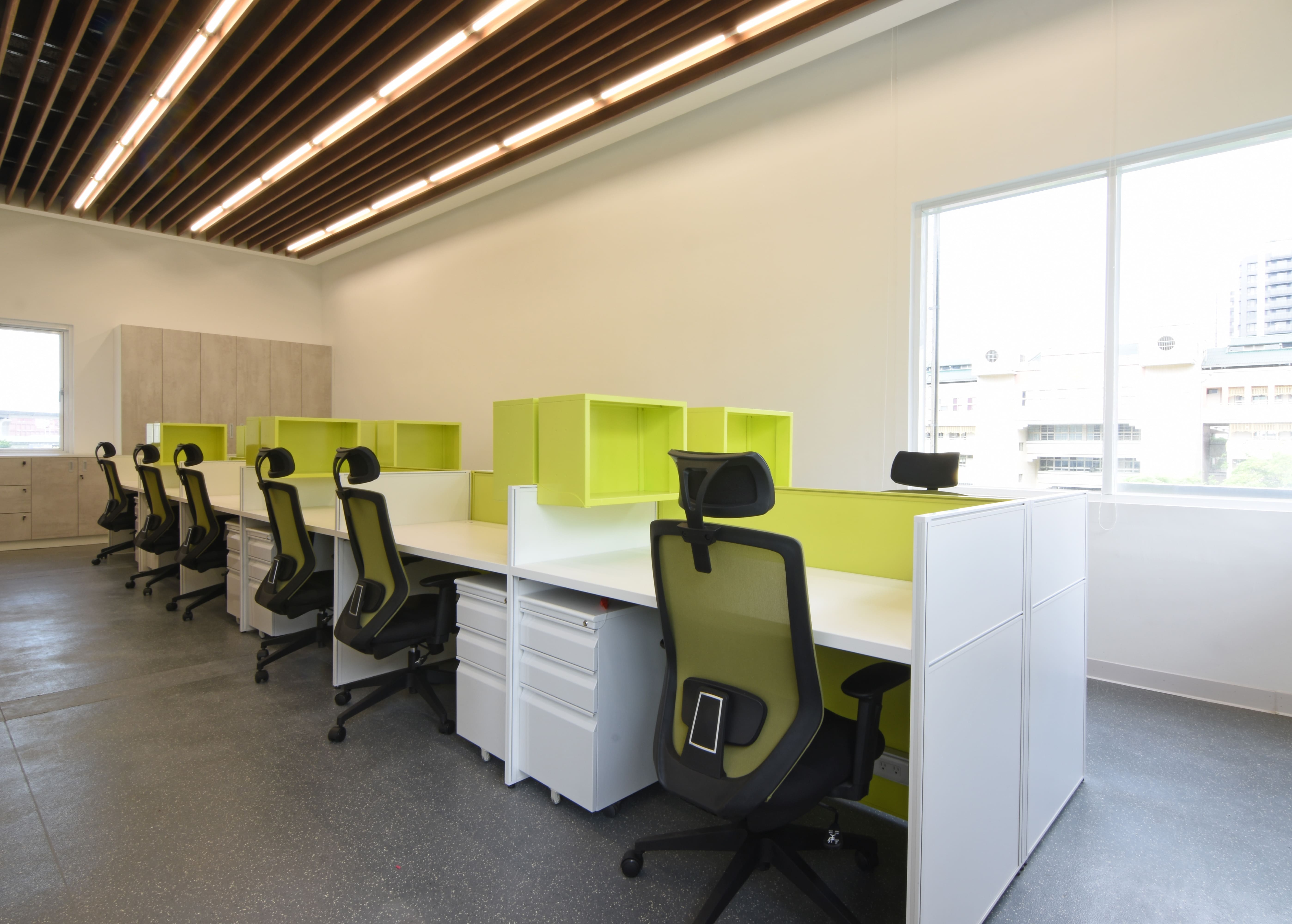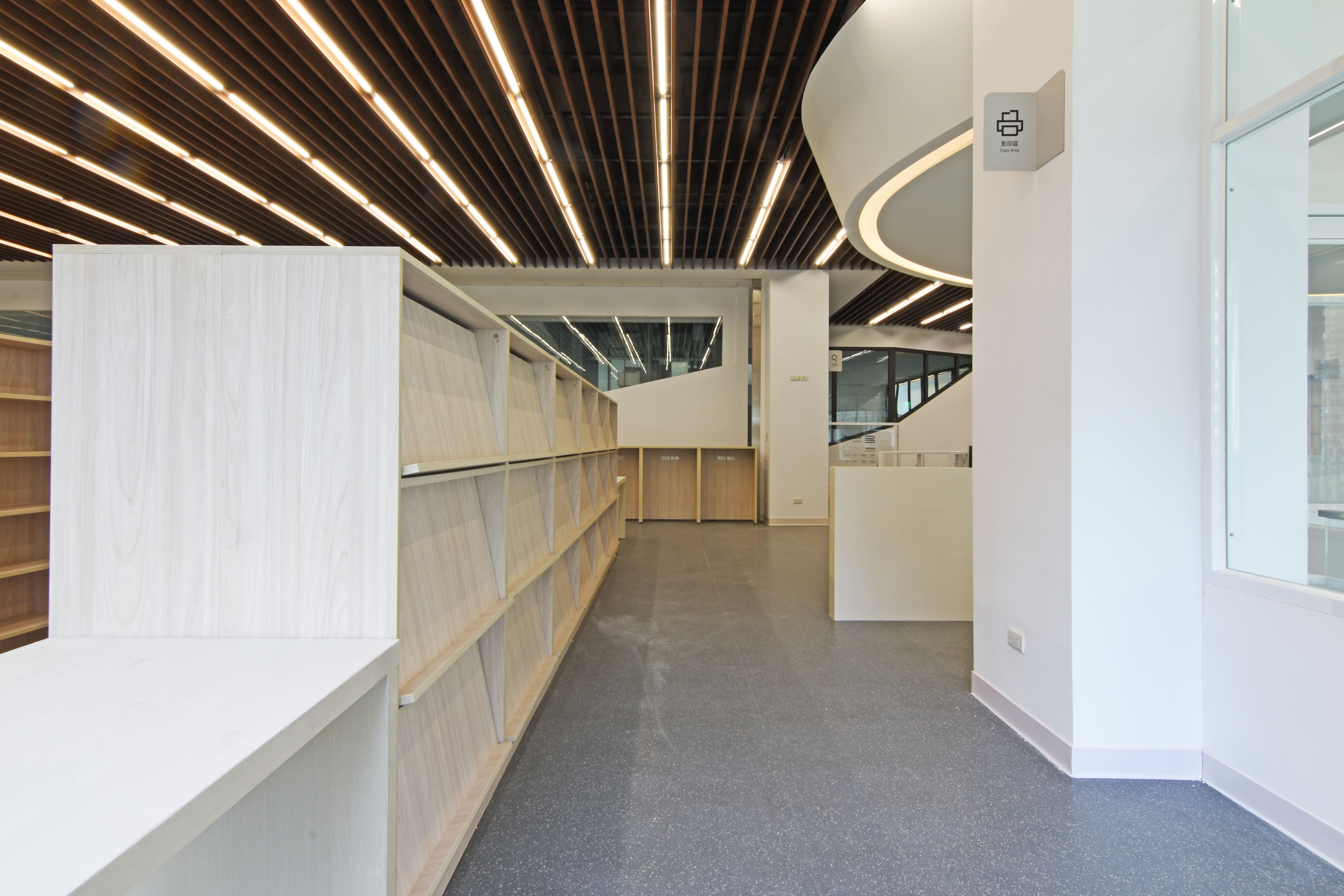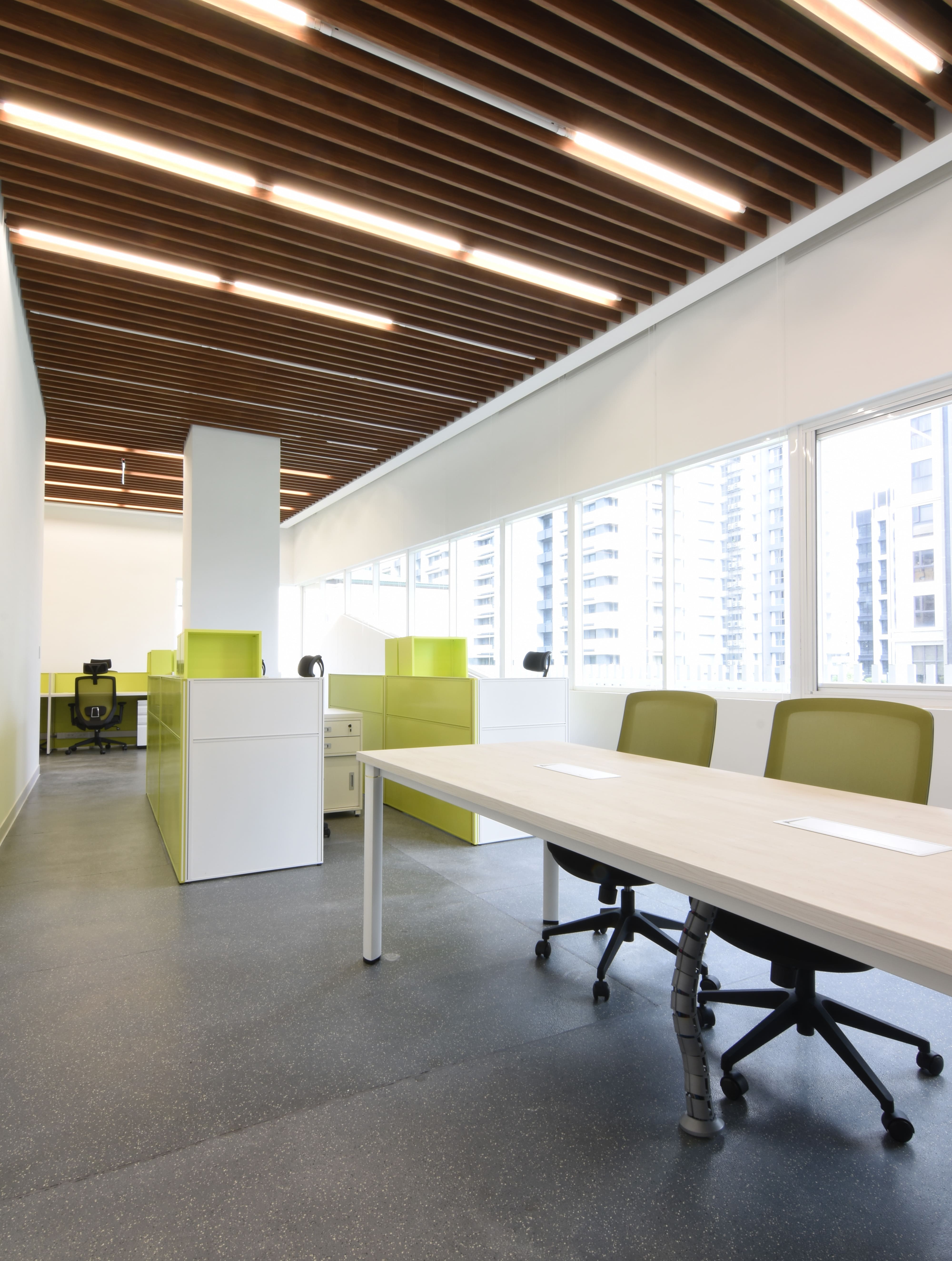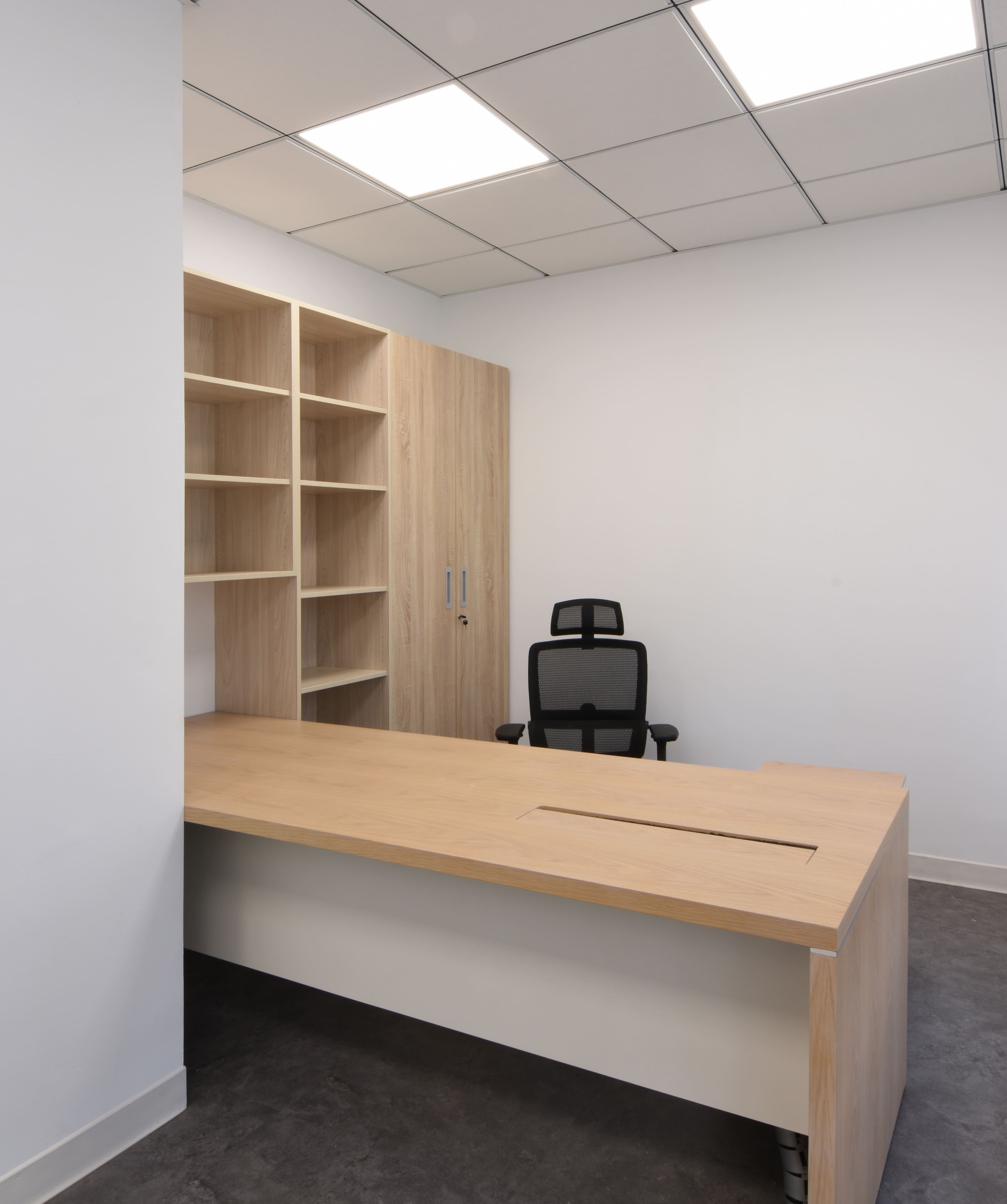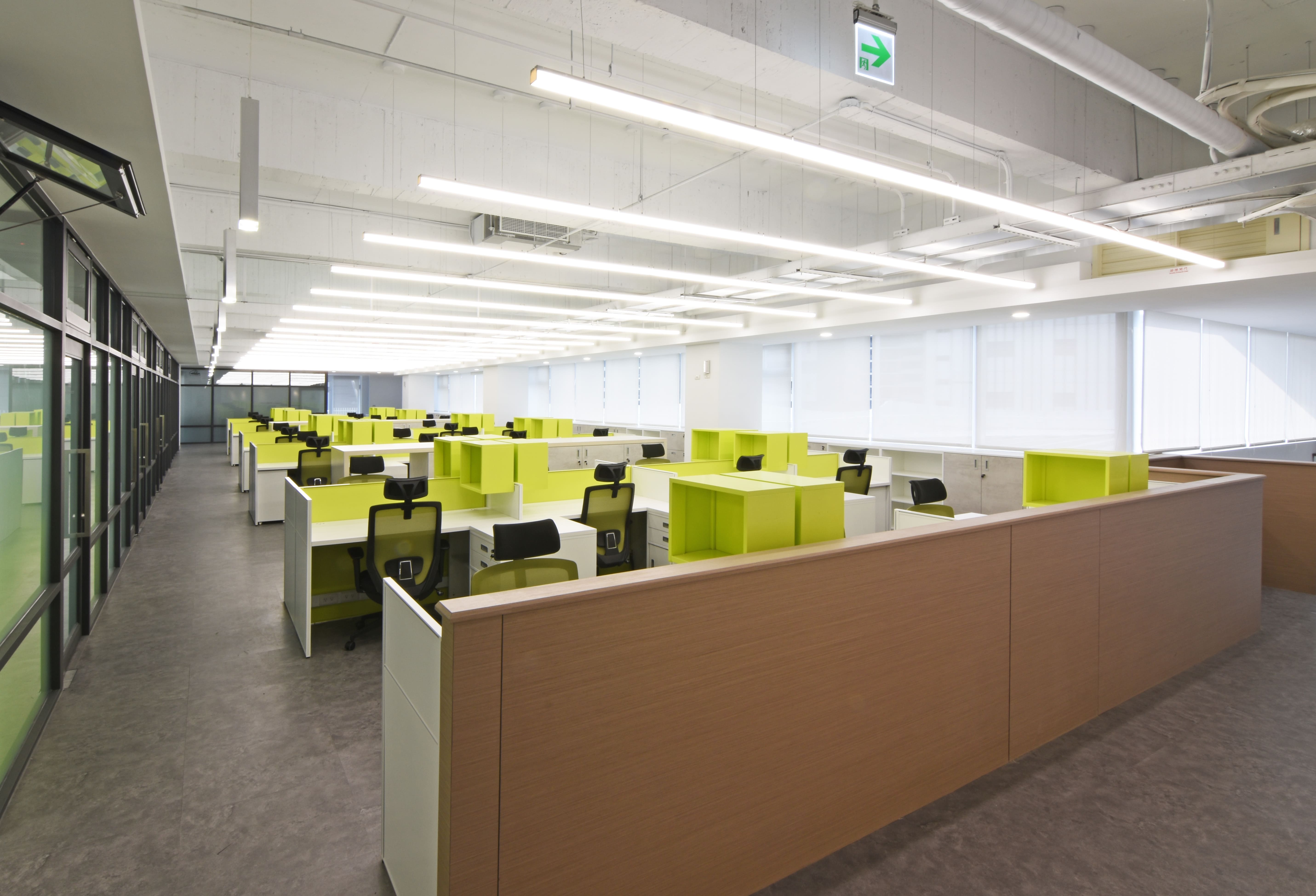 配合企業色打造客製化屏風工作站系統,另外搭配客製化吊櫃除了靈活運用辦公場域,更增加單位收納空間。以白色為主調,企業色及木紋色為輔,營造寬敞明亮的辦公氛圍。主管辦公室配置白木紋色的