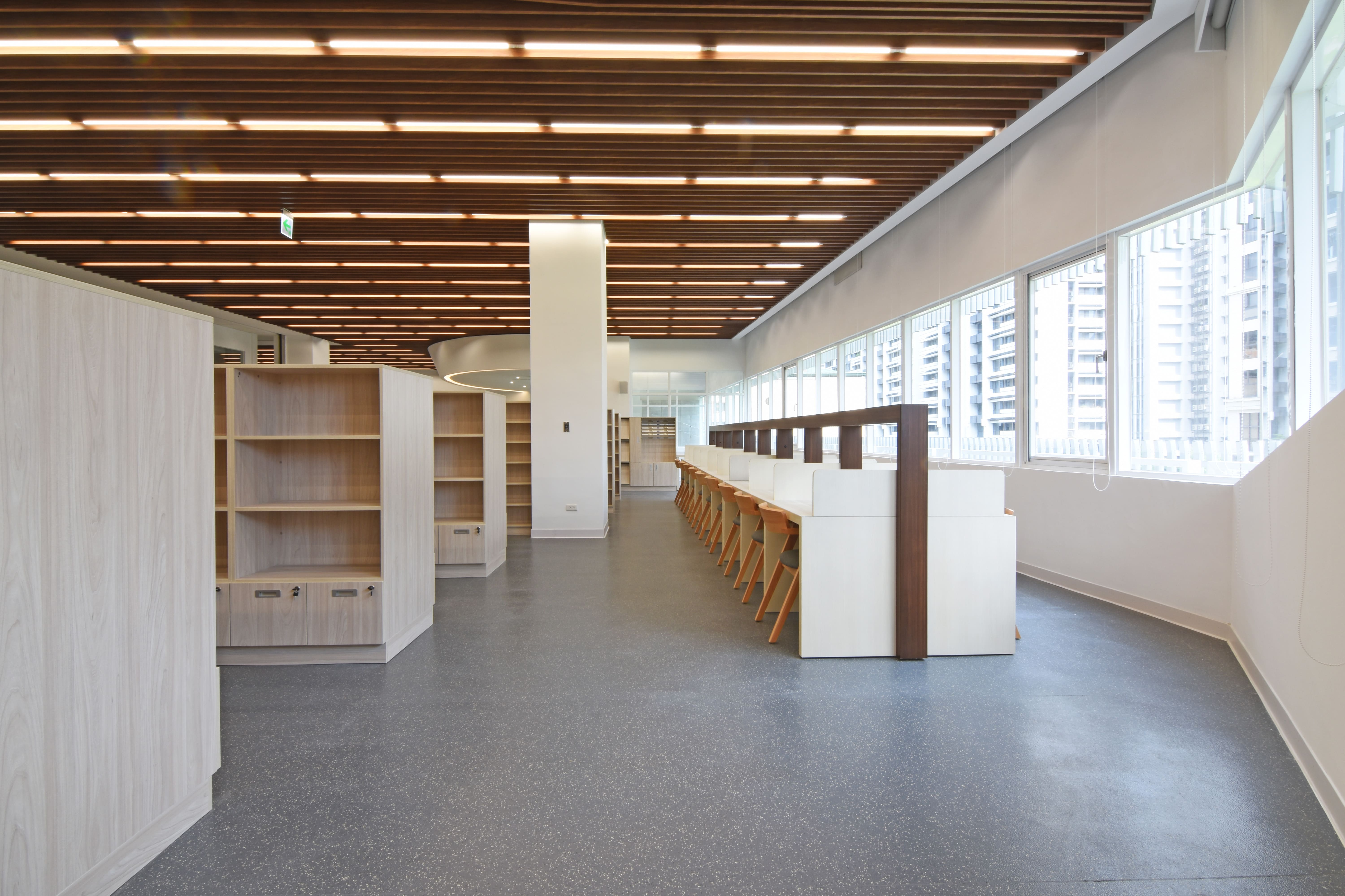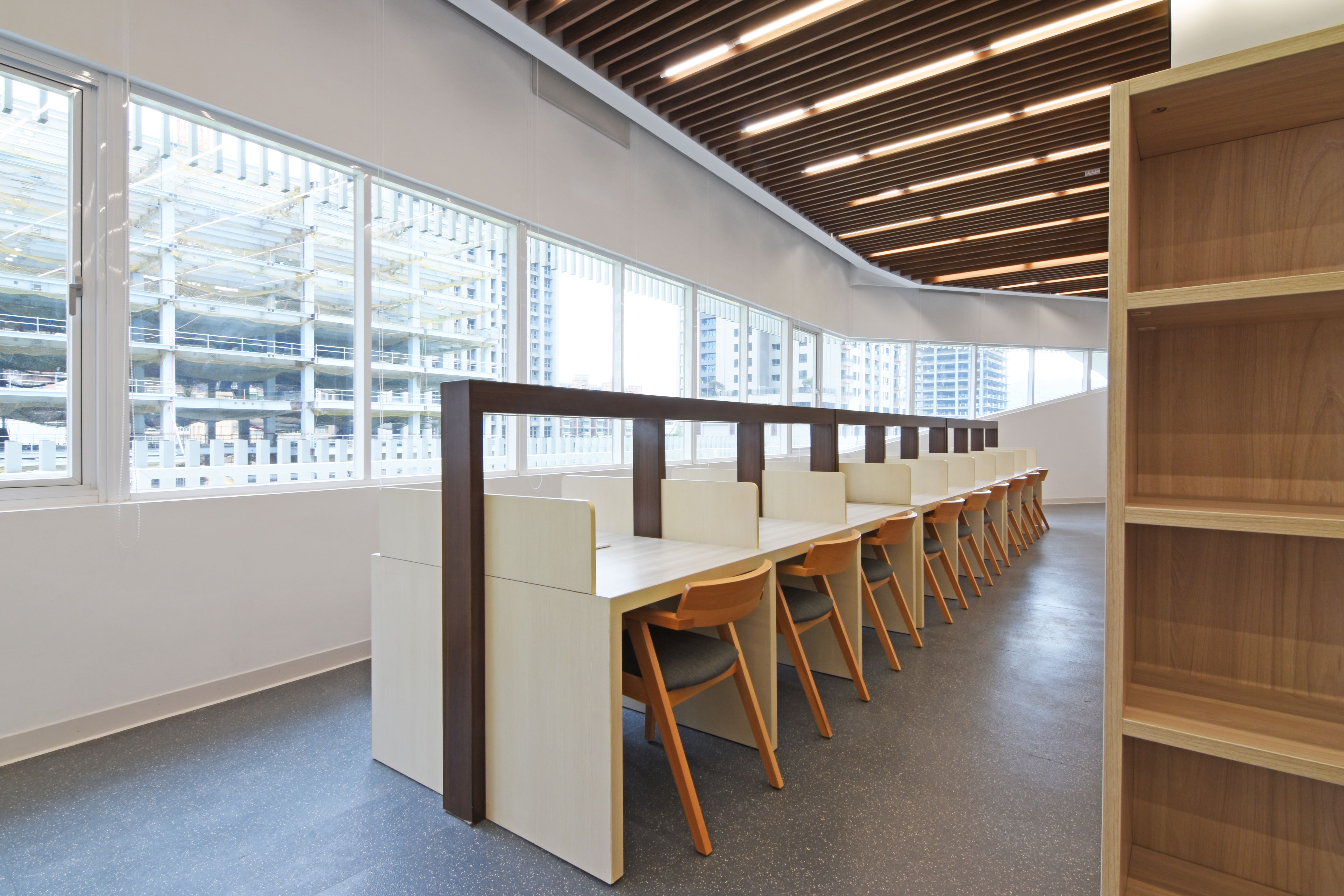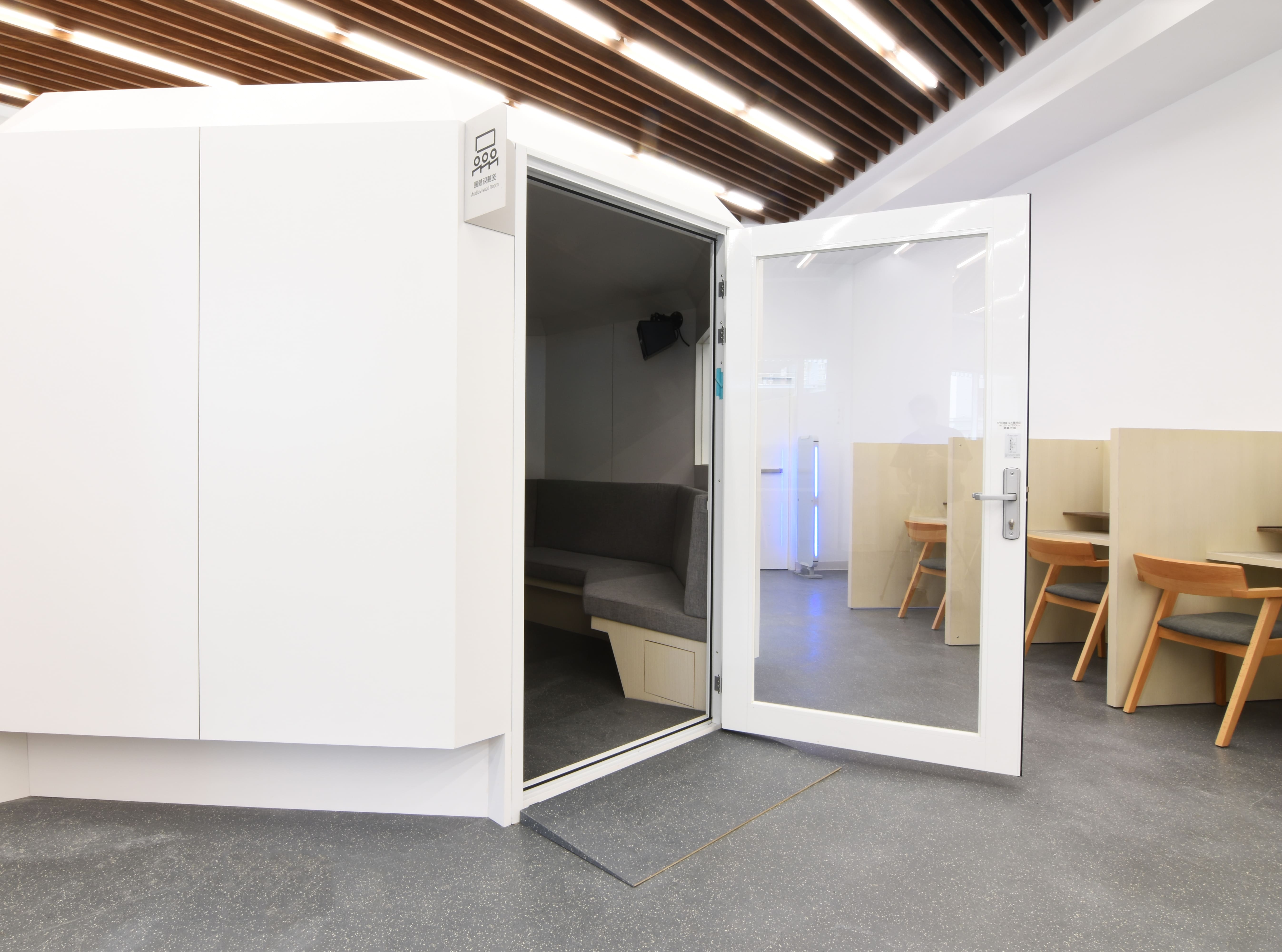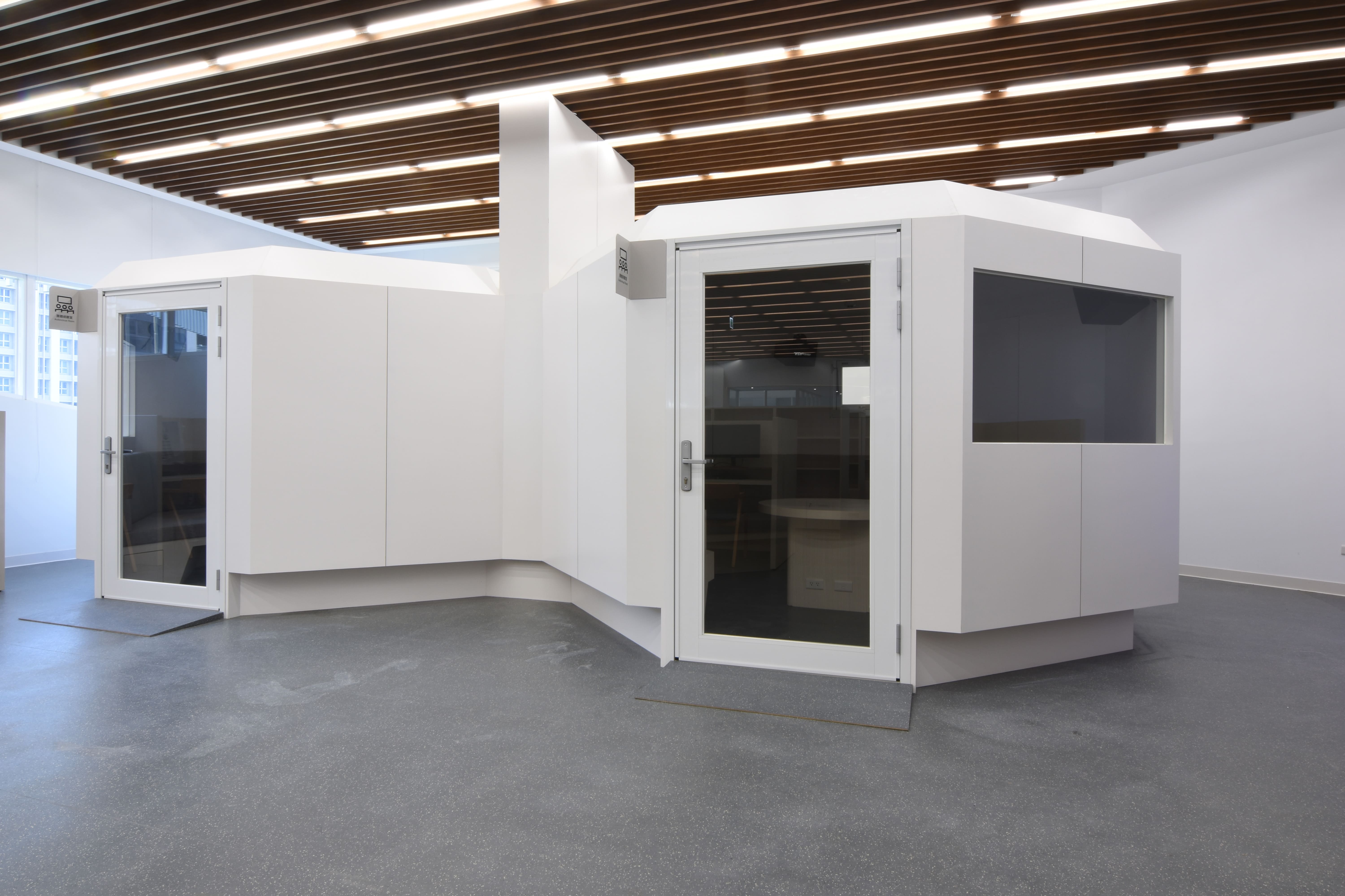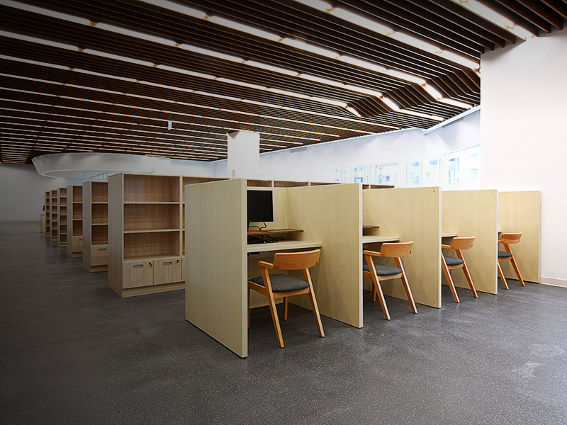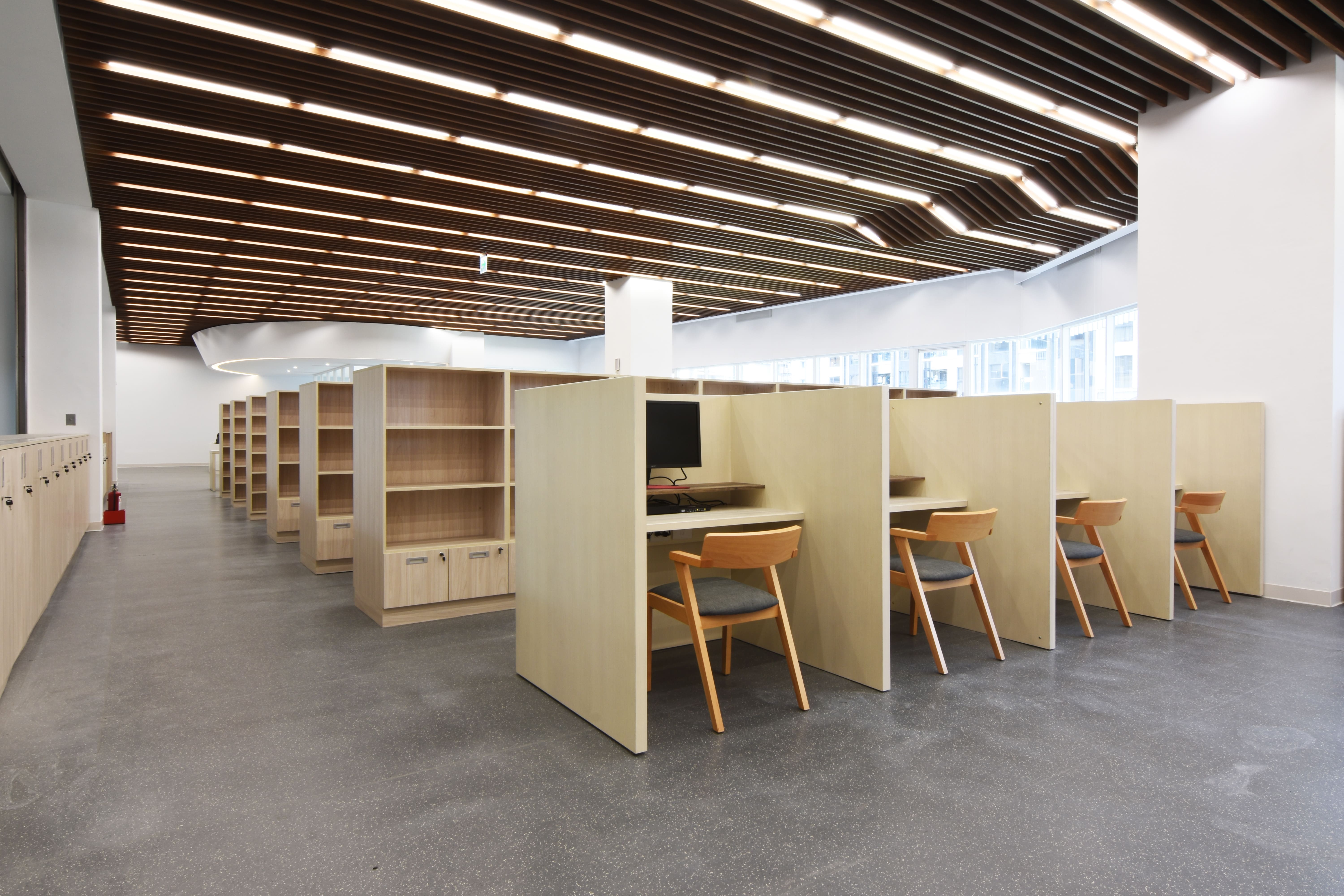 配合企業色打造客製化屏風工作站系統,另外搭配客製化吊櫃除了靈活運用辦公場域,更增加單位收納空間。以白色為主調,企業色及木紋色為輔,營造寬敞明亮的辦公氛圍。主管辦公室配置白木紋色的